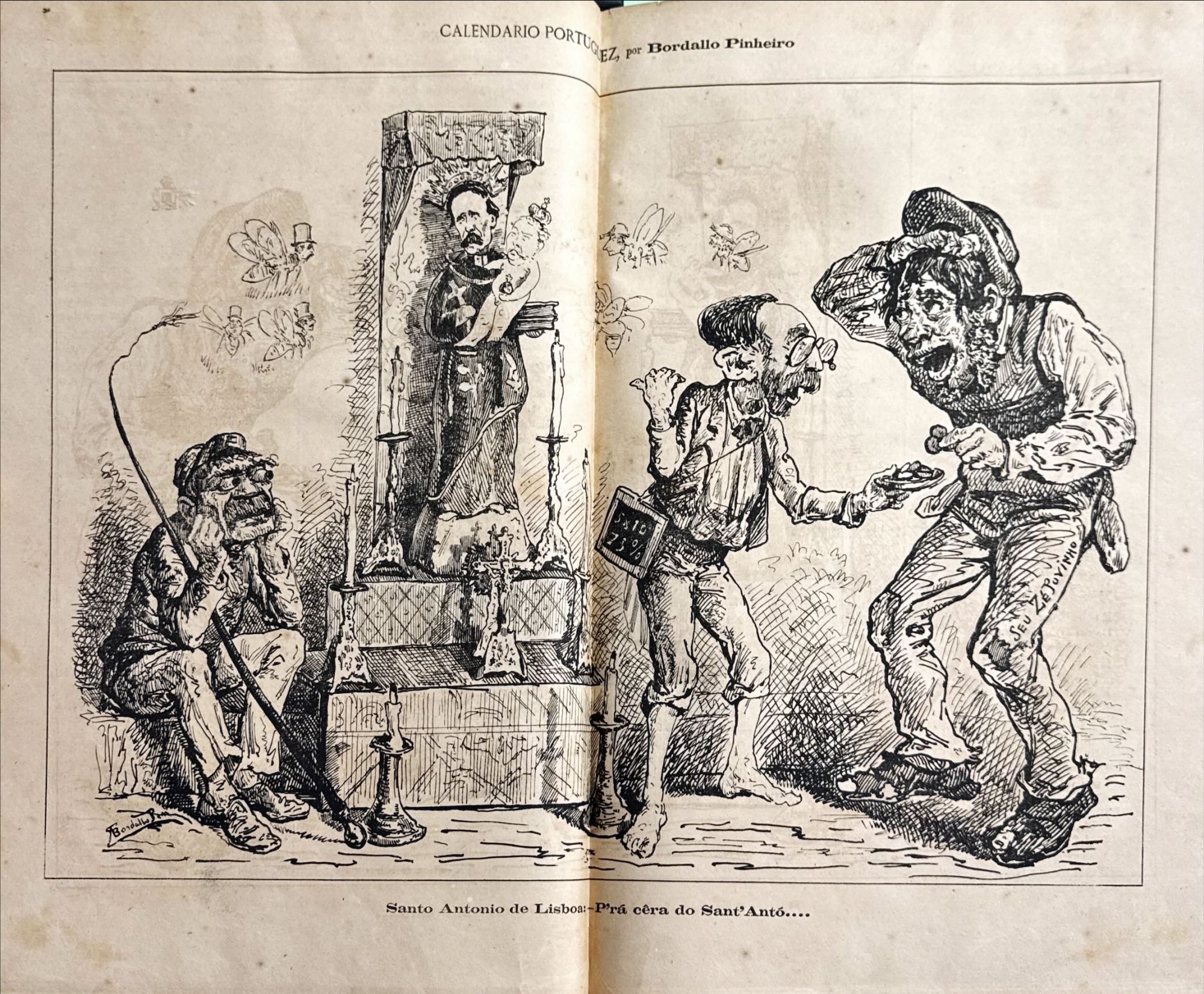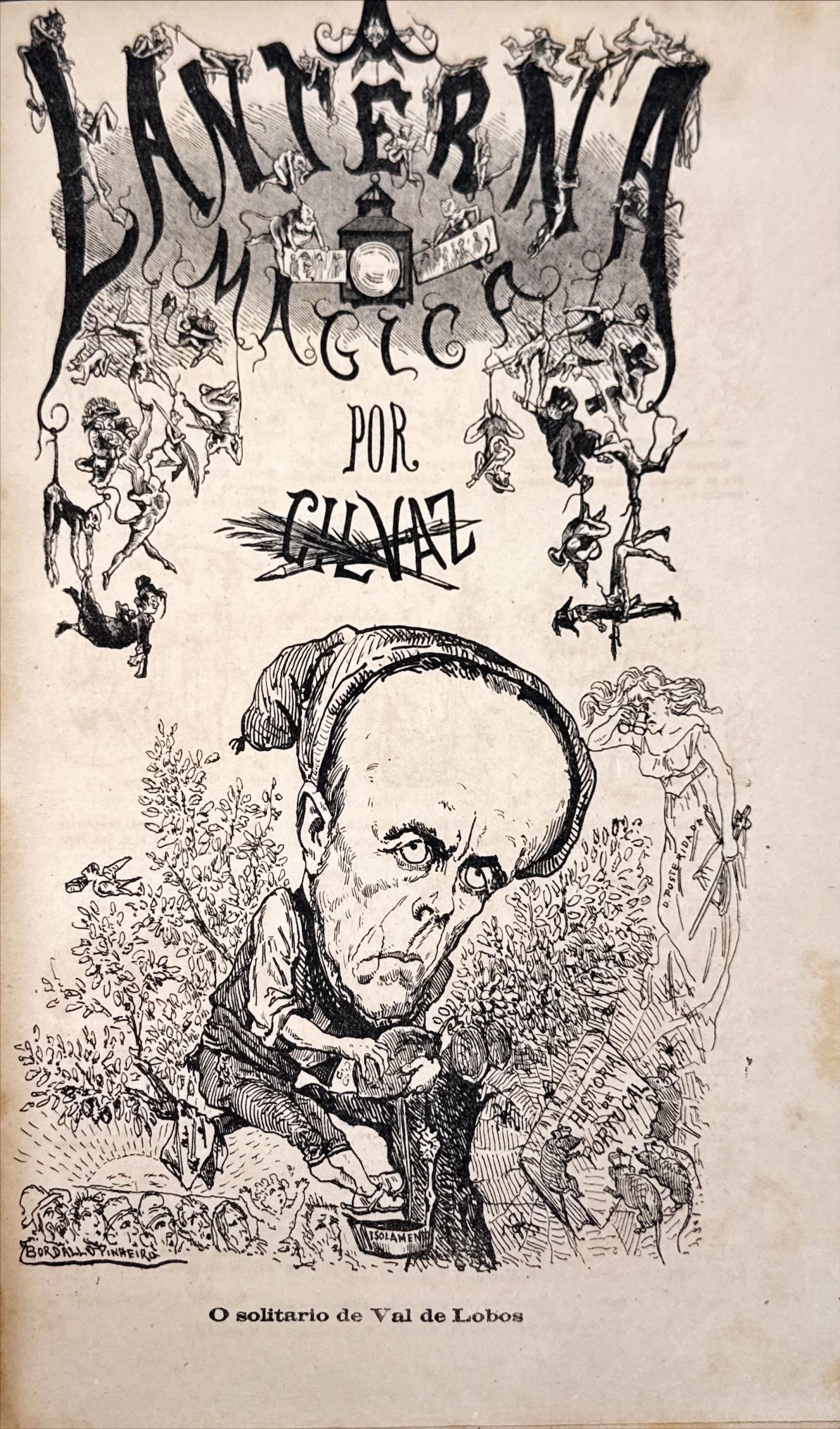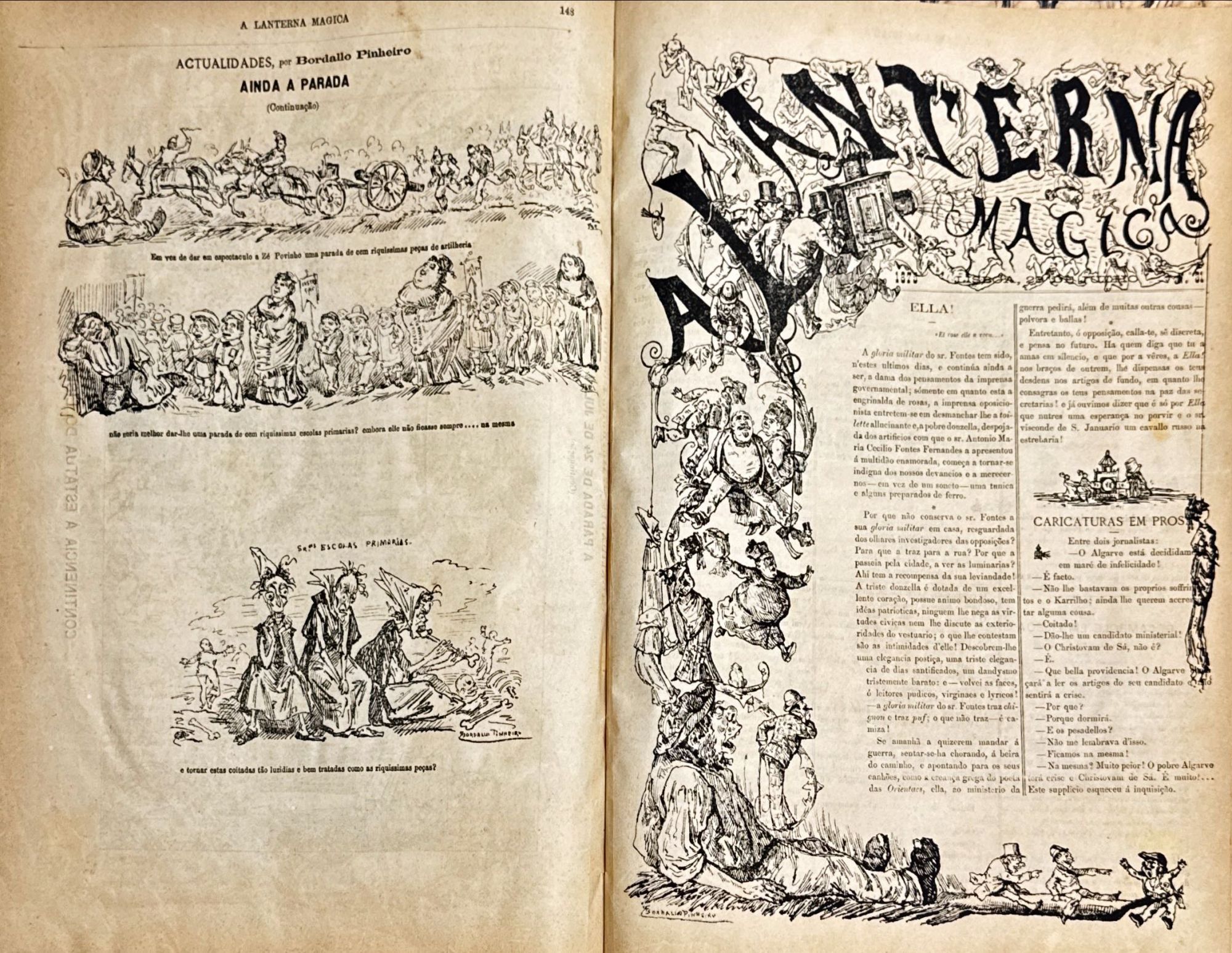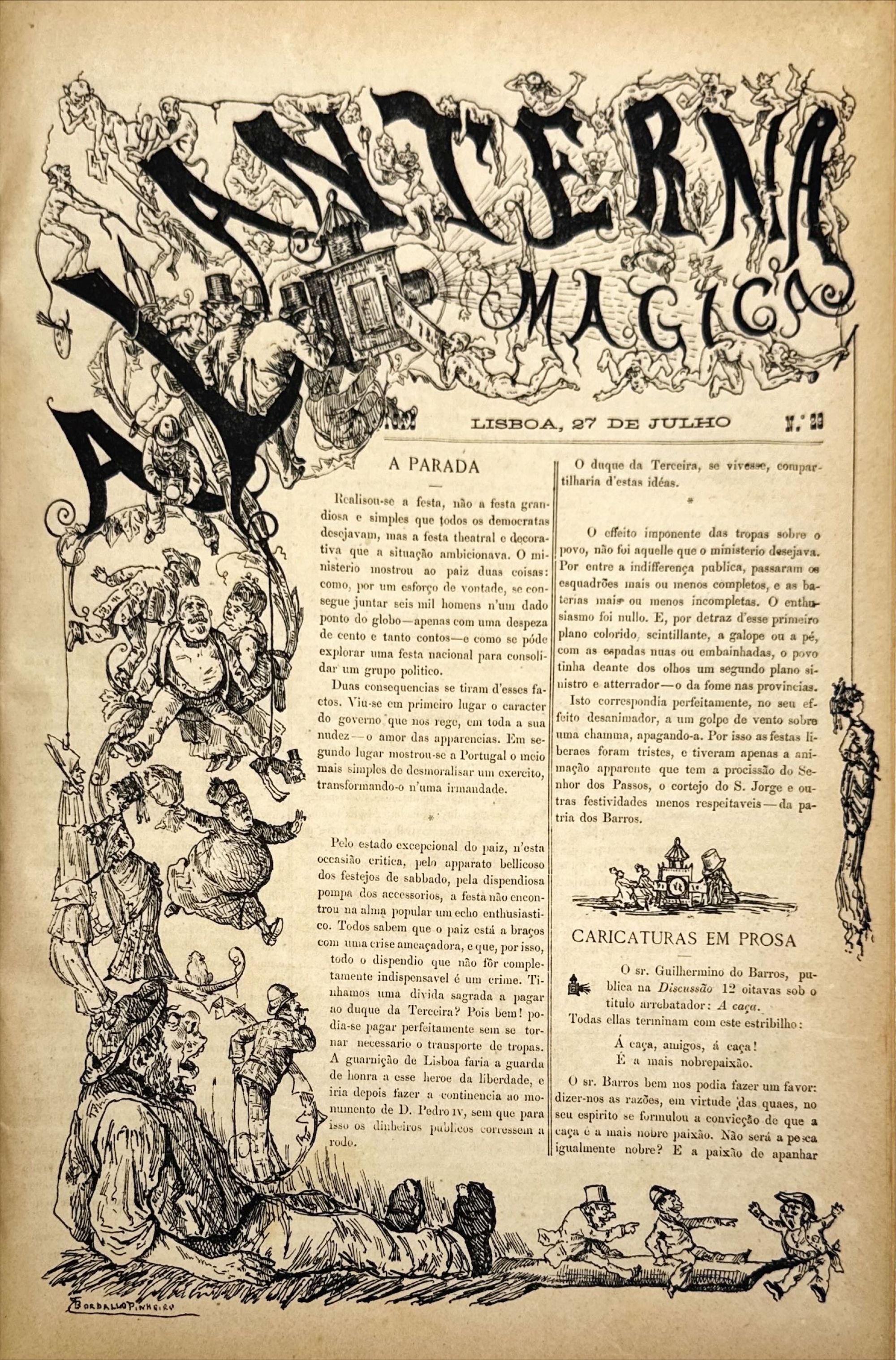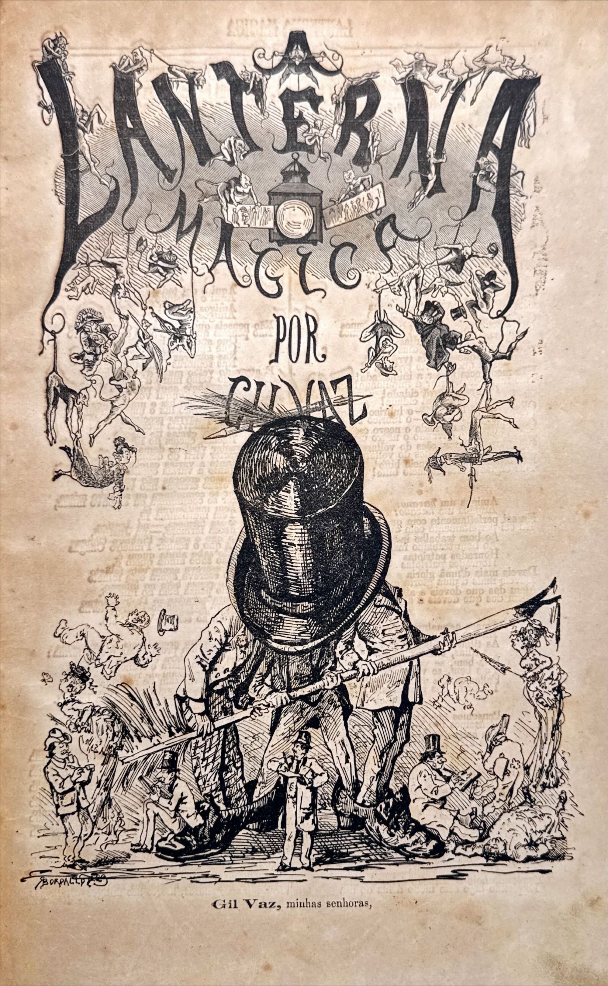 Coleção completa e difícil de reunir. Das mais raras de Rafael Bordalo Pinheiro, publicada, juntamente com Guilherme de Azevedo e Guerra Junqueiro, que se ocultavam sob o pseudónimo de "Gil Vaz". Conta ainda com outros colaboradores literários e artísticos: Luís de Andrade, Manuel de Macedo e Emílio Pimentel. Aqui surgiu pela primeira vez a figura do Zé Povinho representado em vários números. Algumas ilustrações são em página dupla. A partir do número 8 a revista teve um maior formato. Exemplar com algumas manchas de acidez, as pág. 58 e 59 com restauro devido aos anteriores números serem de menor dimensão e estarem na antiga encadernação e assim fazendo pressão nestas páginas que são s primeira de maior formato. Este formato devido a fineza das folhas, a pág. 87 com falta de pedaço de papel na margem e a pág. 157 com um fino rasgão que não afeta o texto. Em geral bom exemplar para os poucos que temos visto no mercado.