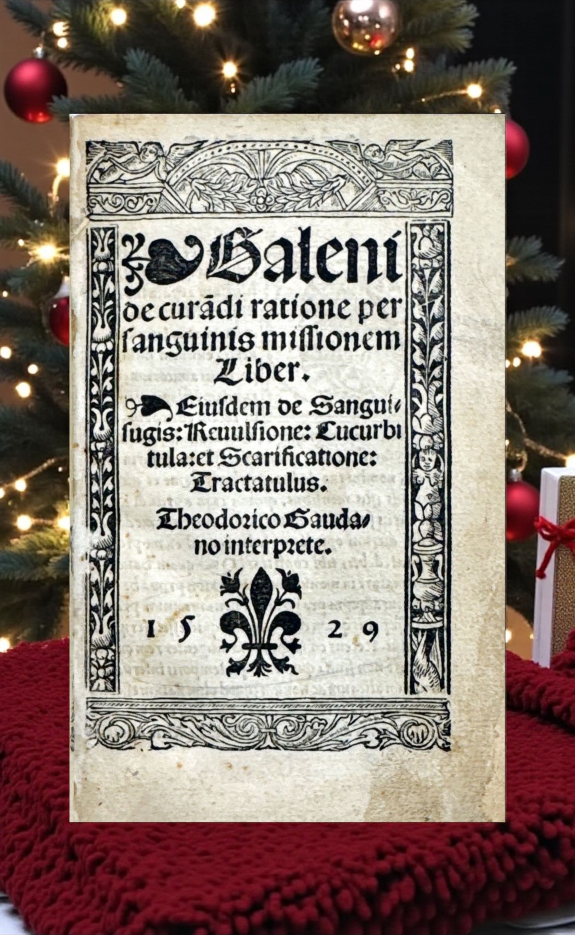 Raro e curioso livro de medicina sobre as técnicas de sangrar, nomeadamente através das sanguessugas. Frontispício impresso em caracteres góticos, enquadrados por uma moldura xilográfica. Exemplar com duas folhas com furo com perda de letras de texto A sangria para curar um doente era modelada no processo da menstruação. Hipócrates acreditava que a menstruação funcionava para "purificar as mulheres dos maus humores". Durante o Império Romano, o médico grego Galeno, que seguia os ensinamentos de Hipócrates, defendeu a sangria iniciada pelo médico. A popularidade da sangria no mundo mediterrânico clássico foi reforçada pelas ideias deste medico, depois de ter descoberto que não só as veias, mas também as artérias estavam cheias de sangue, e não de ar, como se acreditava comummente na época. As duas traduções desta obra foram publicadas em 1529 e 1530, a primeira edição grega impressa em 1525 Com alguns sublinhados da época. Encadernação recente inteira de carneira.