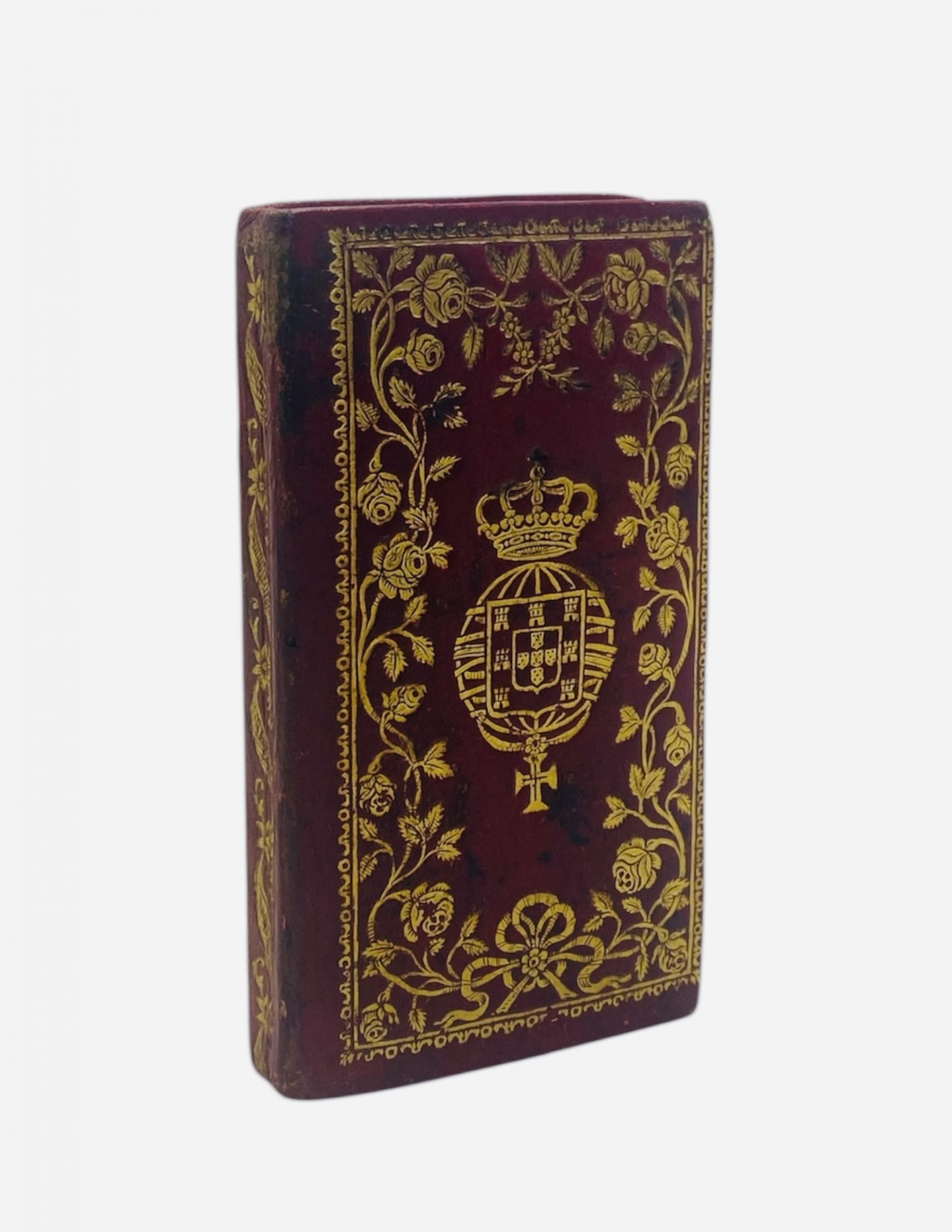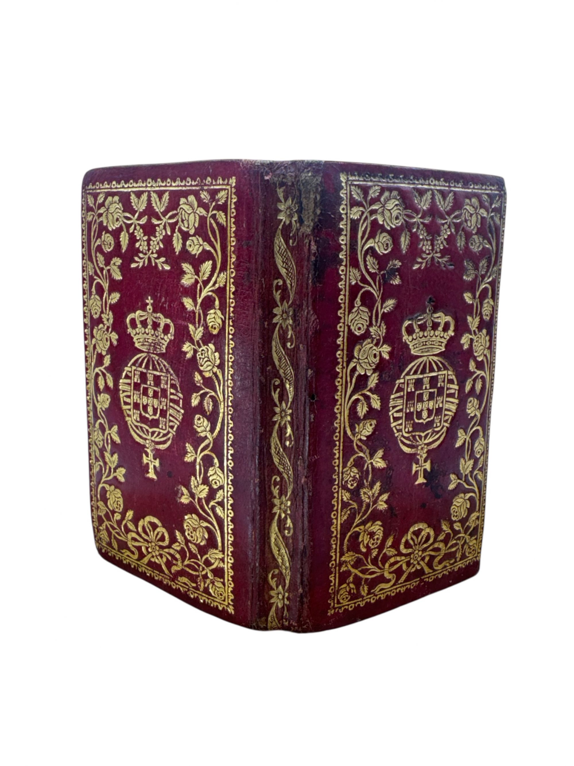 Sem o mapa de Portugal. Com algumas anotações marginais da época. Revestido de bela encadernação inteira de pele, com artísticos ferros a ouro na lombada e pastas, possuindo ao centro de ambas o brasão de armas de Portugal enquadrados por formosos ferros decorativos e com motivos florais.
