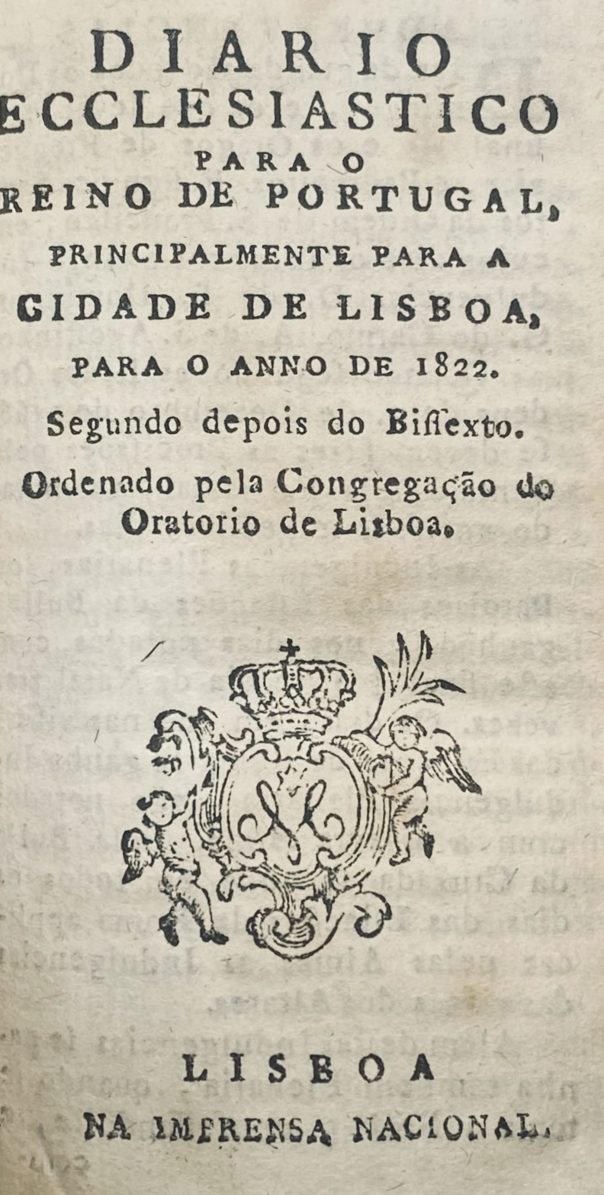 DIARIO ECCLESIASTICO PARA O REINO DE PORTUGAL principalmente para a Cidade de Lisboa. Para o anno de 1822. Segundo depois do Bissexto. Ordenado pela Congregação do Oratorio de Lisboa.