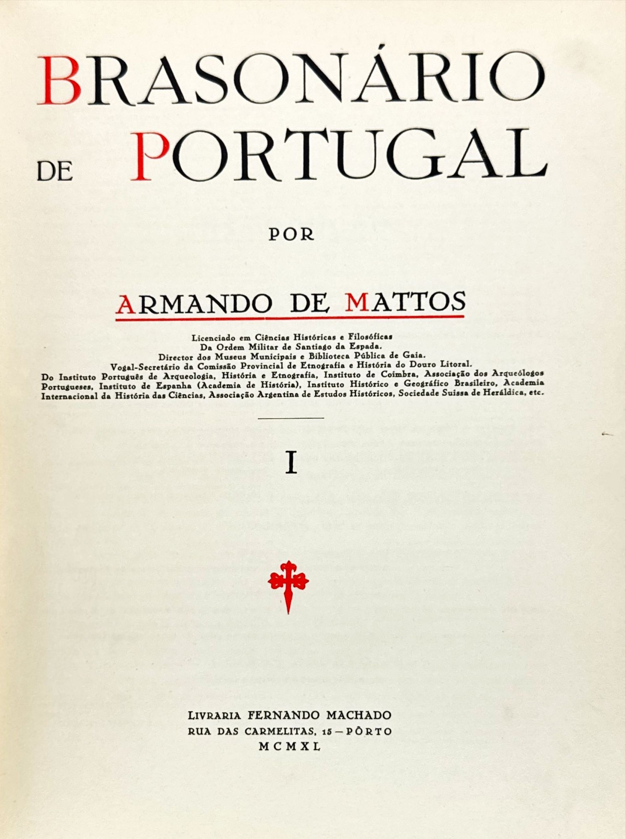 MATTOS, Armando de. - BRASONÁRIO DE PORTUGAL. Volume I (e II). Porto. Livraria Fernando Machado. 1940 (e 1943). 2 Vols. In-8º Encs.