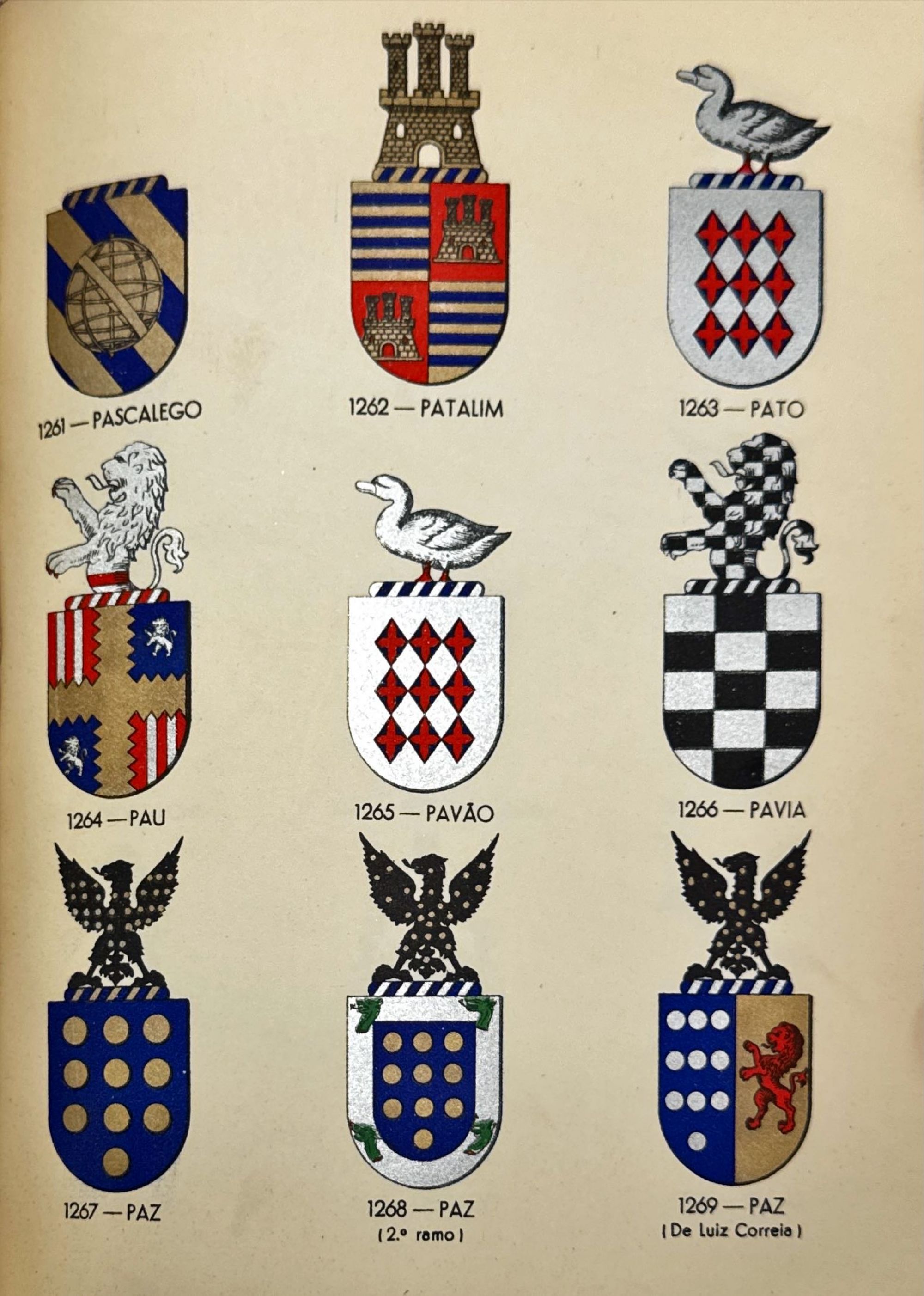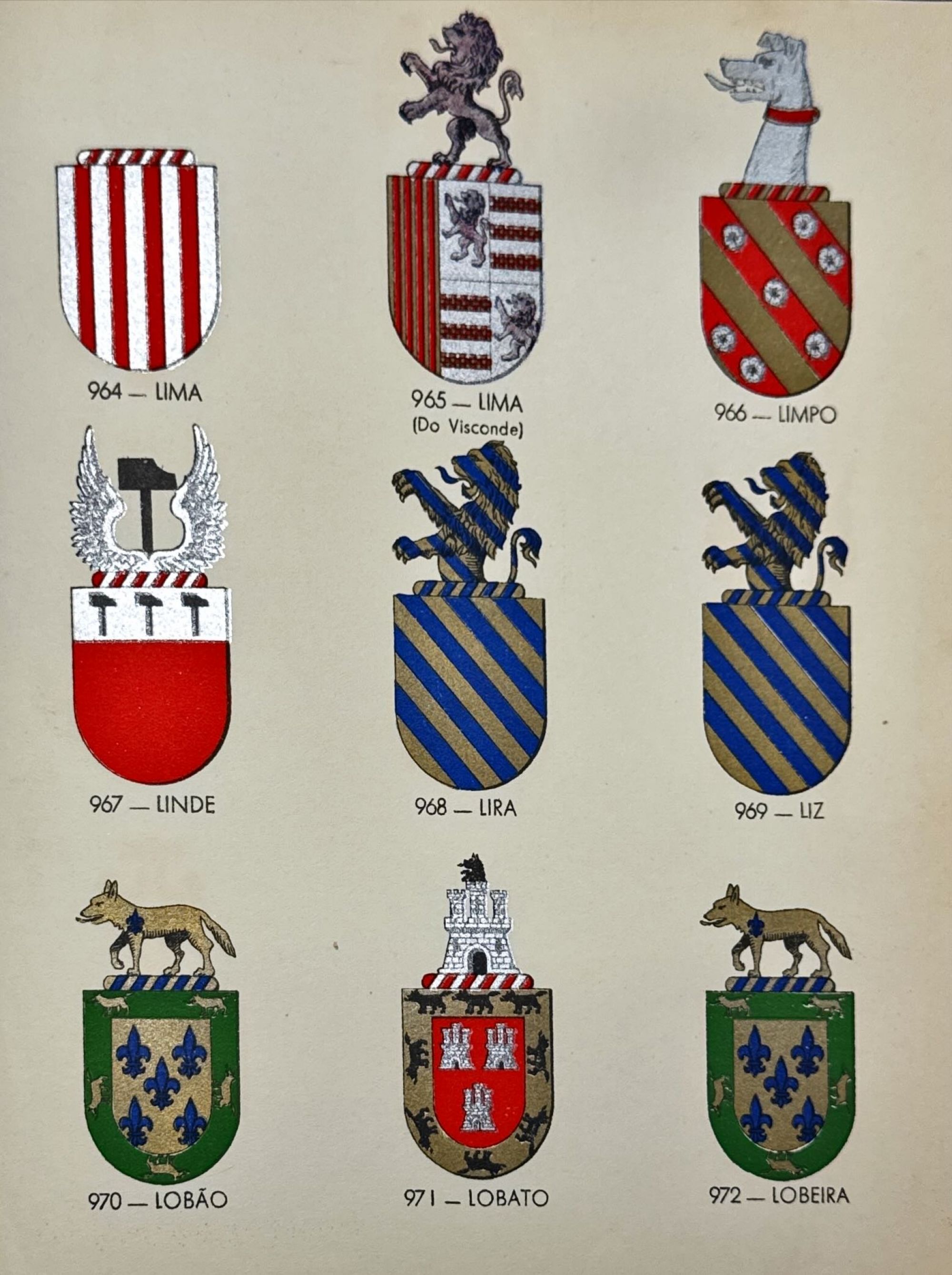 Edição original desta rara publicação. Profusamente ilustrada com 1870 brasões de famílias a cores com desenhos de Gouveia Portuense. Boas encadernações meias de pele, com ferros a ouro nas lombadas e pastas. Executada por Frederico de Almeida. Conserva as capas de brochura e lombadas. Bons exemplares.
