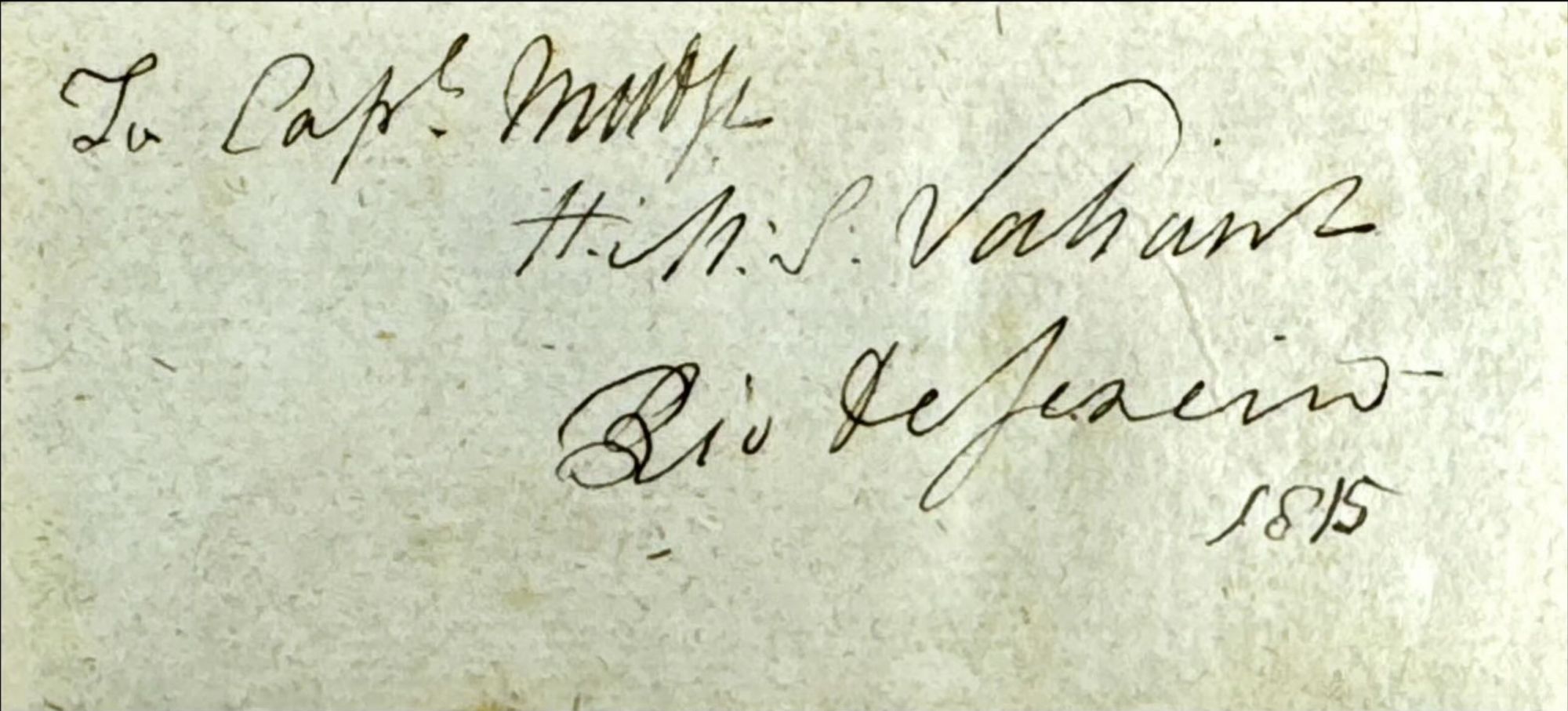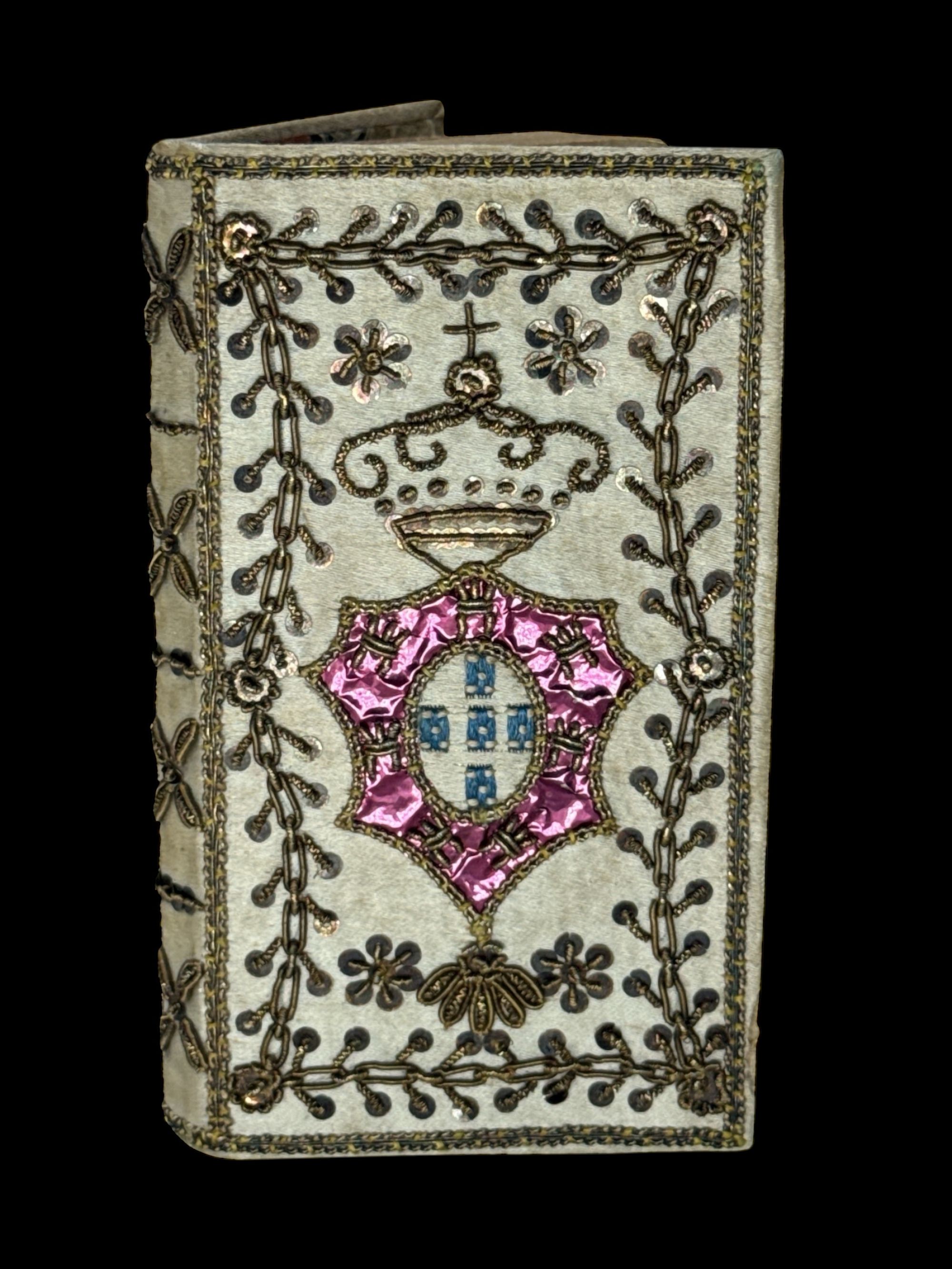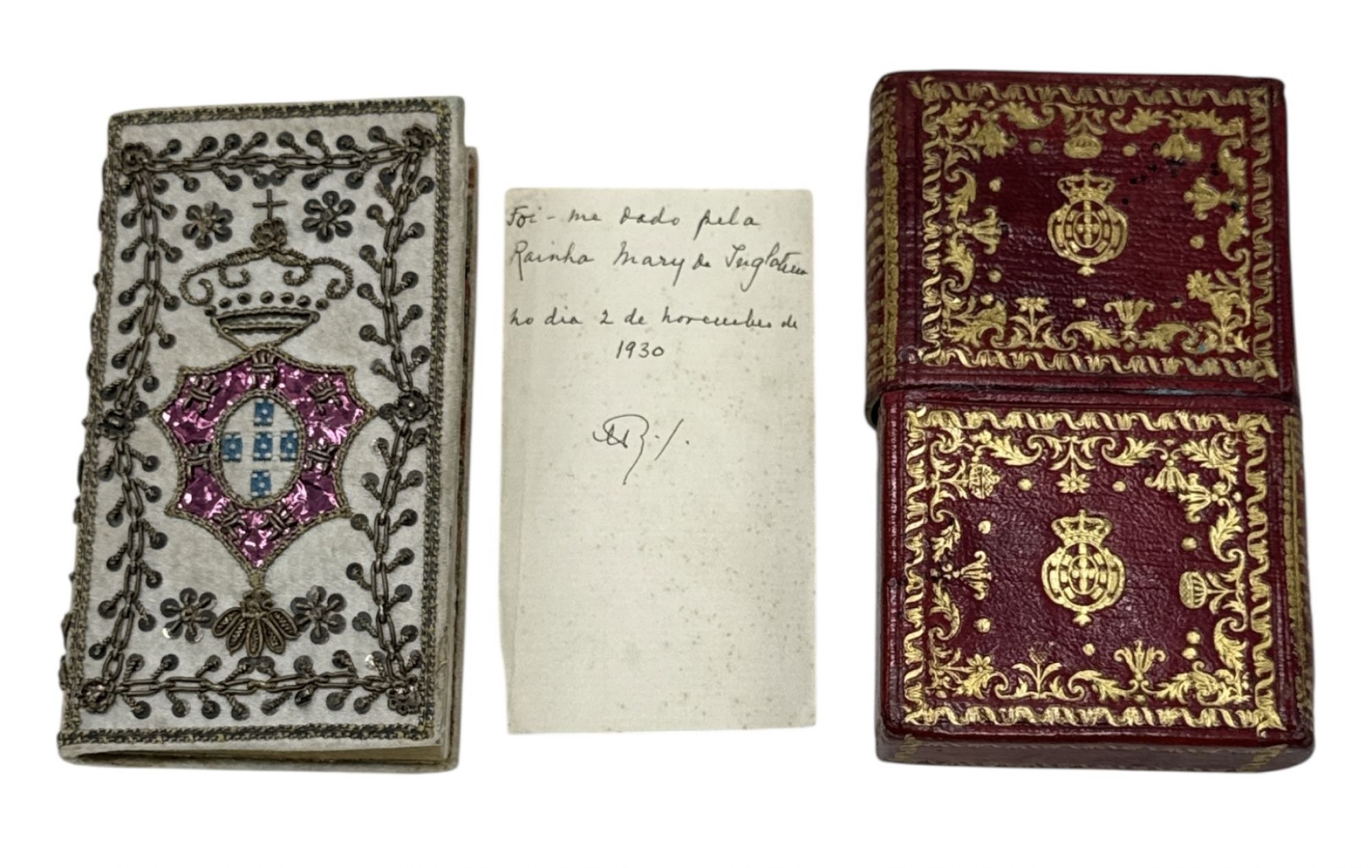 Muito raro Diário dedicado ao Rio de Janeiro, ilustrado com 2 mapas em folha desdobrável, um de Portugal e o outro com a planta do Rio de Janeiro. Em 1815 o príncipe regente D. João elevou o Brasil à categoria de Reino Unido de Portugal, Brasil e Algarves, extinguindo o estatuto de colónia. Esta mudança transformou o Rio de Janeiro no centro administrativo do império português. Valorizado com um papel manuscrito com a rubrica que D. Manuel II assinava notas privadas ou identificava itens na sua vasta e famosa biblioteca. “Foi-me dado pela Rainha Mary de Inglaterra no dia 2 de novembro de 1930”. Neste ano o Rei vivia no exílio no Reino Unido, D. Manuel II e a Rainha Amélia tinham uma relação extremamente próxima e de amizade pessoal com a Rainha Mary e o Rei Jorge V. Eles visitavam-se frequentemente e trocavam presentes de colecionador. A folha de guarda apresenta a assinatura “To Capt. Mounsey, H.M.S. Valiant, Rio de Janeiro 1815”. O Capitão Mounsey, oficial distinto da Marinha Real Britânica (Royal Navy) que serviu durante as Guerras Napoleónicas. Ficou conhecido por ter capturado a fragata francesa Furieuse em 1809, um feito que lhe rendeu grande fama. Em 1815, após o fim das guerras na Europa, muitos navios britânicos estavam destacados para patrulhar as costas da América do Sul para proteger interesses comerciais. Revestido de bela encadernação em pano, com artísticos ferros e ouro bordados na lombada e pastas, possuindo ao centro de ambas o brasão de armas de Portugal. Dourado por folhas. Acondicionado em caixa de pele vermelha com artísticos ferros em ouro e com 4 brasões de armas do Reino Unido de Portugal, Brasil e Algarves