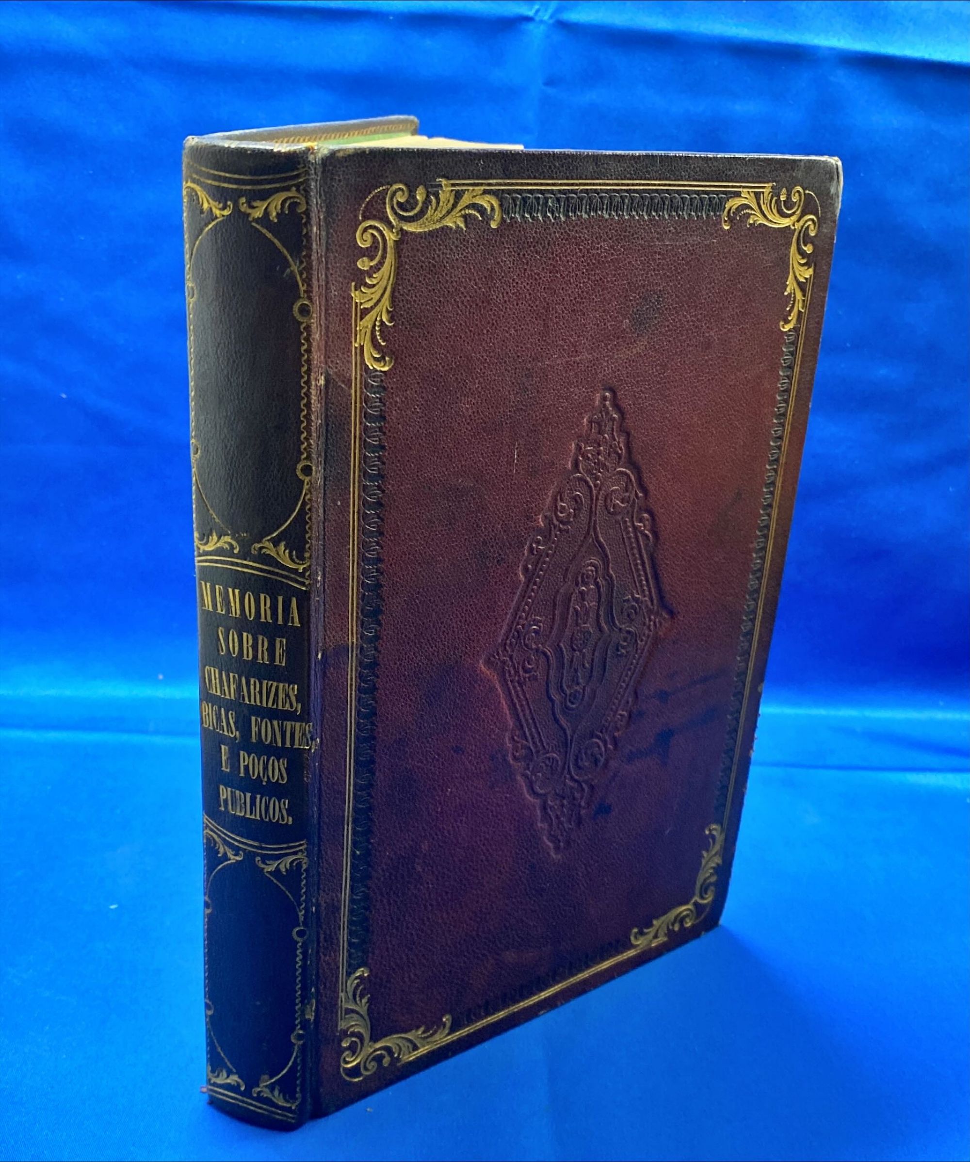Primeira edição. Muito rara. Possui extra-texto plantas e gráficos e no final uma planta em folha desdobrável e a cores, que representa o Aqueduto das Águas Livres. Bem conservado. Encadernação artística em pele com ferros a ouro e a seco na lombada e pastas.