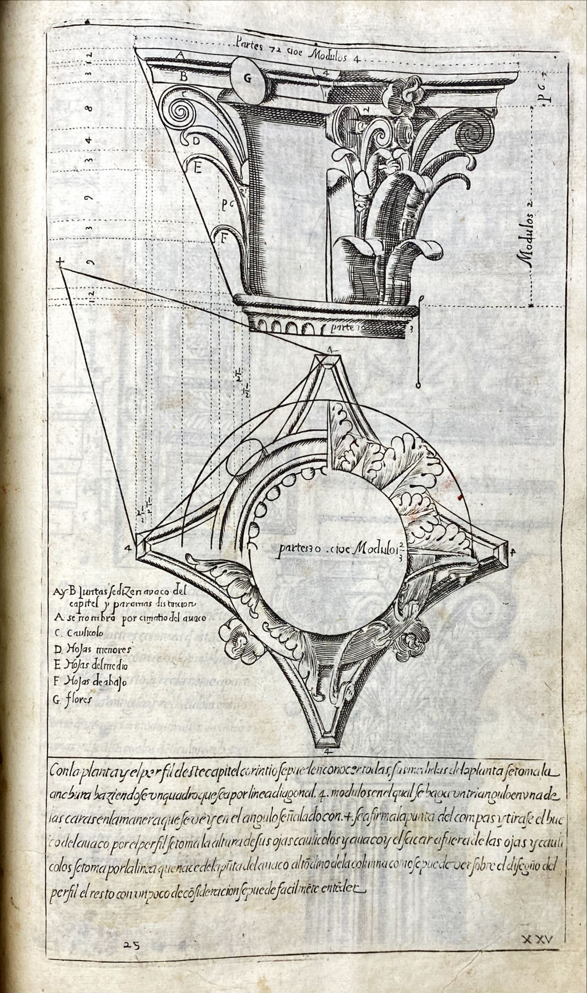 Profusamente ilustrado com desenhos de projecções geométricas no espaço, xilografados no texto, e com 58 gravuras extratexto, abertas em chapa de metal, representando os conceitos teóricos das ordens de arquitectura clássica. A folha de rosto do 1º volume apresenta uma portada arquitectónica com alegorias à geometria e à aritmética, a página de rosto própria do 2º volume apresenta um quadrilongo tipográfico decorativo e a página de rosto das Regras de Vignola apresenta igualmente uma portada arquitectónica com o mesmo tema alegórico (geometria e aritmética) e com as armas reais do reino unido da Espanha e Portugal. Encadernação em pergaminho.