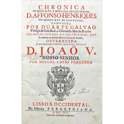 GALVÃO E RUI DE PINA, Duarte. - CHRONICA // DI MUITO ALTO, E MUITO ESCLARECIDO PRINCIPE // D. AFFONSO HENRIQUES // PRIMEIRO REY DE PORTUGAL, // COMPOSTA POR DUARTE GALVÃO. // LISBOA OCCIDENTAL, // Na Officina Ferreyriana. // M.DCC.XXVI. //... // In-4º de [24], 95, [1] págs. - Incluidas no mesmo volume -