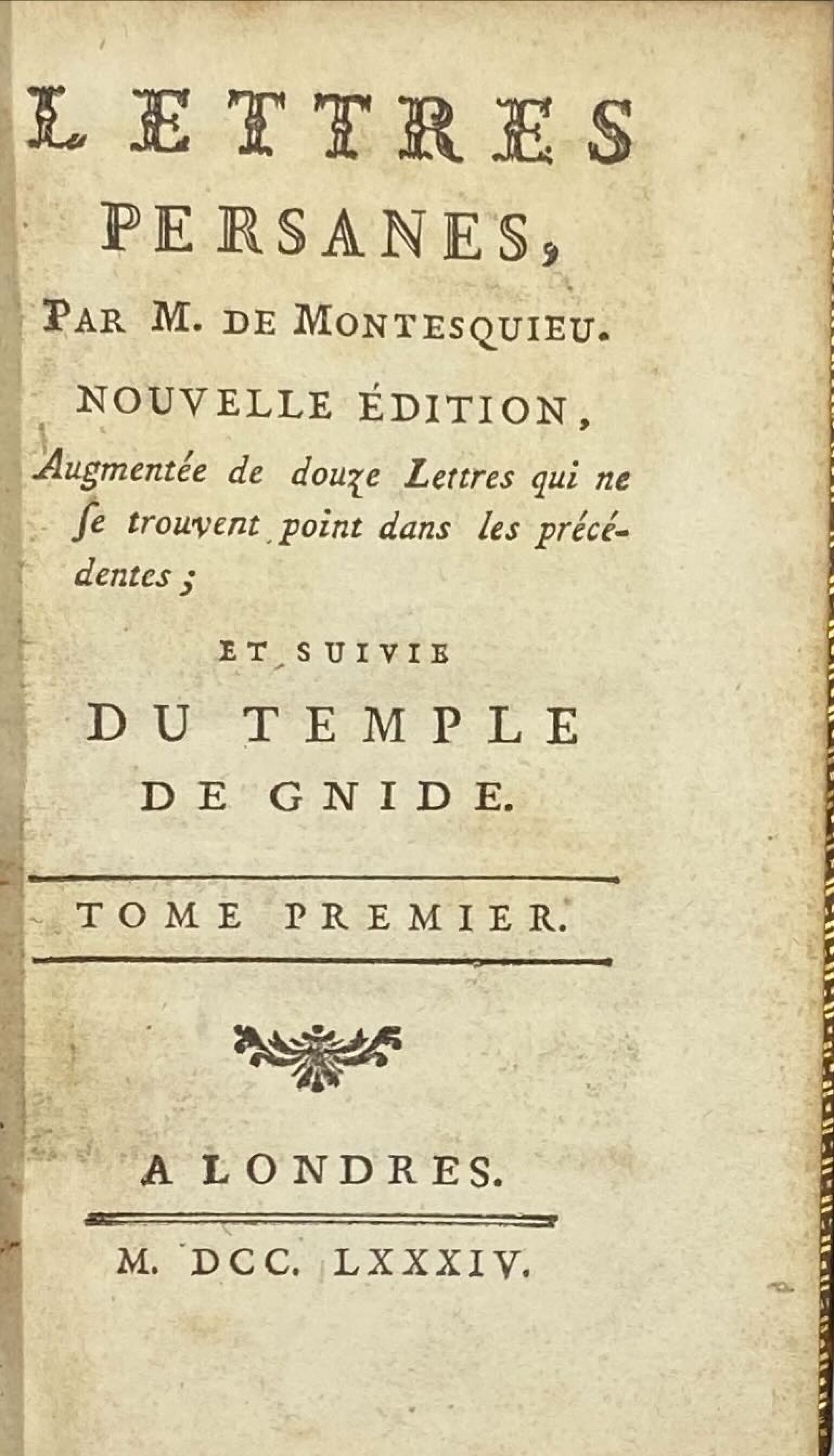 MONTESQUIEU. - LETTRES PERSANNES PAR. Nouvele édition, augmentée de douze Lettres qui dne se trouvent point dans les précédentes; et suivie du Temple de Gnide.