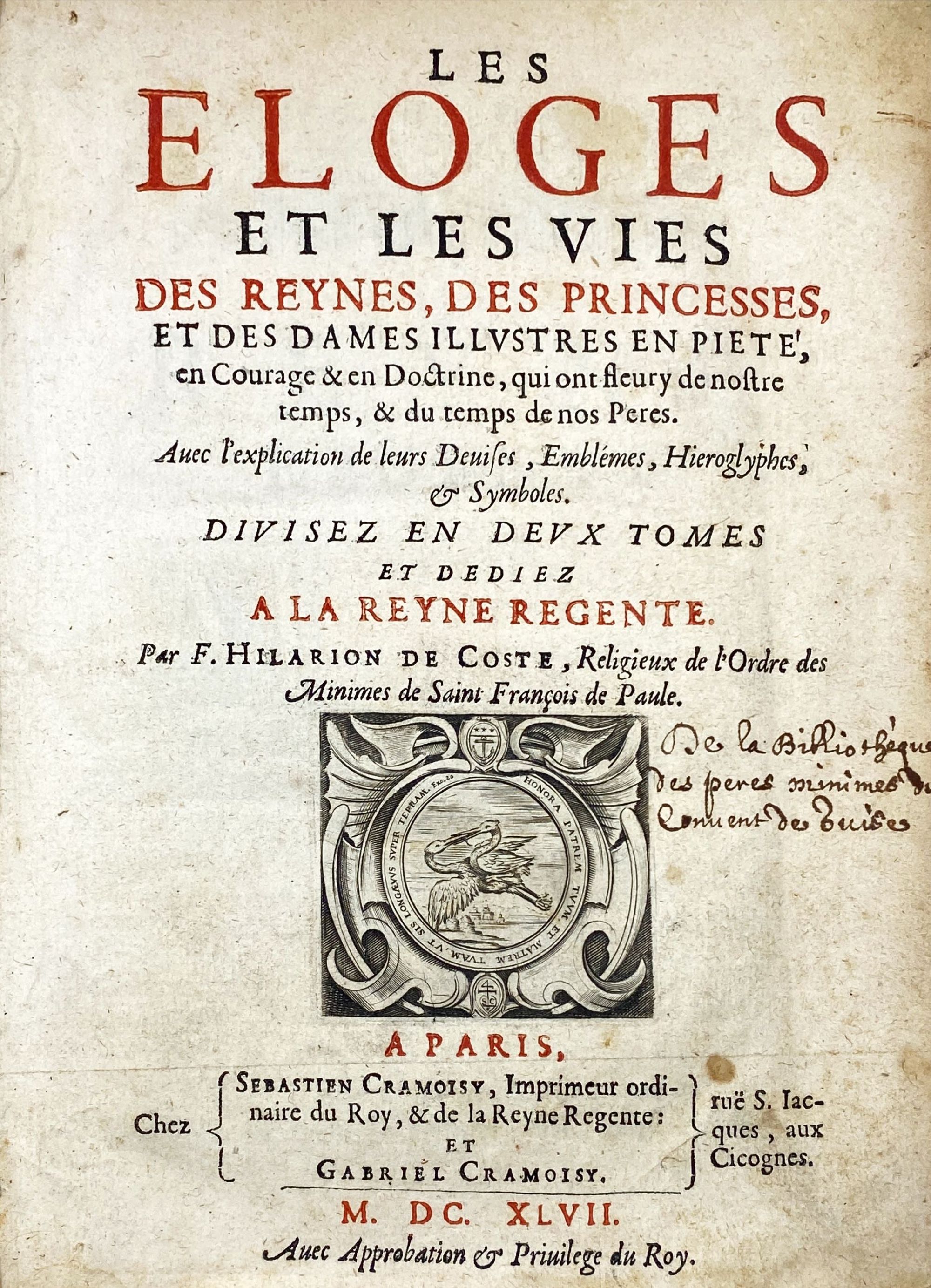 COSTE, Fr. Hilarion de. - LES ELOGES ET LES VIES des Reynes, des Princesses, et des Dames Ilustres en Pieté ... avec l'explication de leurs Devise, Emblémes, hieroglyphes, & Symboles.