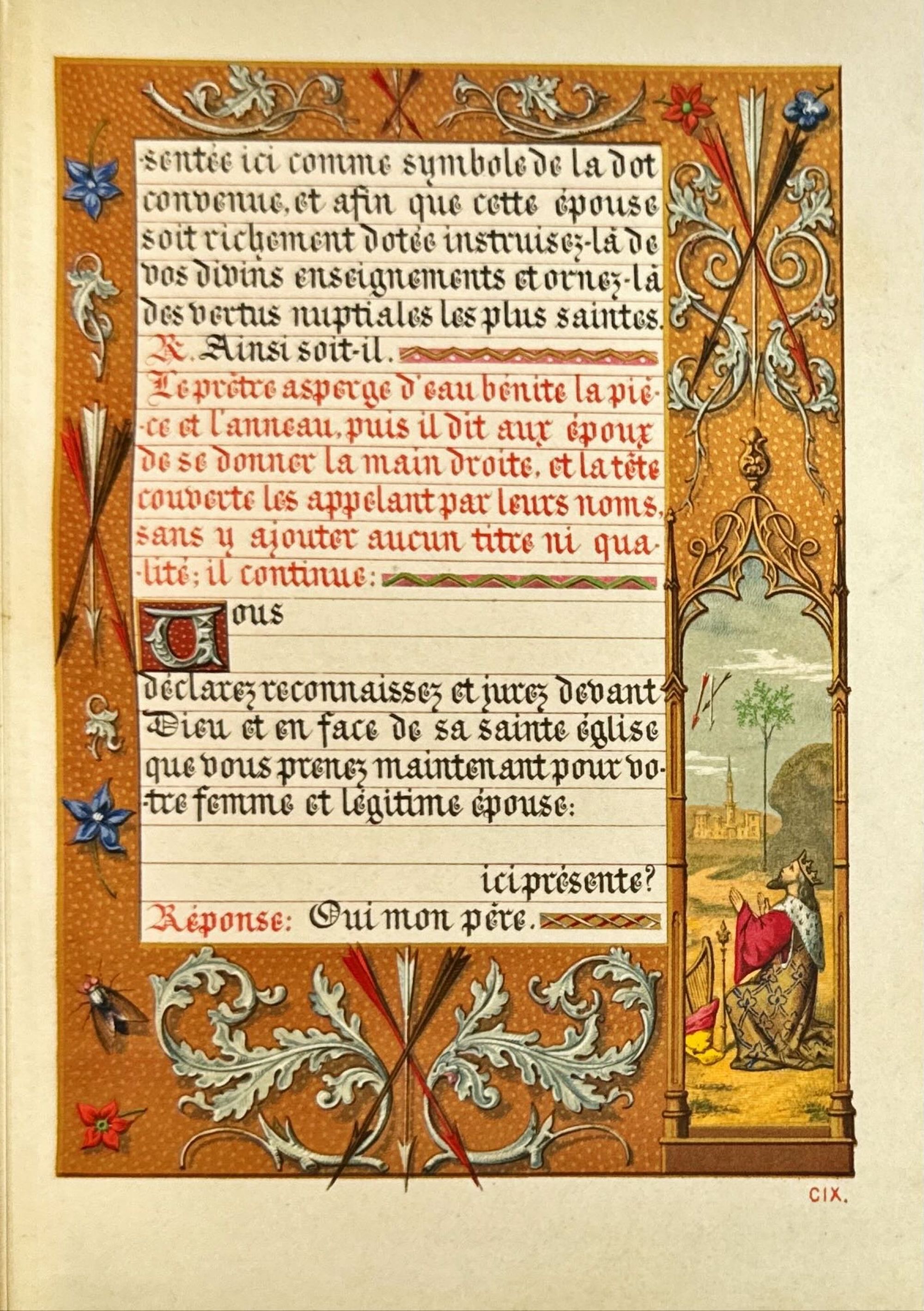 Primeira impressão deste encantador livro de horas inteiramente iluminada, litografada a cores e realçada a ouro, respeitando a estética dos manuscritos medievais, na sua fantasia e requinte. O livro foi desenhado com a novíssima técnica da cromolitografia, na altura ainda desconhecido. No final contem 4 folhas em branco com moldura azul e vermelha com o título "Souvenirs de famille". Bela encadernação inteira de pele com ferros a ouro e a seco nas pastas, lobada e seixas. Guardas em seda e dourado por folhas. Com falta dos fechos.