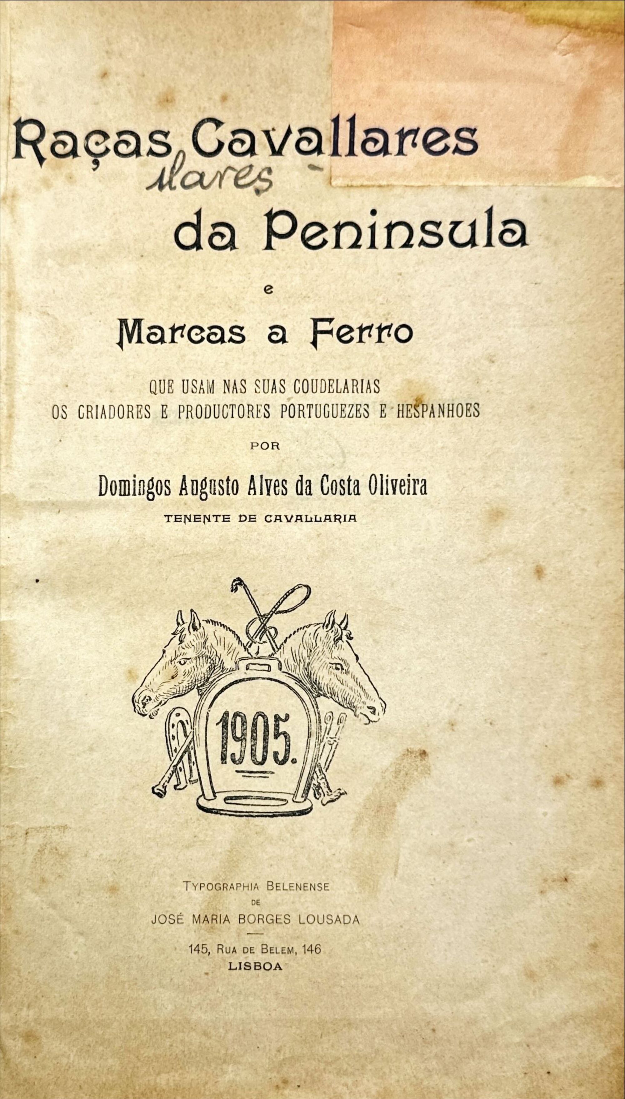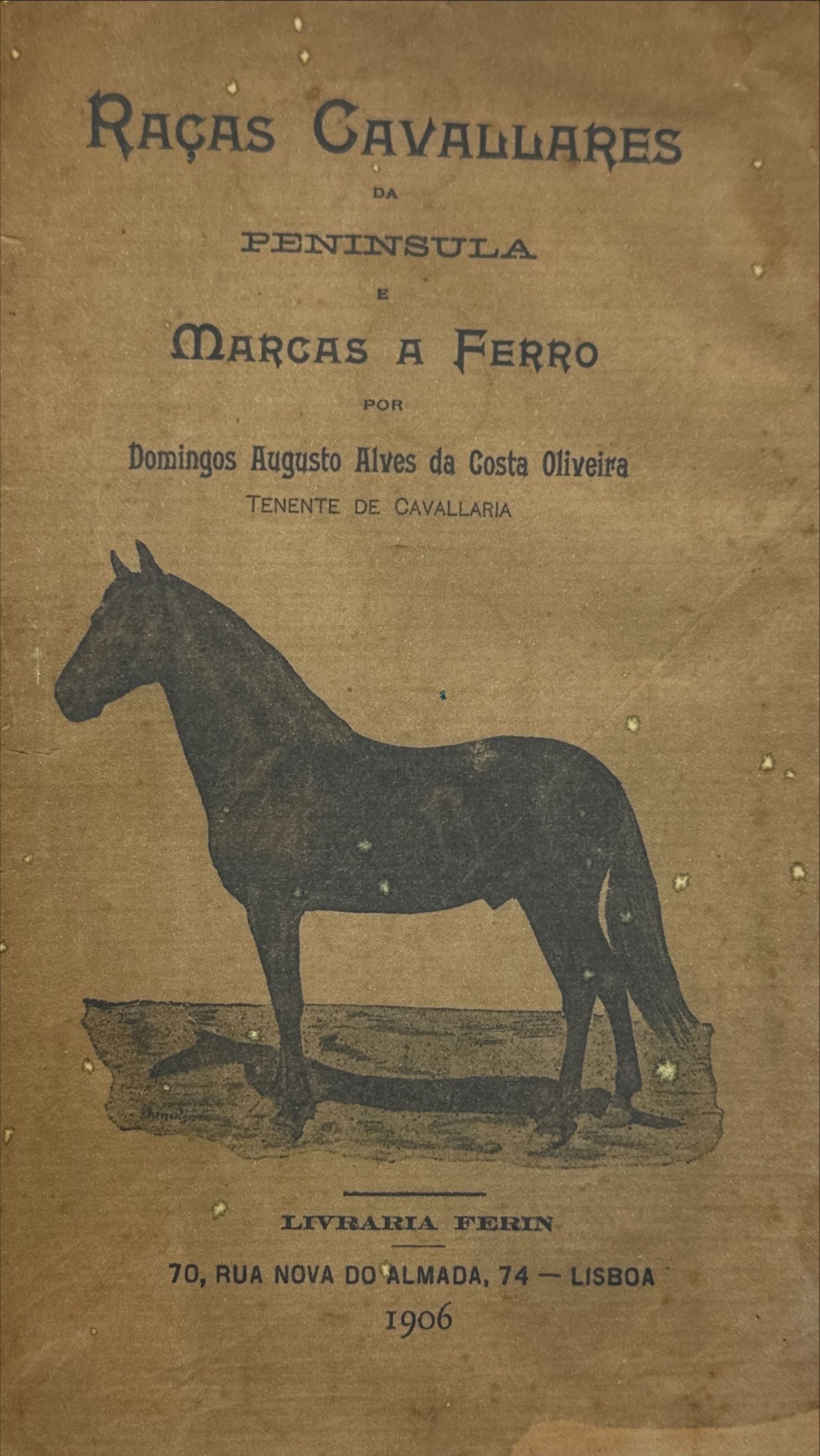 OLIVEIRA, Domingos Augusto Alves da Costa. - RAÇAS CAVALLARES DA PENINSULA E MARCAS A FERRO. Que usam nas suas coudelarias os criadores e productores portuguezes e hespanhoes (e Appendice ao Livro Raças Cavallares).