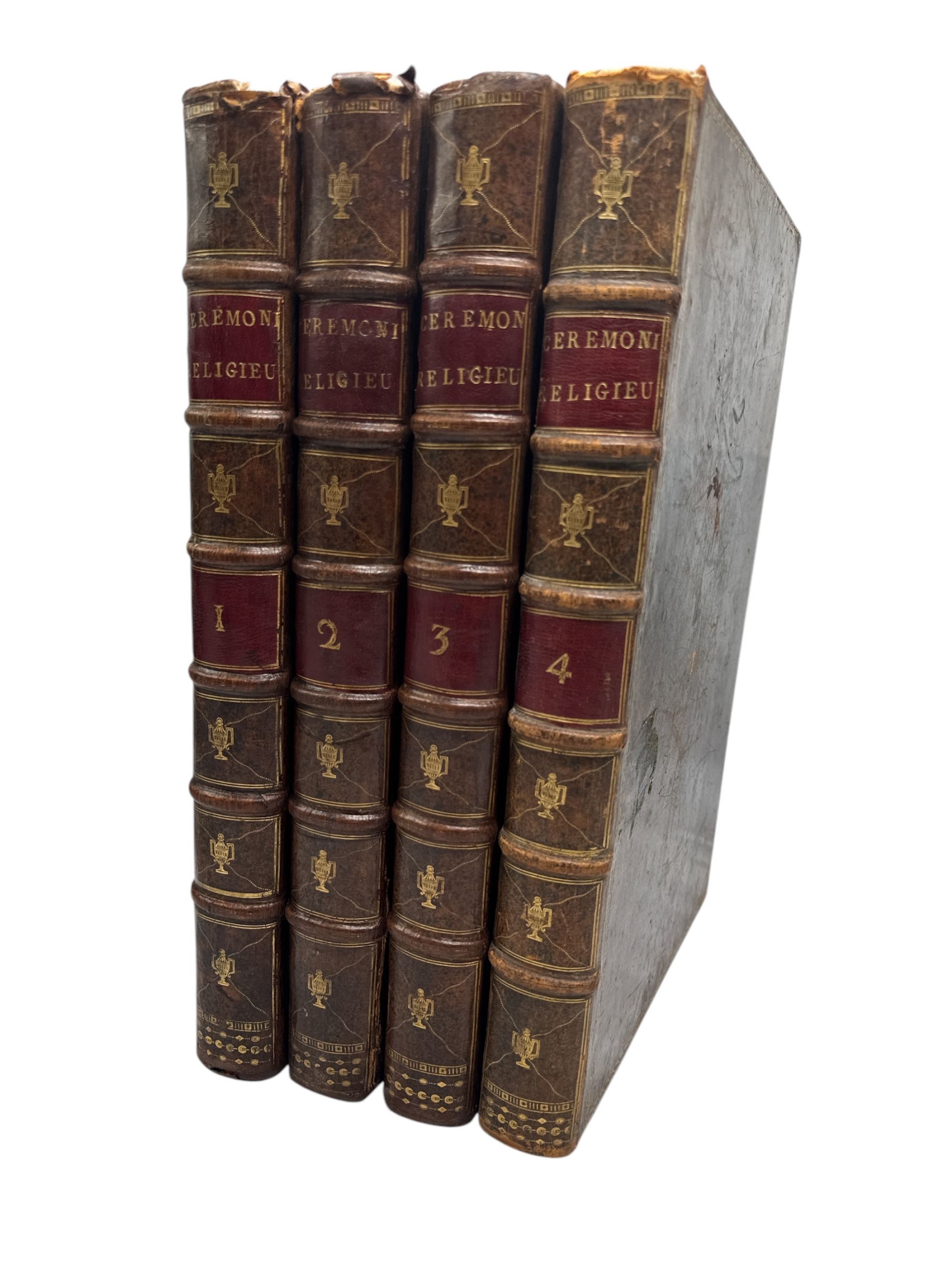 PICART, Bernard. - CEREMONIES ET COUTUMES RELIGIEUSES DE TOUS LES PEUPLES DU MONDE, REPRESENTEES PAR DES FIGURES DESSINEES & GRAVEES. Ouvrage qui comprend l'histoire philosophique de la religion des nations des deux hemispheres; telles que celle des Brames, des Peguans, des Chinois, des Japonois, des Thibetins, & celle des differens peuples qui habitent l'Asie & les Isles de l'Archipelage Indien; celle des Mexicains, des Peruviens, des Bresiliens, des Groenlandois, des Lapons, des Caffres, de tous les Peuples de la Nigritie, de l'Ethiopie & du Monomotapa; celle des Juifs, tant anciens que modernes, celle des Musulmans & des differentes sectes qui la composent; enfin celle des Chretiens & de cette multitude de branches dans lesquelles elle est subdivisee. Vol I (ao IV). Amsterdam. Laporte. 1789. 4 Vols. In-folio. Encs.