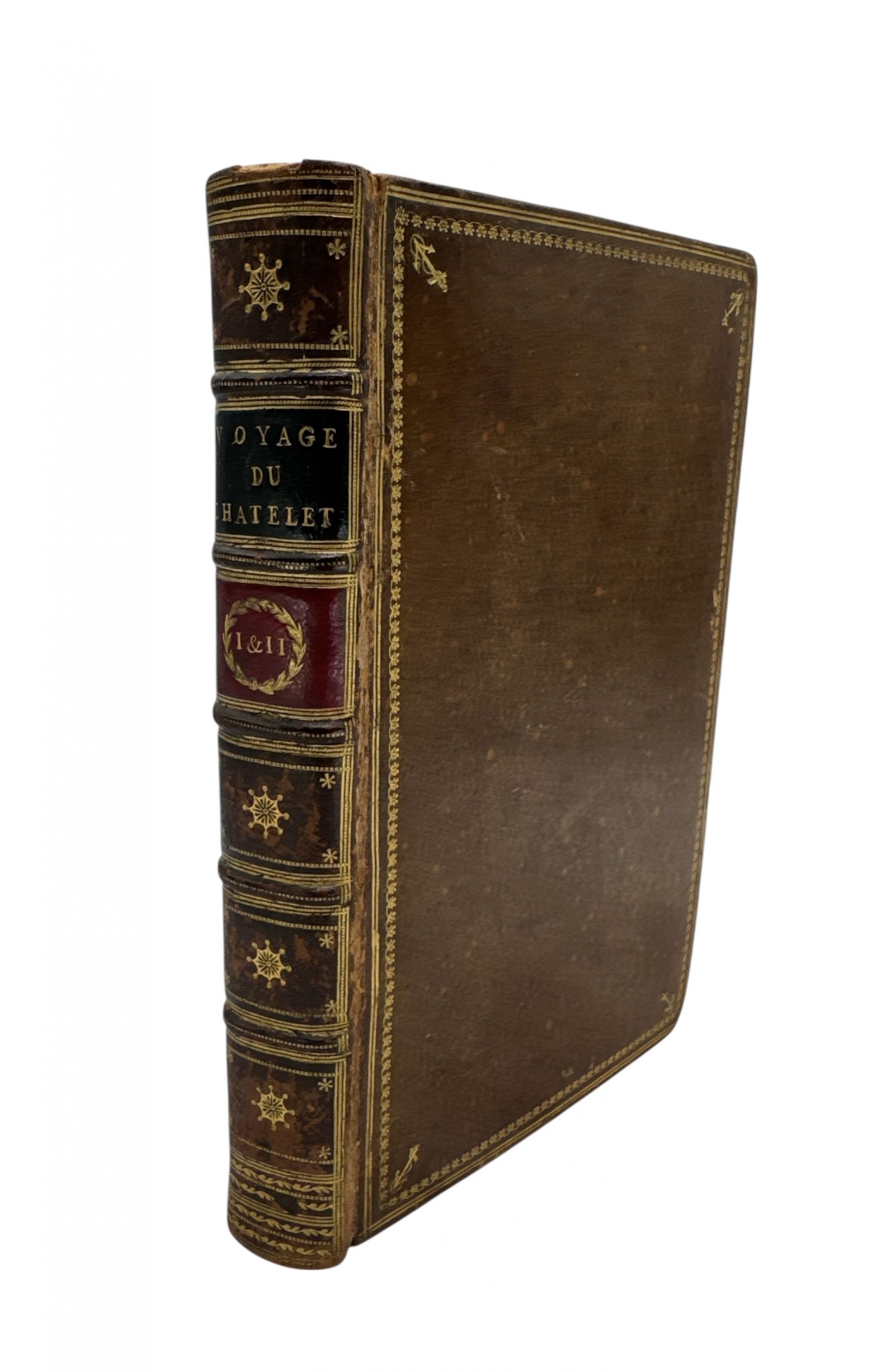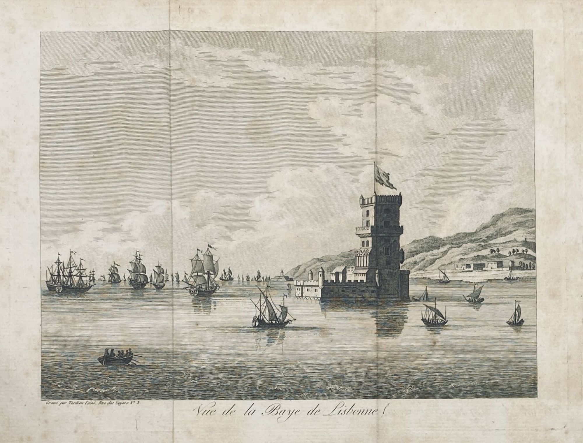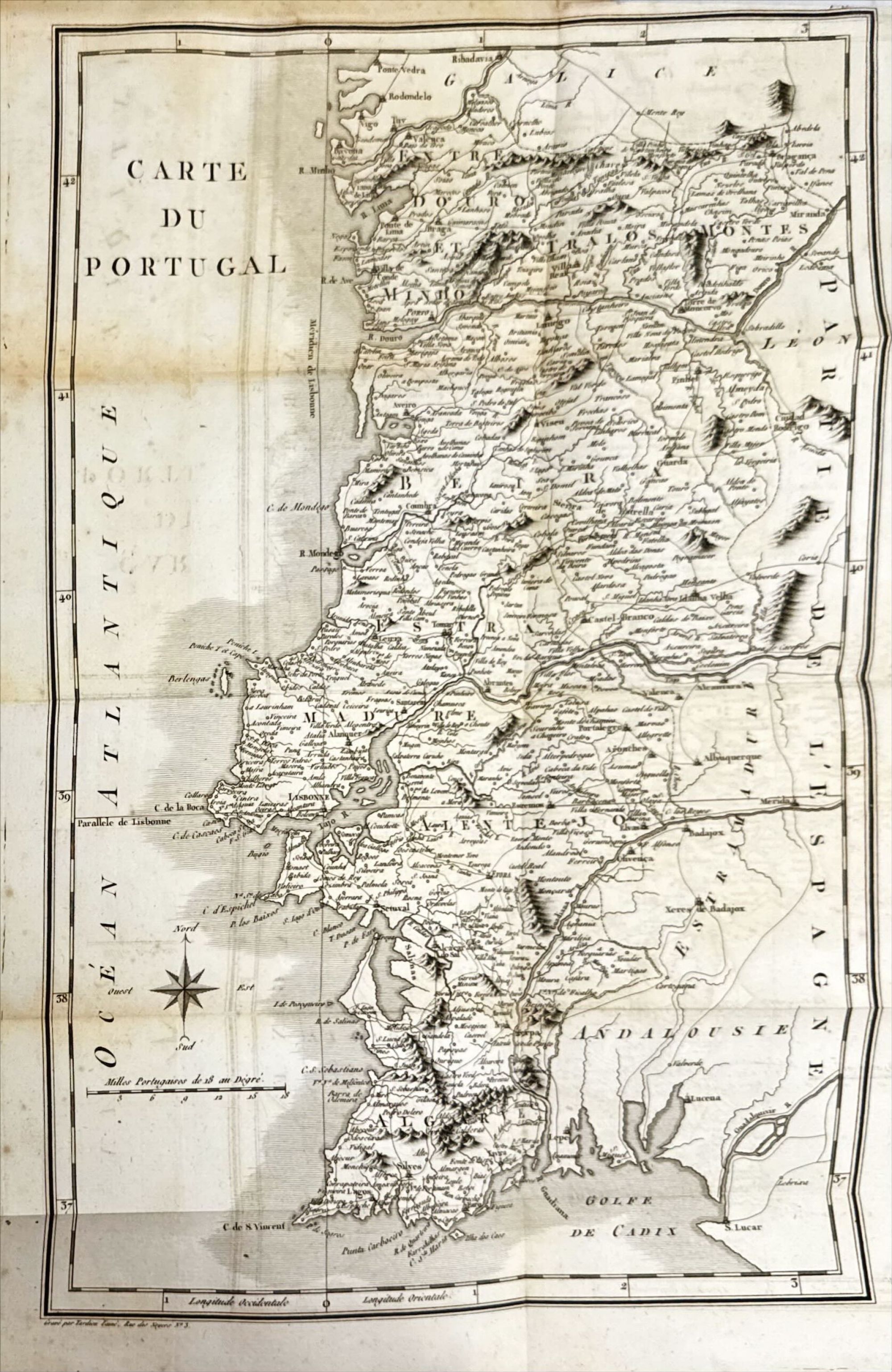 Primeira edição. Ilustrado com uma bela gravura da margem direita do Rio Tejo, legendada “Vue de la Baie de Lisbonne”, representando ao centro uma armada fundeada junto à torre de Belém e o mosteiro dos Jerónimos ao fundo, e um mapa de Portugal, desdobrável, ambos gravados por Tardieu l’ainé. Bem conservado. Encadernação da época inteira de pele. Publicou-se uma segunda edição em 1801. Encadernação da época inteira de pele com ferros a ouro na lombada, pastas e seixas.