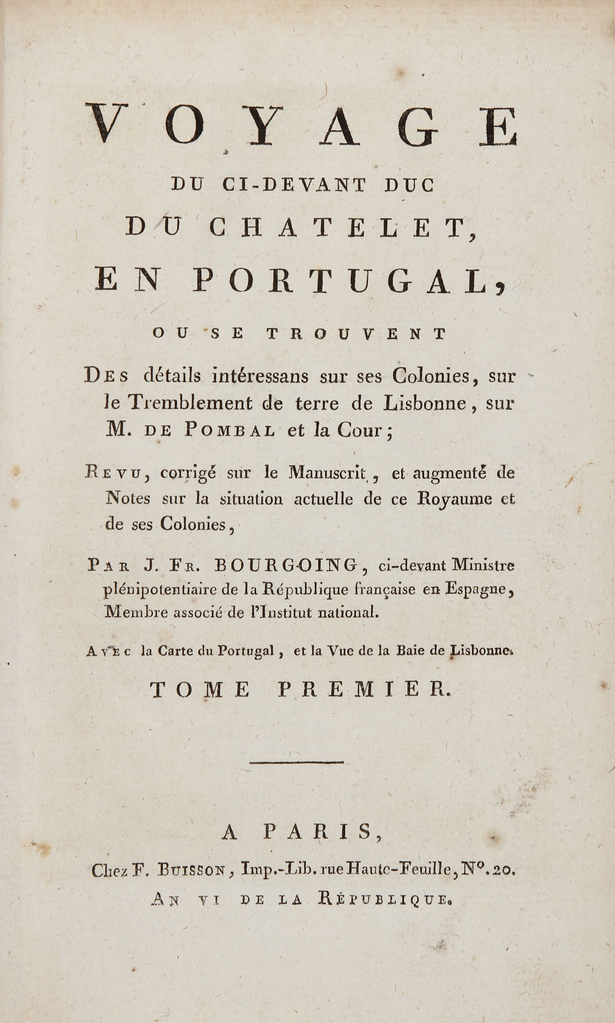 BOURGOING, Jean François. - VOYAGE DU DUC DU CHATELET, EN PORTUGAL, OU SE TROUVENT Des détails intéressans sur ce Royaume, ses Habitans, ses Colonies sur la Cour et M. de Pombal, sur le Tremblement de terre de Lisbonne, etc. Revu, corrigé sur le Manuscrit, et augmenté de Notes sur la situation actuelle de ce Royaume et de ses Colonies, Par J. Fr. BOURGOING, ci-devant Ministre plénipotentiaire de la République française en Espagne, Membre associé de l'Institut national, etc. Avec la Cart