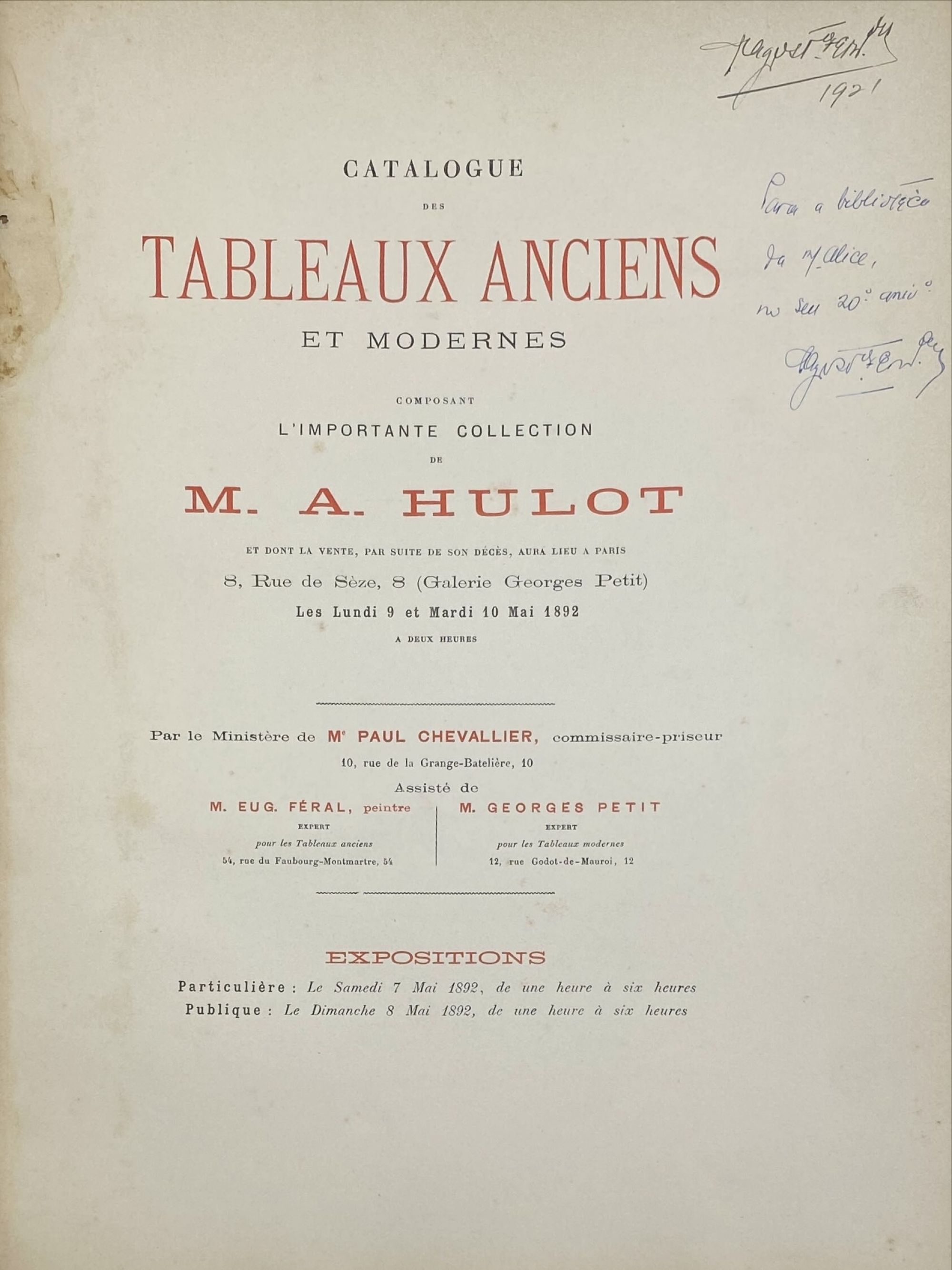 CATALOGUE DES TABLEAUX ANCIENS ET composant l'importante collection de M. A. Hulot et dont la vente aura lieu à Paris (Galerie Georges Petit) les 9 et 10 mai 1892.