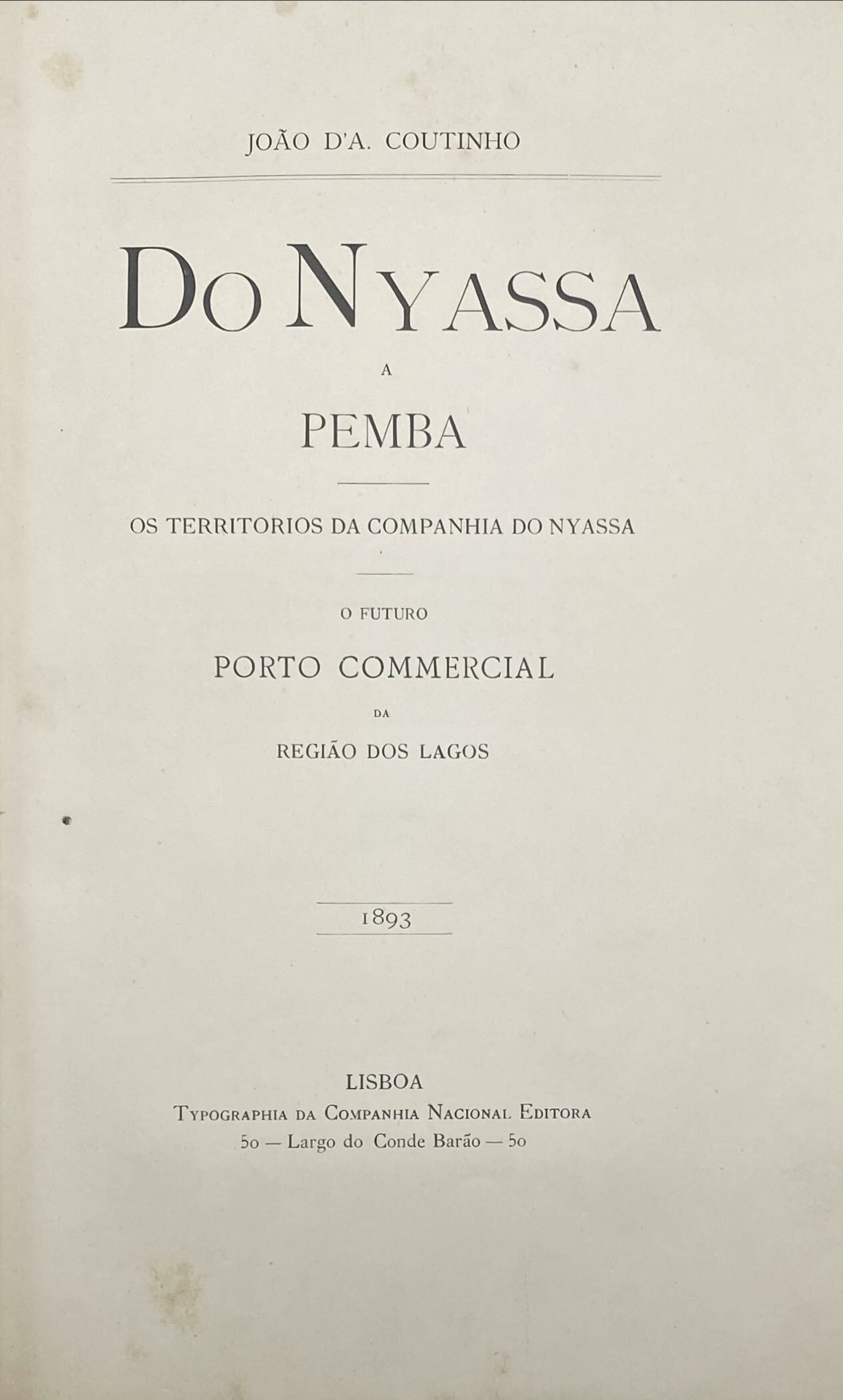 COUTINHO, João de A. - DO NYASSA A PEMBA. Os Territórios da Companhia do Nyassa. O futuro Porto Commercial da Região dos Lagos. Lisboa. Typographia da Companhia Nacional Editora. 1893. In-4º de 247, [12] págs. Enc.