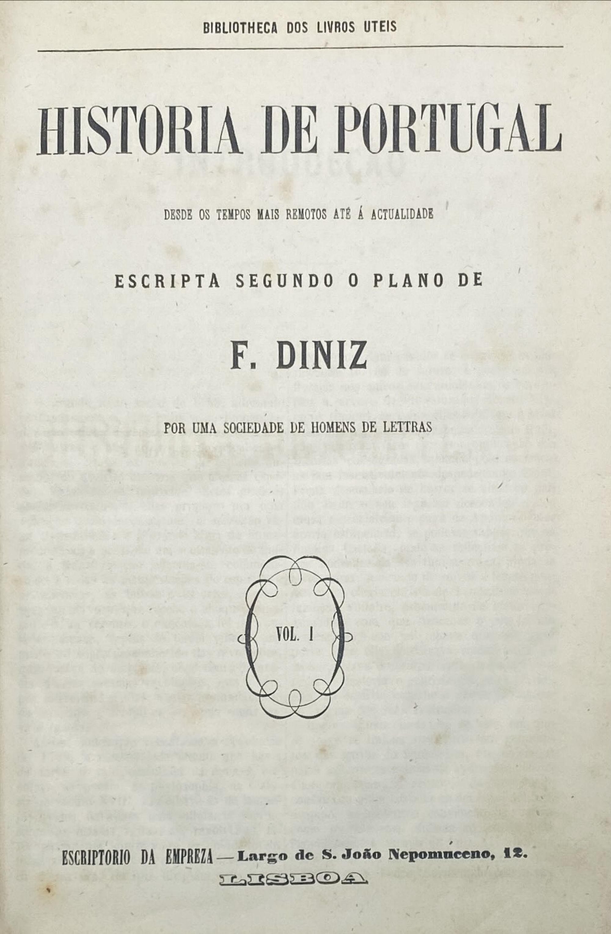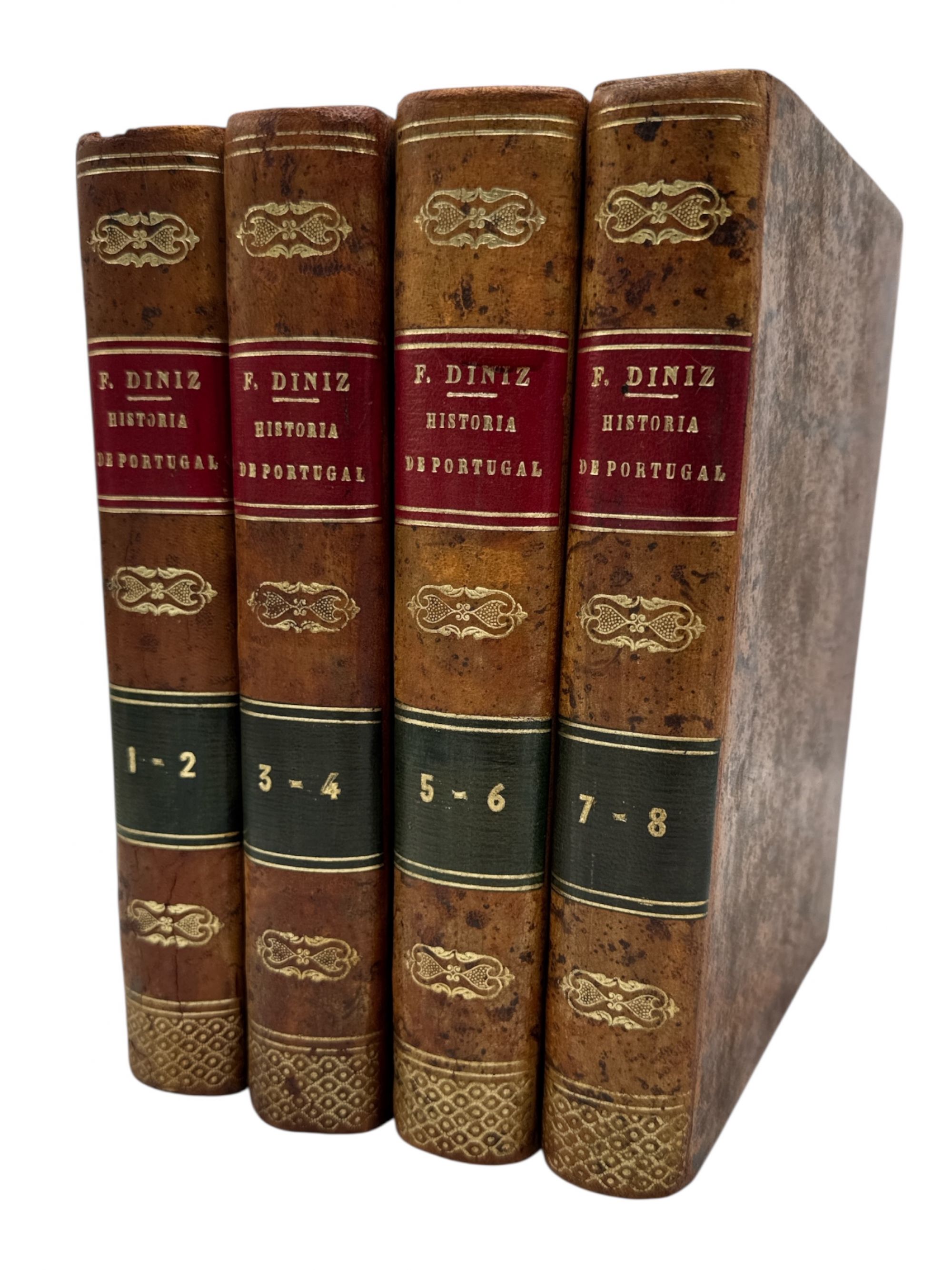 DINIZ, Ferdinand. - HISTORIA DE PORTUGAL. Desde os tempos mias tremotos até á actualidade. Escripta segundo o plano de... Por Uma Sociedade de Homens de Lettras. Lisboa. Bibliotheca dos Livros Uteis. S. data. 8 Vols. In-8º Encs. em 4.