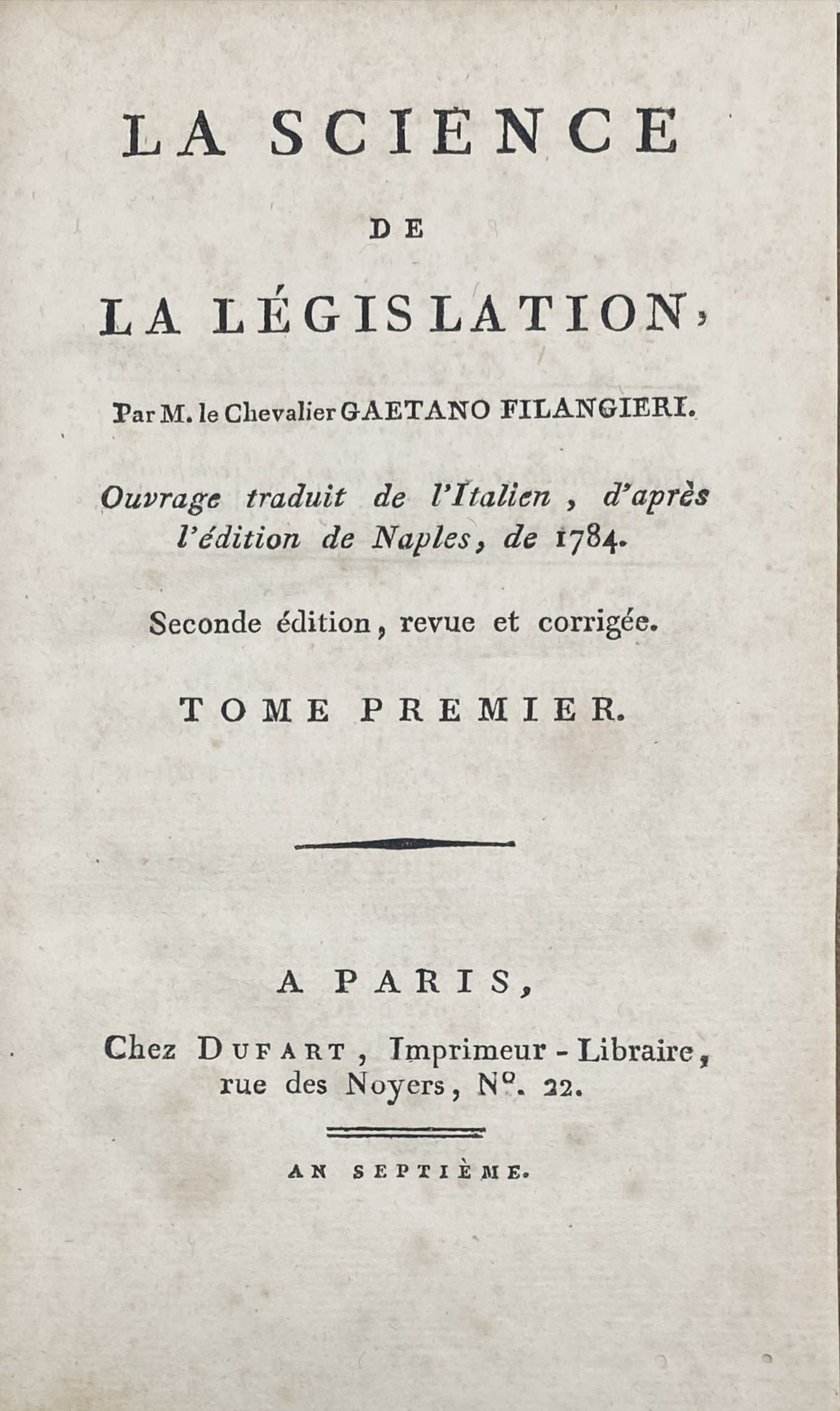 FILANGIERI, Gaetano. - LA SCIENCE DE LA LÉGISLATION. Ouvrage traduit de l’Italien, d’après l’édition de Naples de 1784. Seconde éd. revue et corrigée. Tomo I (ao VII).