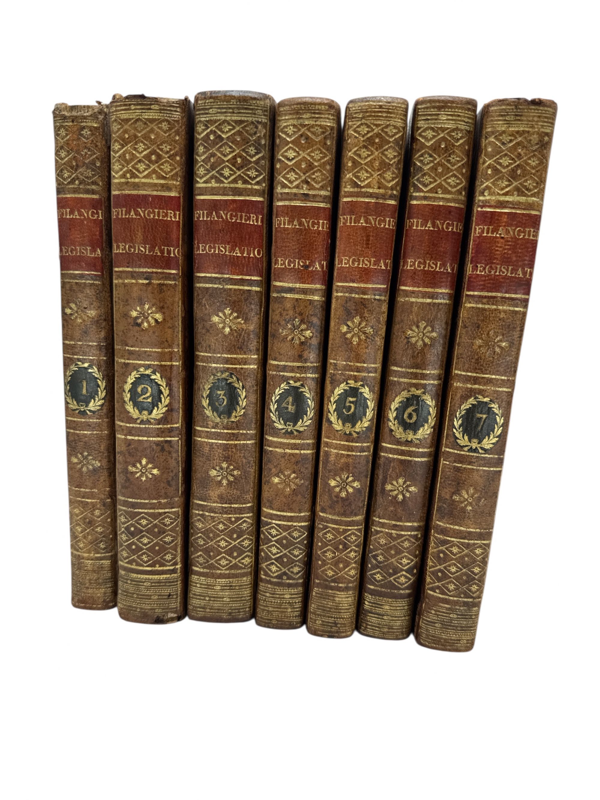 FILANGIERI, Gaetano. - LA SCIENCE DE LA LÉGISLATION. Ouvrage traduit de l’Italien, d’après l’édition de Naples de 1784. Seconde éd. revue et corrigée. Tomo I (ao VII). Paris. Chez Dufart. AN VII (1787-1799). 7 Vols. In-8º. Encs.