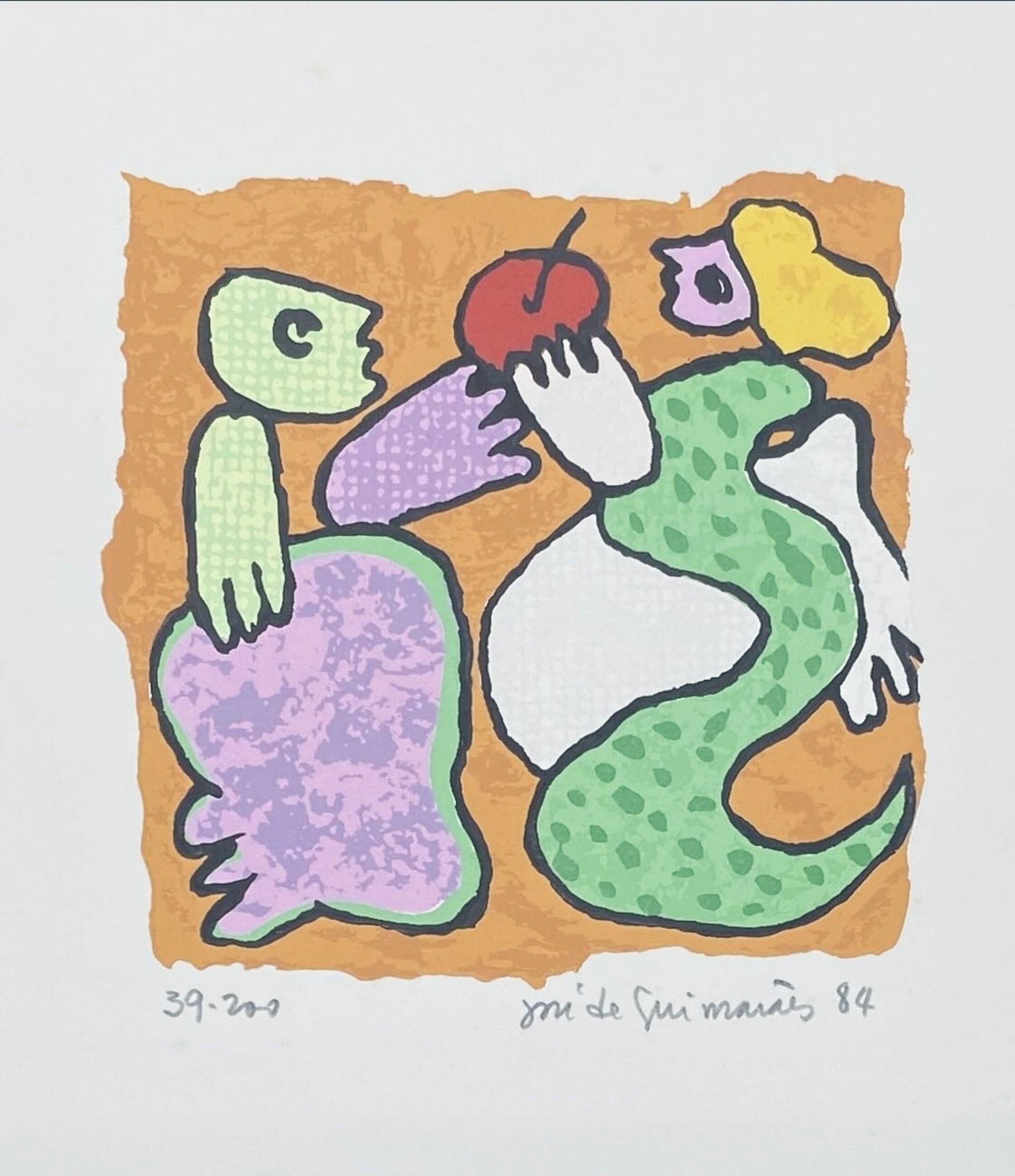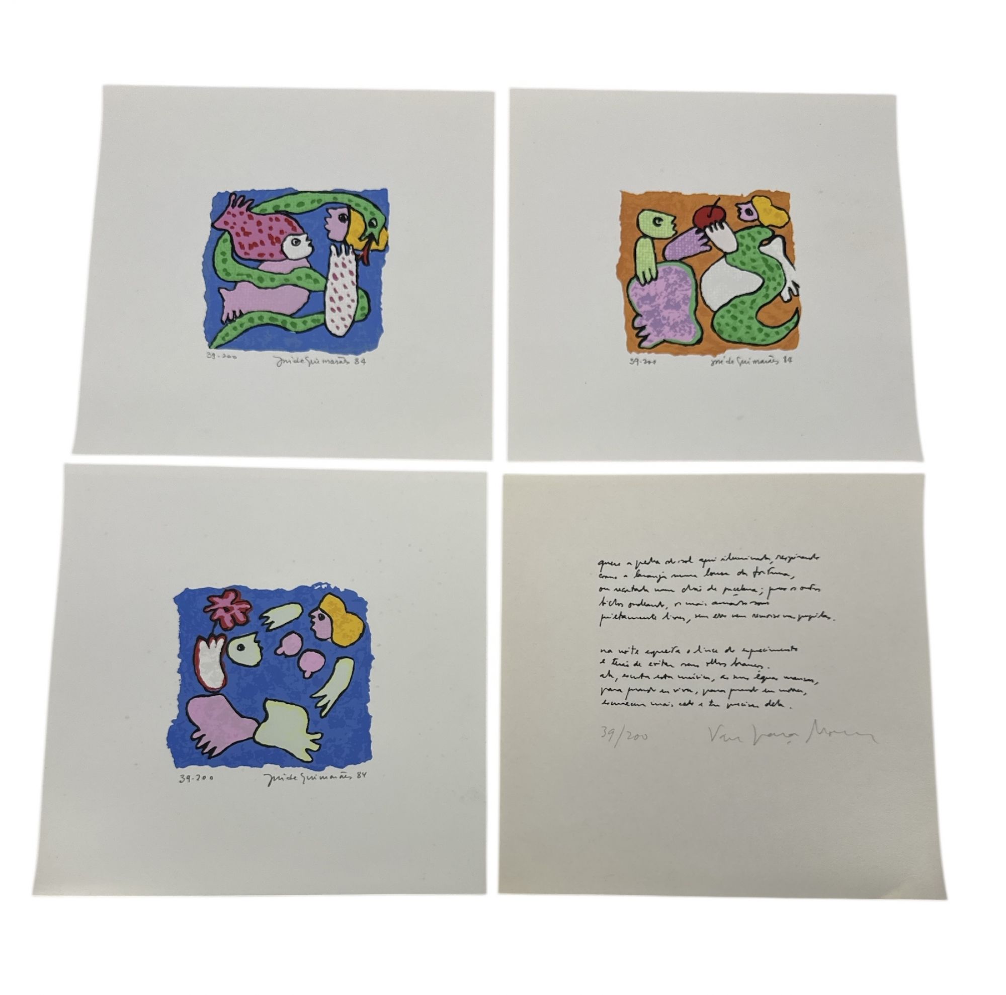 Bela e invulgar edição ilustrada com 3 serigrafias assinadas por José de Guimarães e um poema serigráfico assinado por Vasco Graça Moura. Tiragem de 200 exemplares, este com o nº 39/200. Inserido na coleção "Pintores e Poetas Portugueses, volume III - 1ªsérie". Em folhas soltas e dentro de uma caixa editorial.