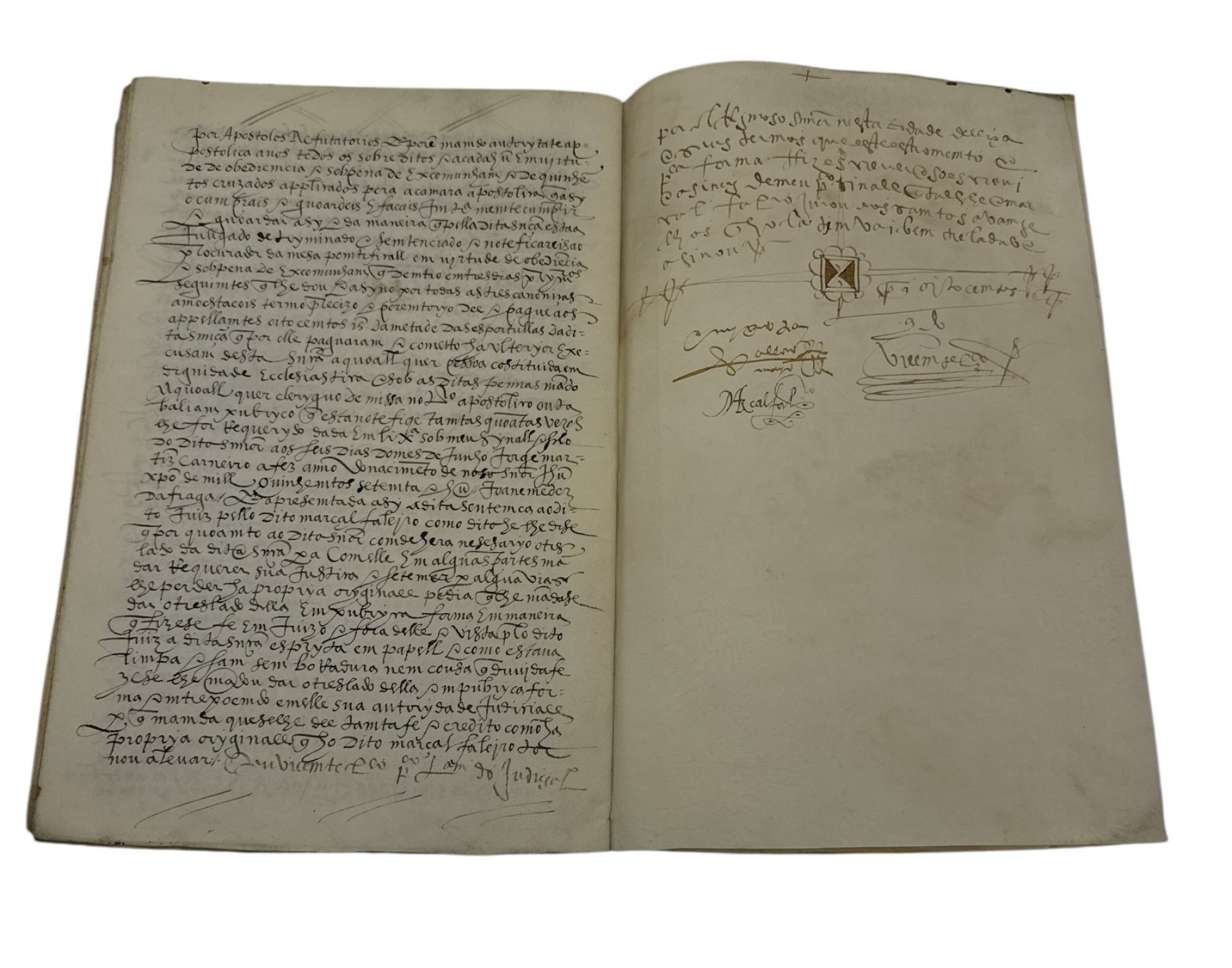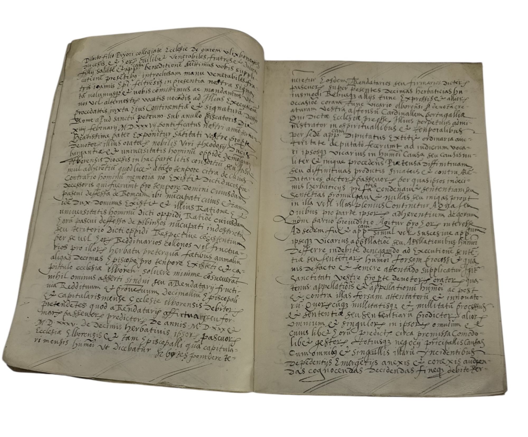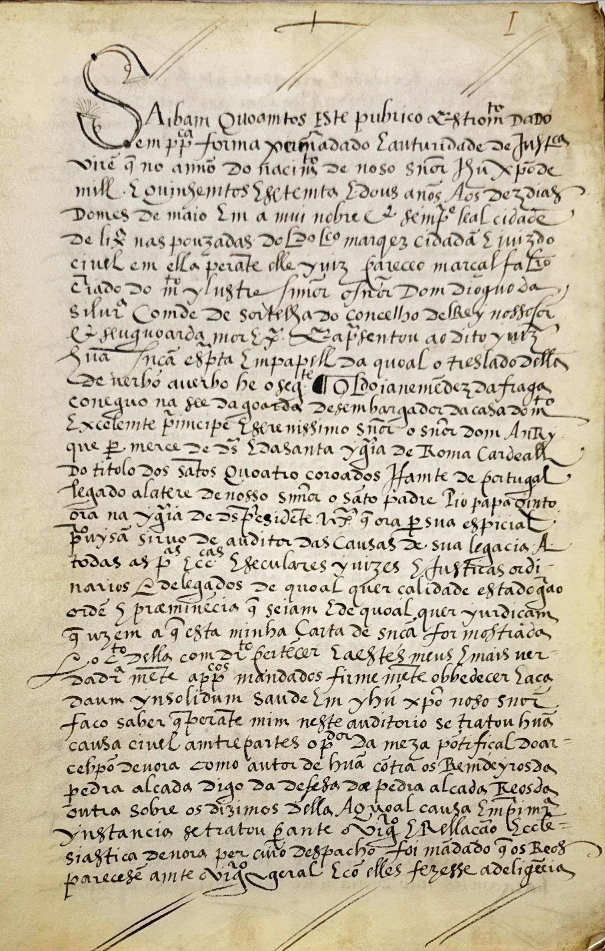 Manuscrito sobre pergaminho (caderno de 14 folhas), em escrita estilo gótica. Pública-forma mandada fazer pelo Juiz do Civil de Lisboa, o Licenciado Lourenço Marques, a pedido de Marçal Faleiro, criado de D. Diogo da Silveira, Conde de Sortelha, do Conselho do Rei e seu Guarda-mor, de uma sentença de D. Sebastião A ação original foi movida pelo procurador da Mesa Pontifical do Arcebispo de Évora contra os rendeiros da devesa da Pedra Alçada, sobre o pagamento dos dízimos, tendo o vigário geral, em primeira instância, decidido contra os réus. Estes contestaram alegando que tinham arrendado a herdade de D. Diogo da Silveira, que estava, por breve do Papa Júlio III (trasladado em latim nas páginas 8 a 12), isento de pagar dízimo da ervagem. A sentença final dada por Joane Mendes da Fraga, cónego da Sé da Guarda e auditor das causas da legacia do Cardeal Infante, que decidiu a favor dos réus. Assinatura e sinal público de Vicente Lourenço, tabelião público do Judicial por el rei em Lisboa e seus termos. Bem conservado.