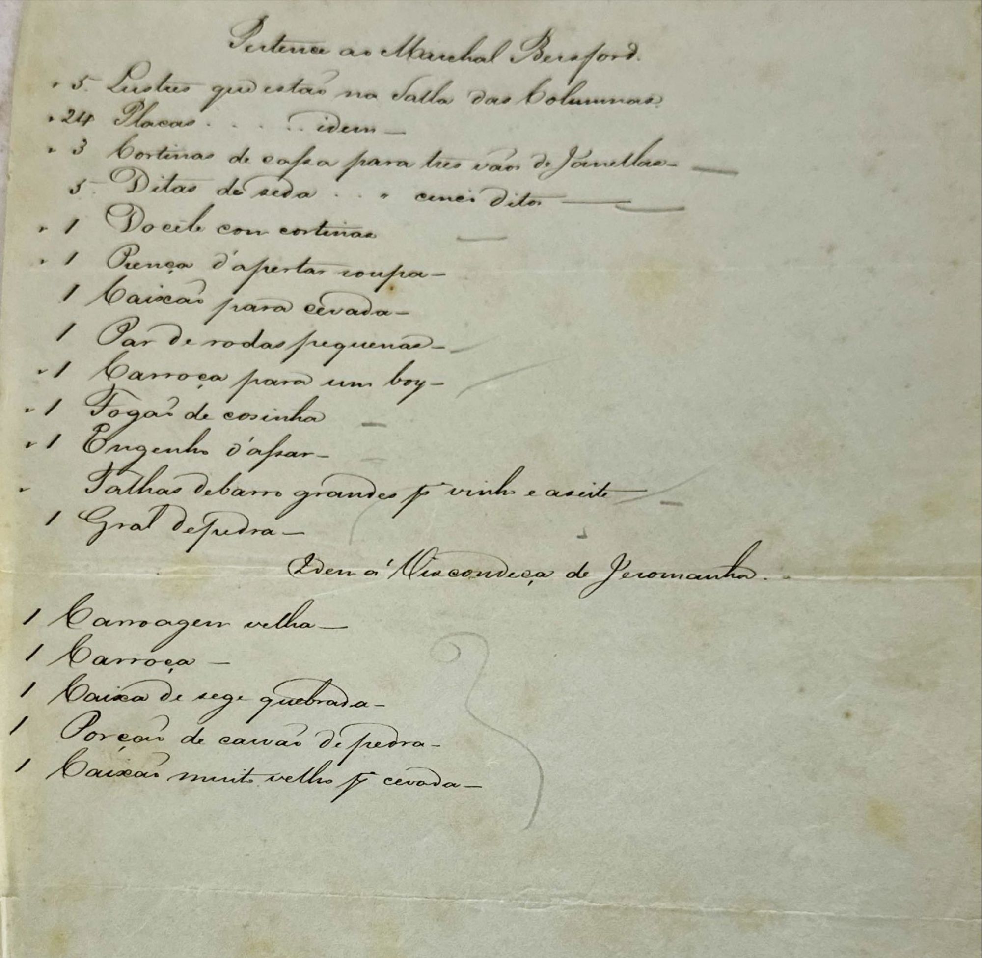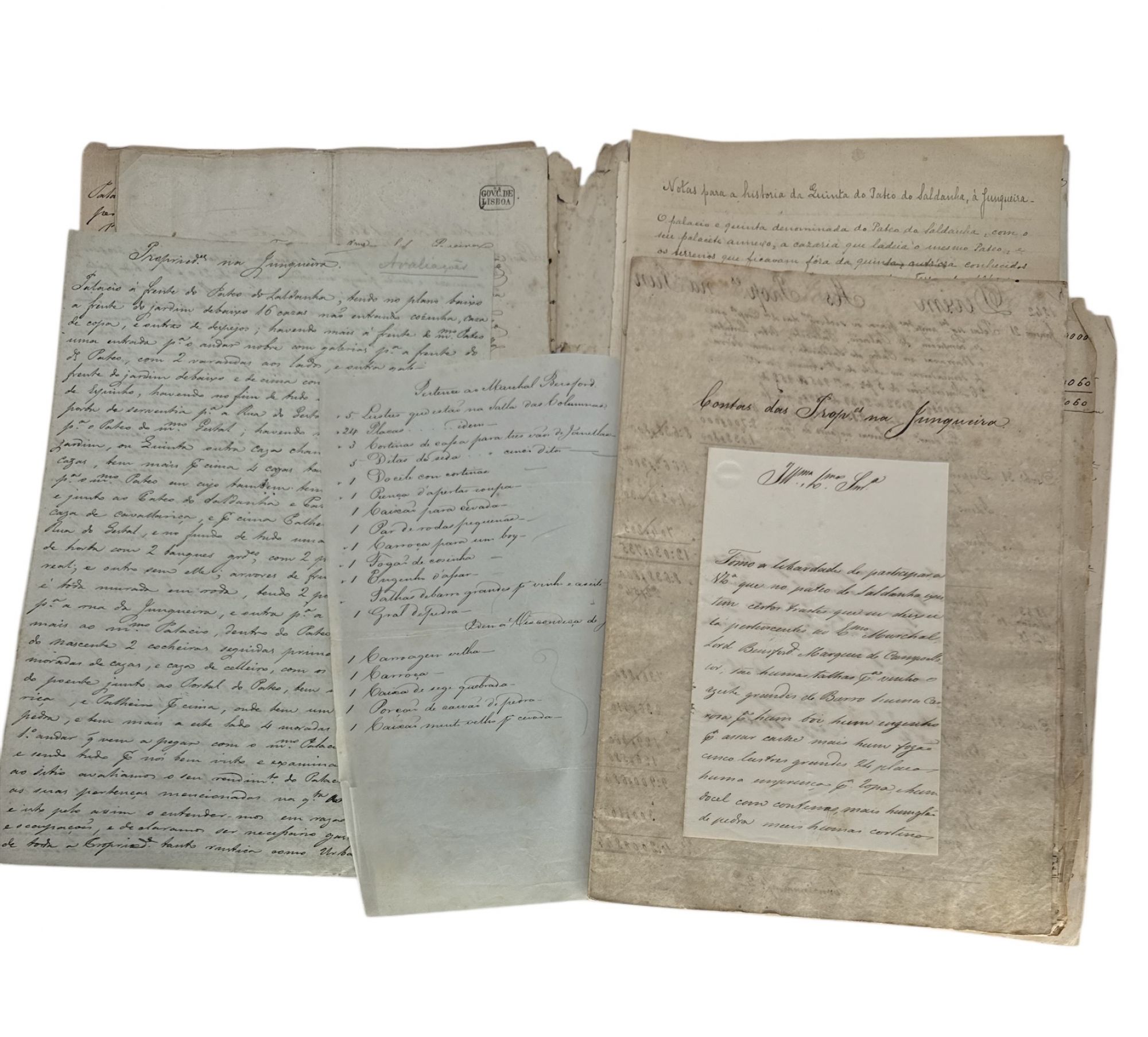 Conjunto valioso e curioso de documentos respeitantes ao Palácio conhecido como “Palácio da Ega, Palácio do Pátio do Saldanha ou Palácio dos Condes da Ega”, onde viveram a Família Saldanha, os Condes da Ega, Junot e o Marechal Beresford usando como quartel-general e também como hospital das tropas anglo-lusas e do, durante o domínio britânico sobre Portugal. Inclui escrituras, petições, inventários, despesas, empréstimos do Barão da Folgosa ao Conde da Ega, copias de escrituras, avaliações do Palácio, etc. Conjunto enriquecido com apontamentos históricos sobre o Palácio pelo Conde da Folgosa. Abrange o período da entrada no Palácio do Marechal Beresford depois dos condes da Ega se terem exilado em consequência da acusação de ter Favorecido Junot na Guerra Peninsular. Inclui alguns inventários pertencentes ao dito Marechal mas também ao Marquez de Campo Maior e a escritura de venda do Palácio ao Barão da Folgosa