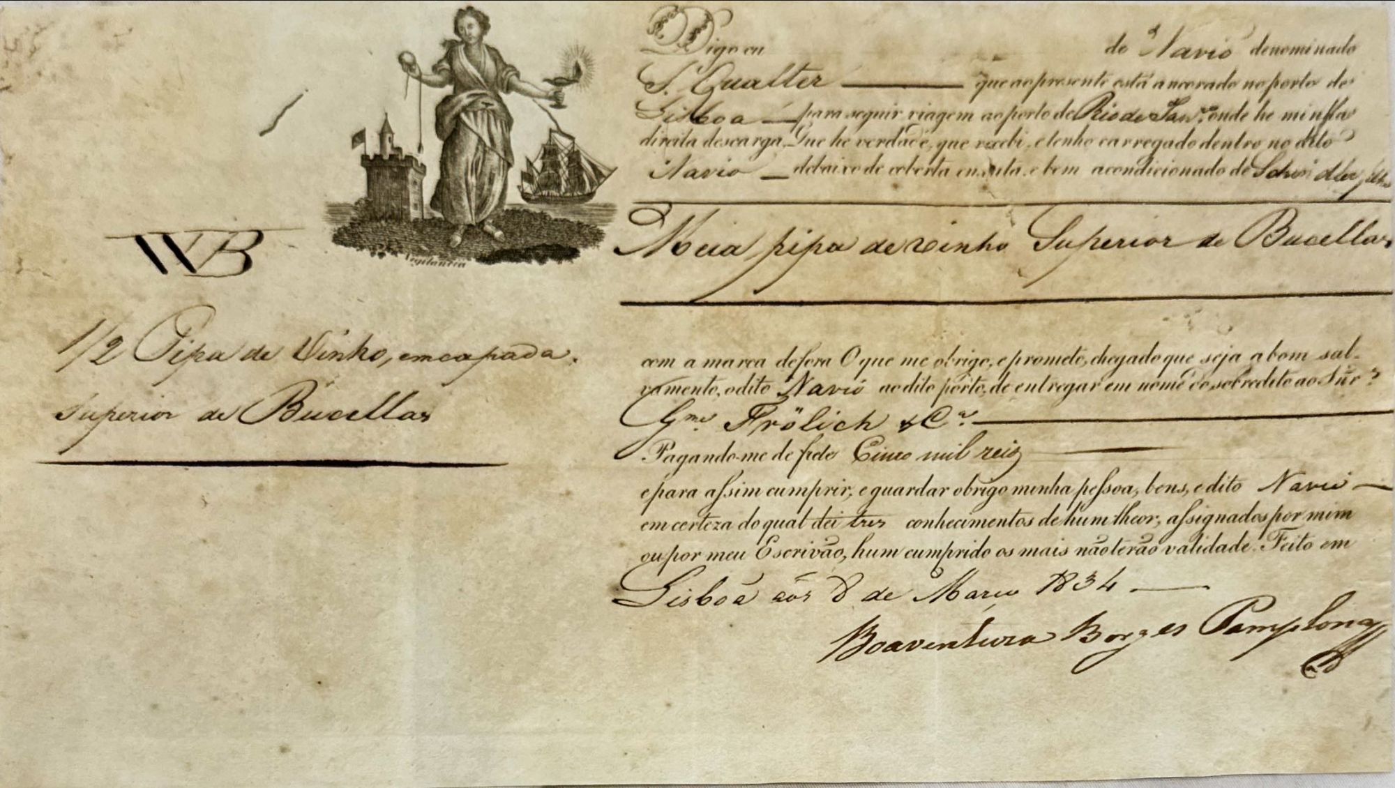 Recibo de entrega de 1/2 pipa de vinho superior de Bucelas ao navio ancorado no Porto de Lisboa, para entregar no Porto do Rio de Janeiro. Pagou de frete cinco mil reis.