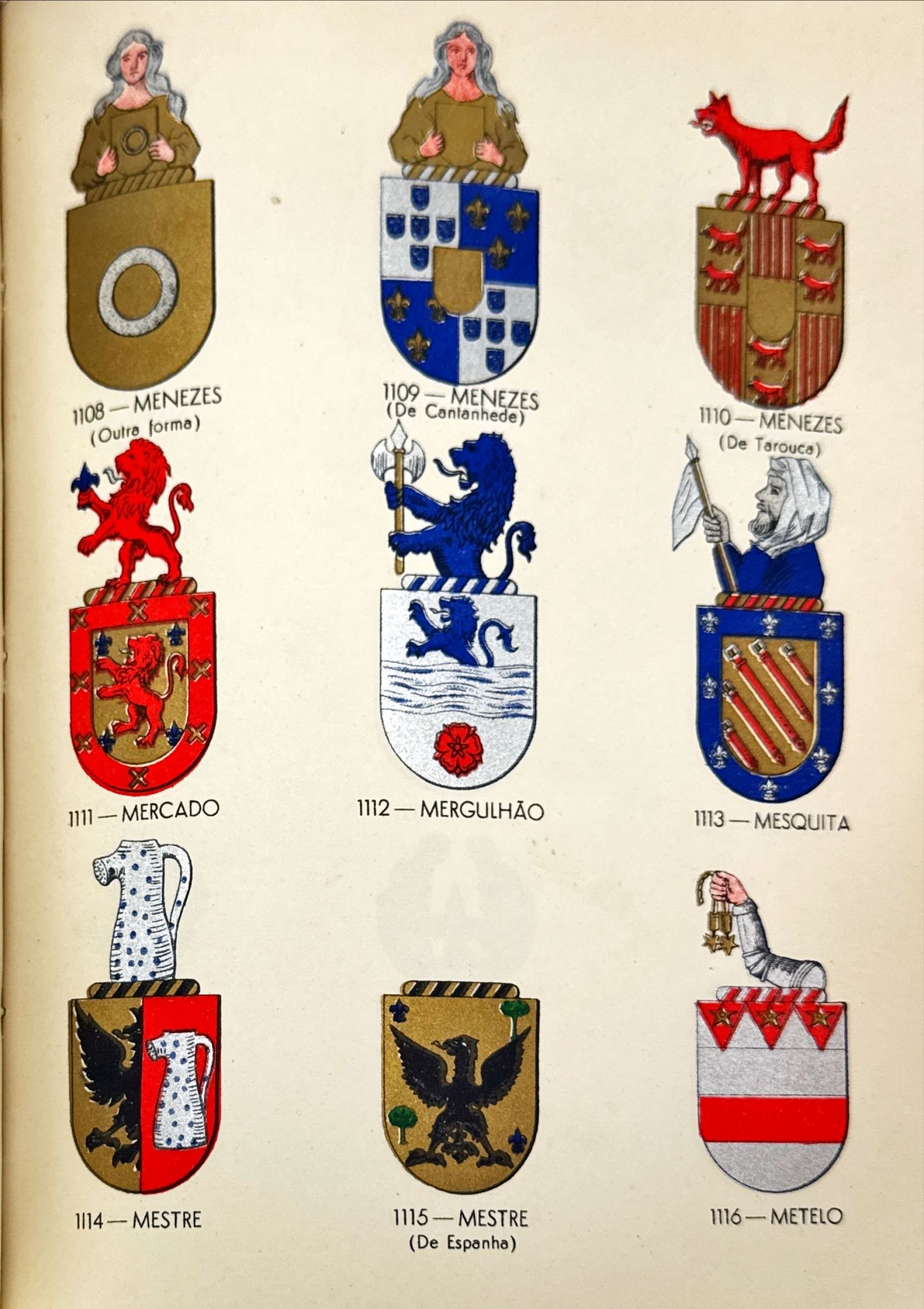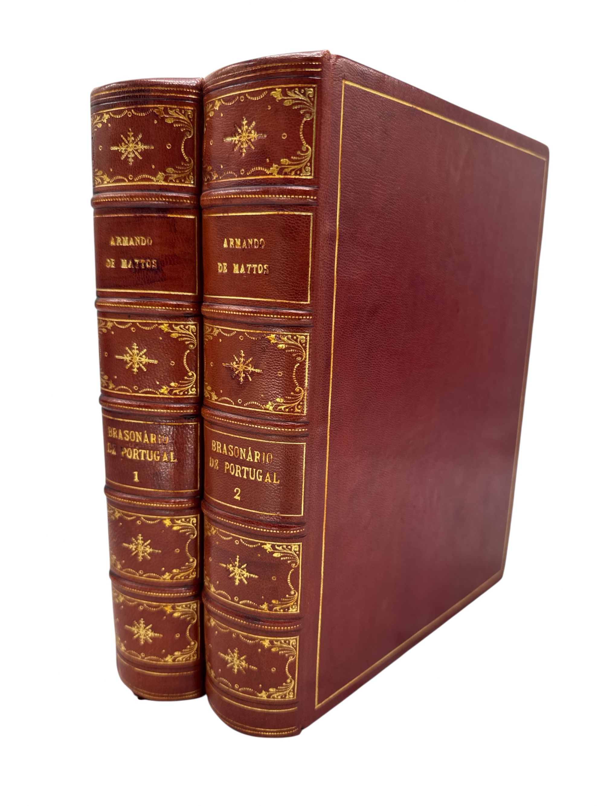 Edição original desta rara publicação. Profusamente ilustrada com 1870 brasões de famílias a cores, desenhos de Gouveia Portuense. Boas encadernações inteiras de pele, com ferros a ouro nas lombadas e pastas. Conserva as capas de brochura. Bons exemplares.