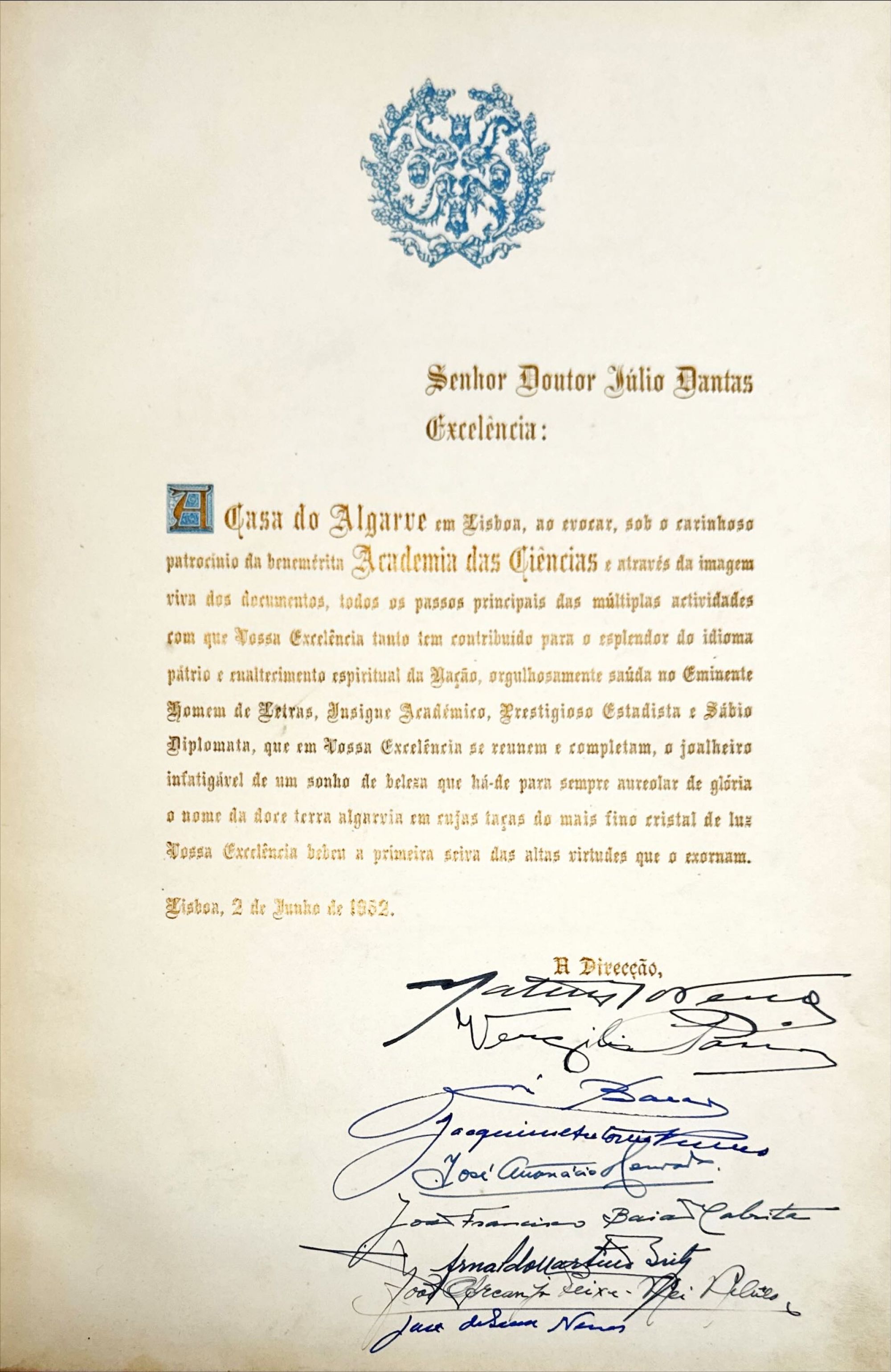 MENSAGEM DE SAUDAÇÃO AO DR. JULIO DANTAS. Entregue pela Casa do Algarve em 1952.
