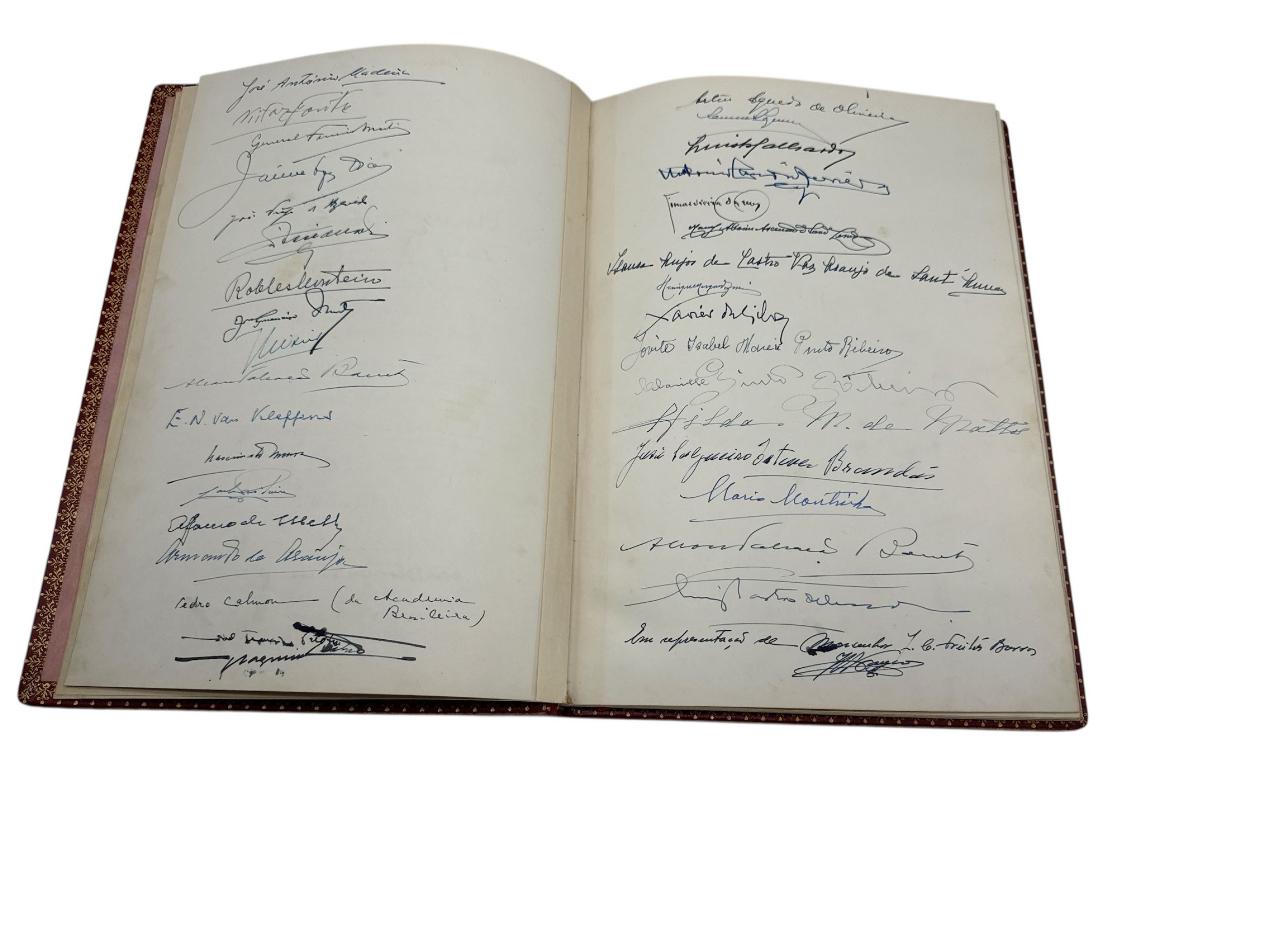 Livro de dezenas de assinaturas da Casa do Algarve de Lisboa e de várias Camaras Municipais do Algarve, em reconhecimento deste ilustre algarvio nascido em Lagos. Encadernação artística com elegantes ferros a ouro na lombada, pastas e seixas. Com uma xilogravura gravada na pasta da frente do Mestre Manuel Cabanas.