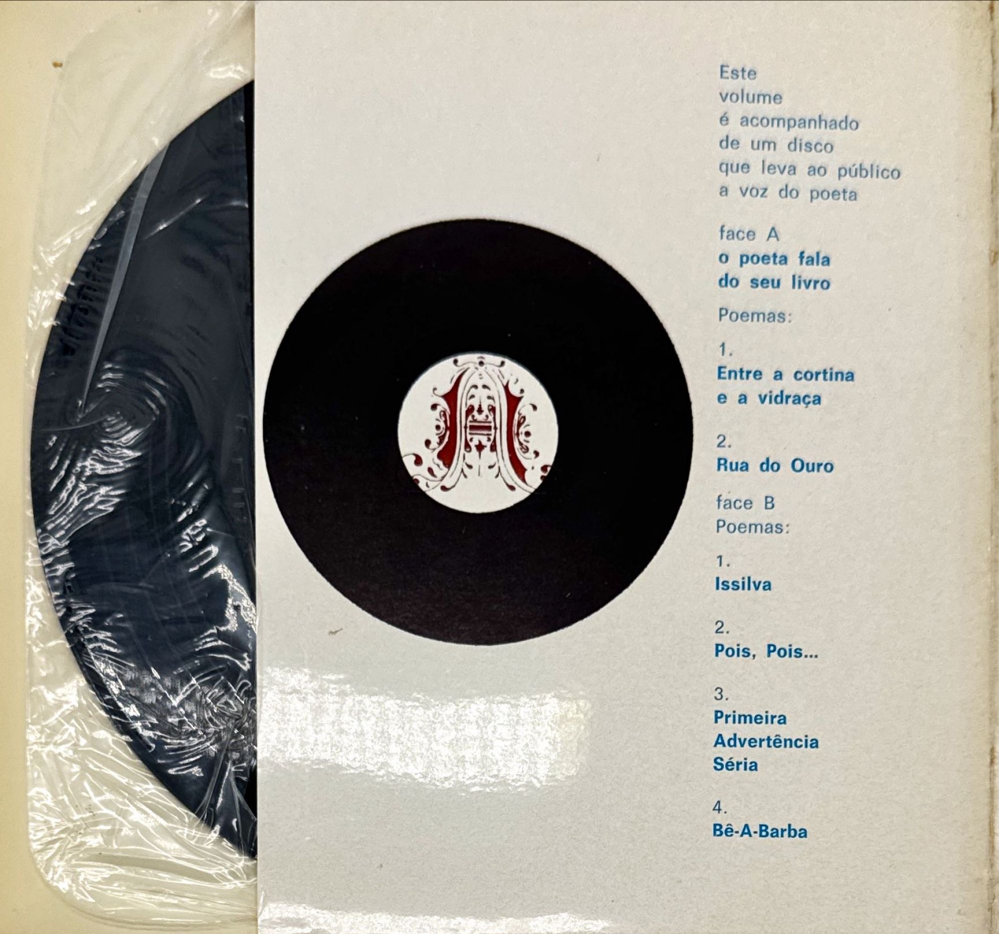 Edição original. Acompanhada de um disco com poemas do autor. Valorizado com dedicatória autografa do escritor. Bom exemplar. Encadernação em sintético com os dizeres a ouro na pasta da frente. Conserva as capas de brochura e lombada.