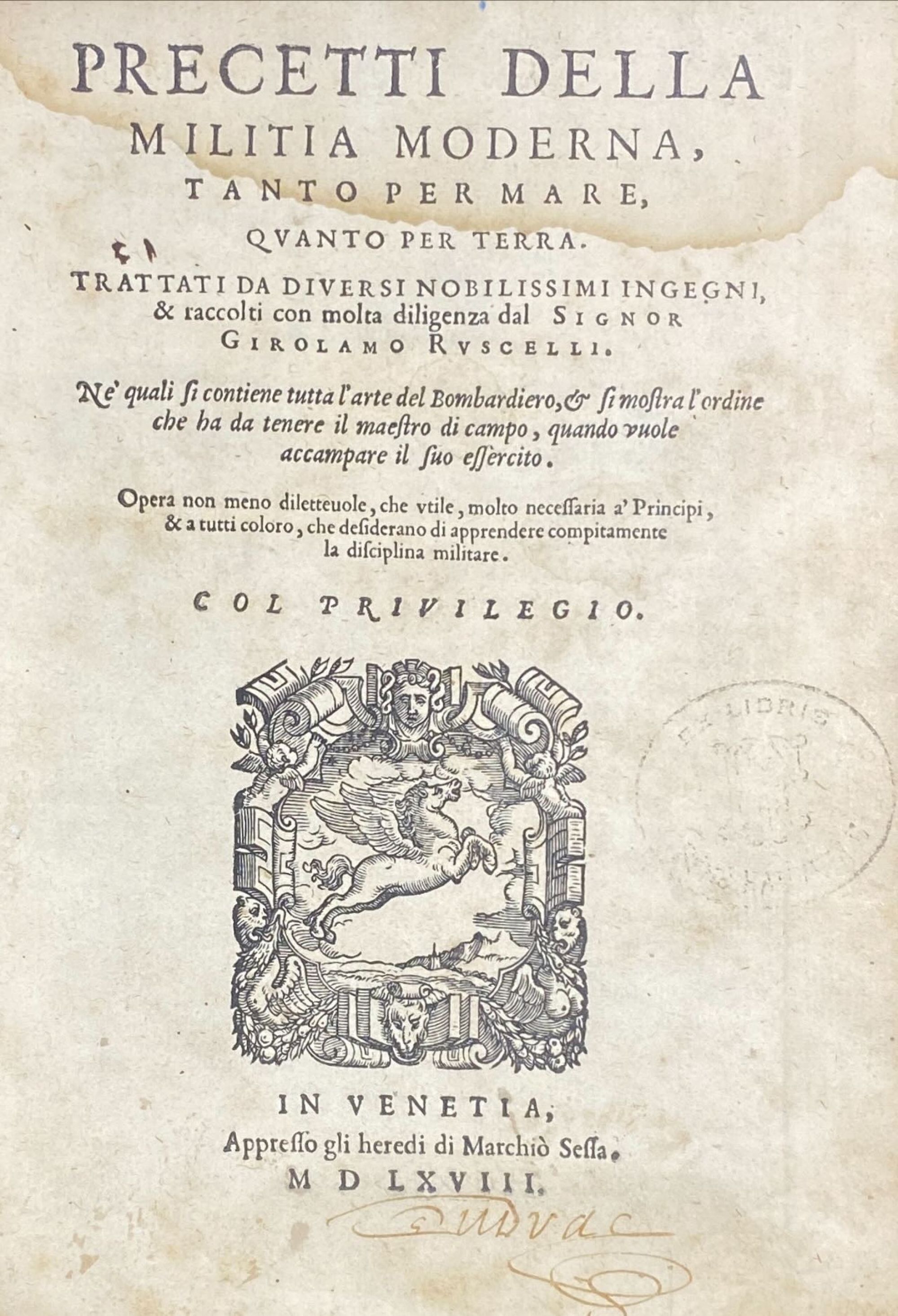 RUSCELLI, Girolamo. - PRECETTI DELLA MILITIA MODERNA TANTO PER MARE, QUANTO PER TERRA. Trattati da diversi nobilissimi ingegni & raccolti con molta diligenza del Signor...Junto com: DELLA OSSERVANZA MILITARE del Capitan Francesco Ferrati. Libri Dve. Venetia, 1568. In-8º de [30], 101 págs. Junto com: IL SOLDATO DI M. DOMENICO MORA.