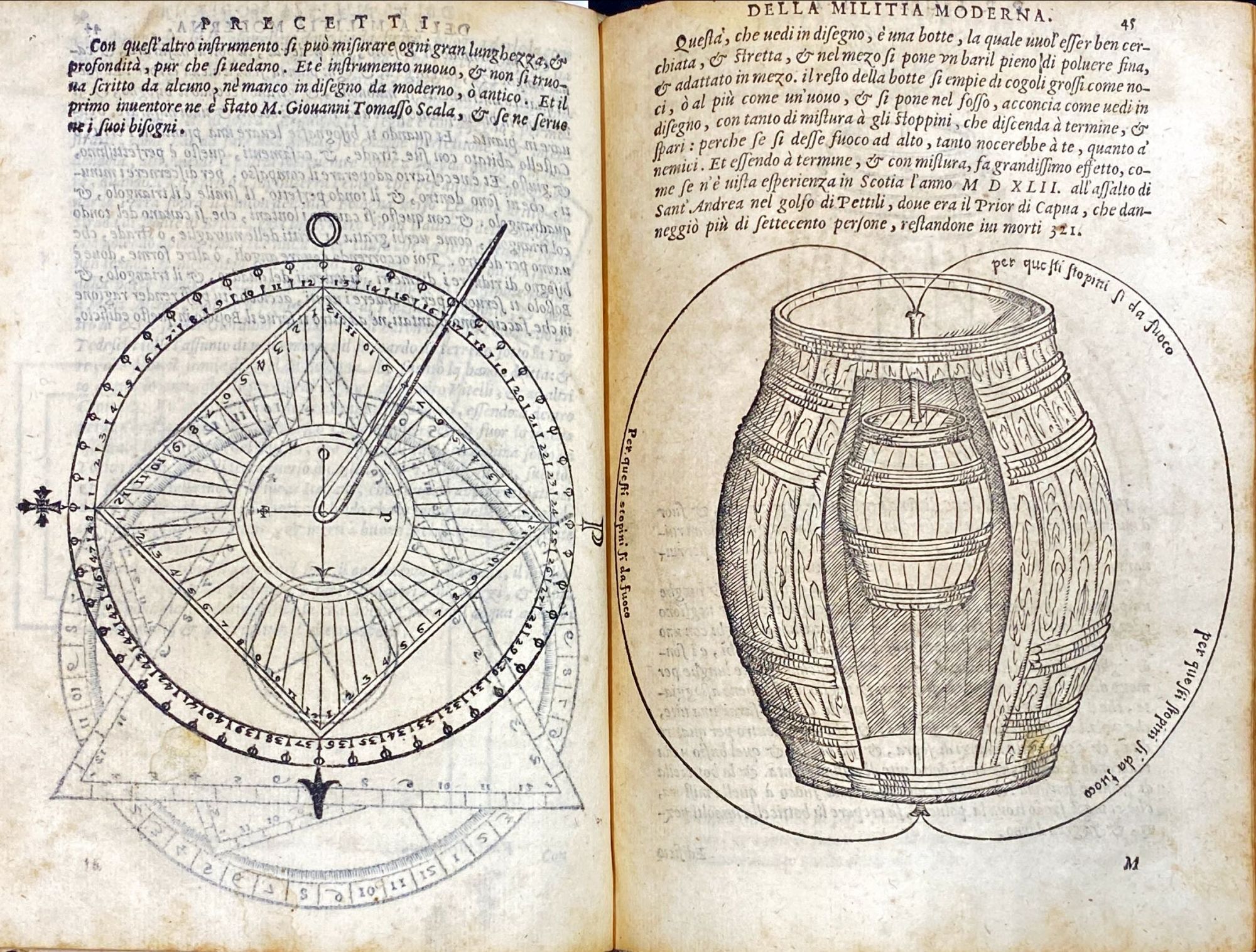 Conjunto de 3 obras em primeiras edições do Século XVI, raras e valiosas. A primeira obra, é um interessante tratado militar, possivelmente o melhor do Renascimento italiano, dedicado quase inteiramente à artilharia. Ou seja, todas as armas de guerra projetadas para disparar grandes projéteis utilizando uma carga explosiva como elemento propulsor. Está ilustrado com algumas gravuras em madeira, meio plano e plano inteiro, de diferentes armas, suas diferentes partes, o cano, o tubo metálico de determinado calibre e comprimento, etc.