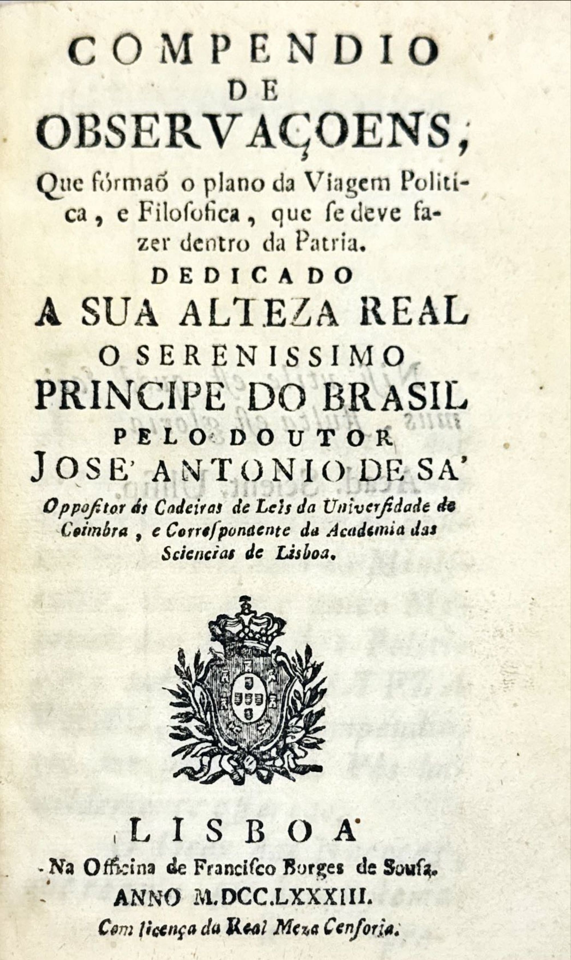 SÁ, José António de. - COMPENDIO DE OBSERVAÇOENS, Que fórmão o plano da Viagem Politica, e Filosofica, que se deve fazer dentro da Patria... Dedicada ao Principe do Brasil. Lisboa. Na Officina de Francisco Borges de Sousa. 1783. In-8º de [18], 248, [2] págs. Enc.
