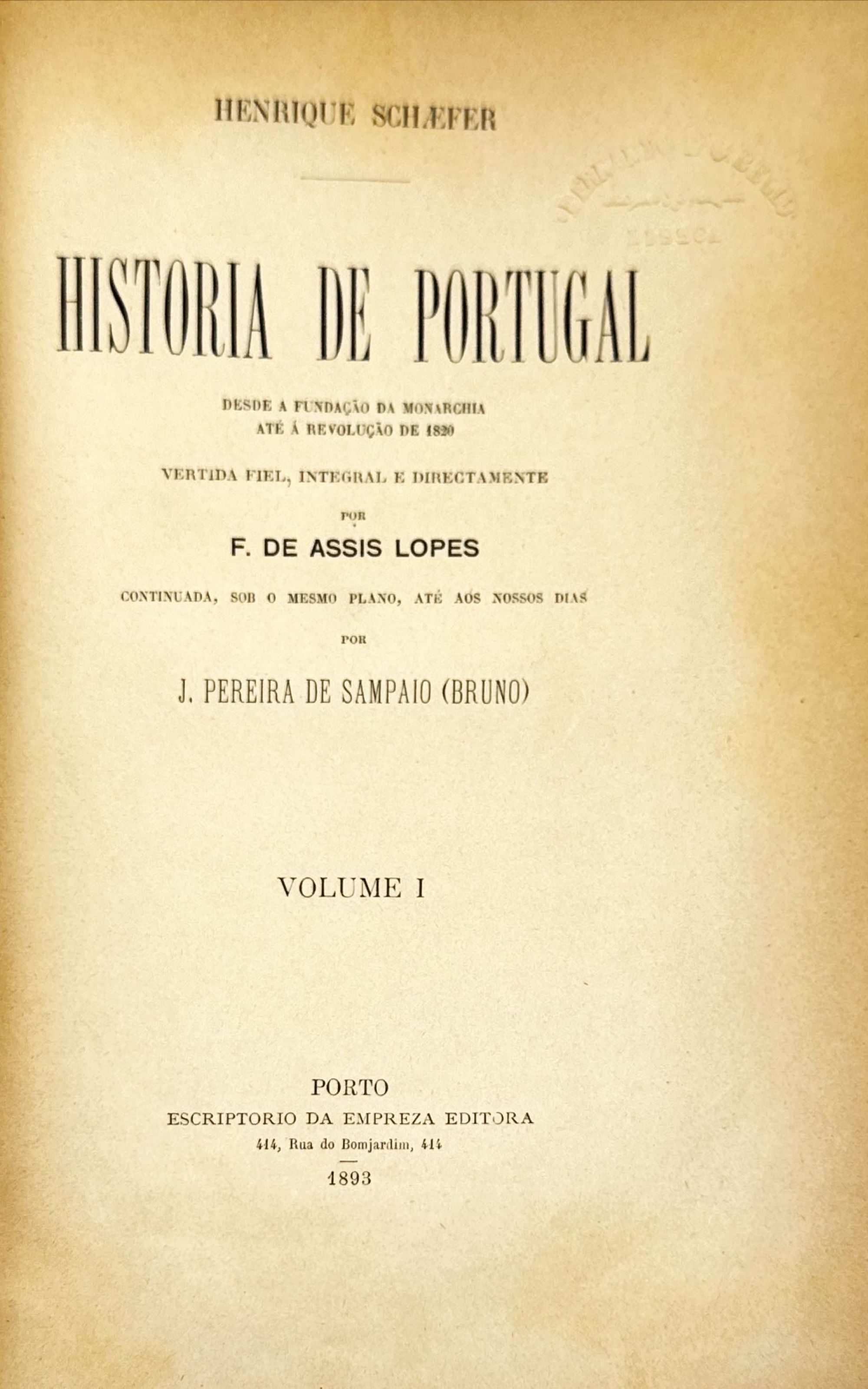 SCHAEFER, Henrique. - HISTORIA DE PORTUGAL. Desde a fundação da monarchia até á revolução de 1820. Vertida fiel, integral e directamente por F. de Assis Lopes. Continuada, sob o mesmo plano, até aos nossos dias por J. Pereira de Sampaio (Bruno). Volume I (ao V). Porto. Escriptorio da Empreza Editora. 1893 (a 1898). 5 Vols. In-8º Encs.