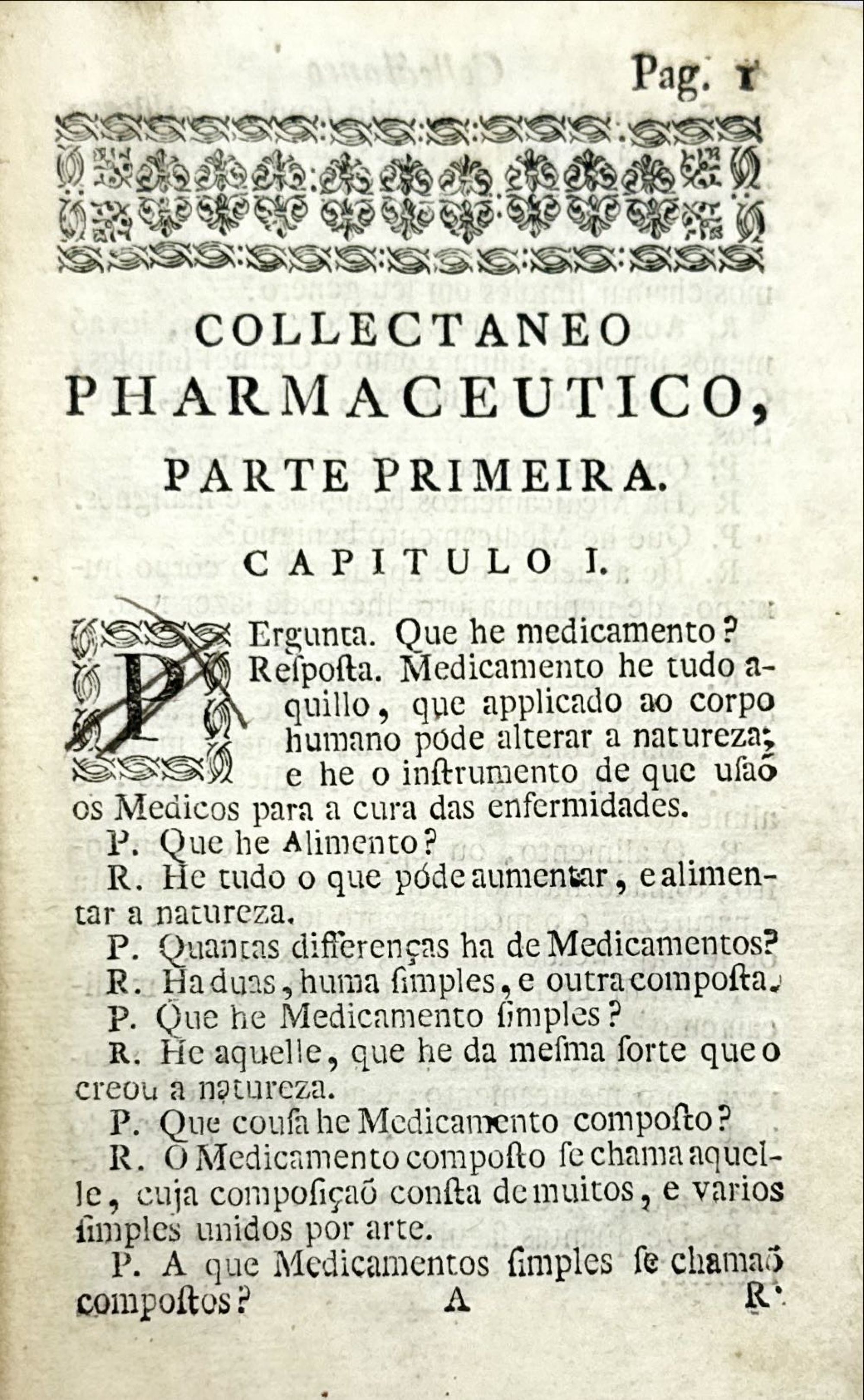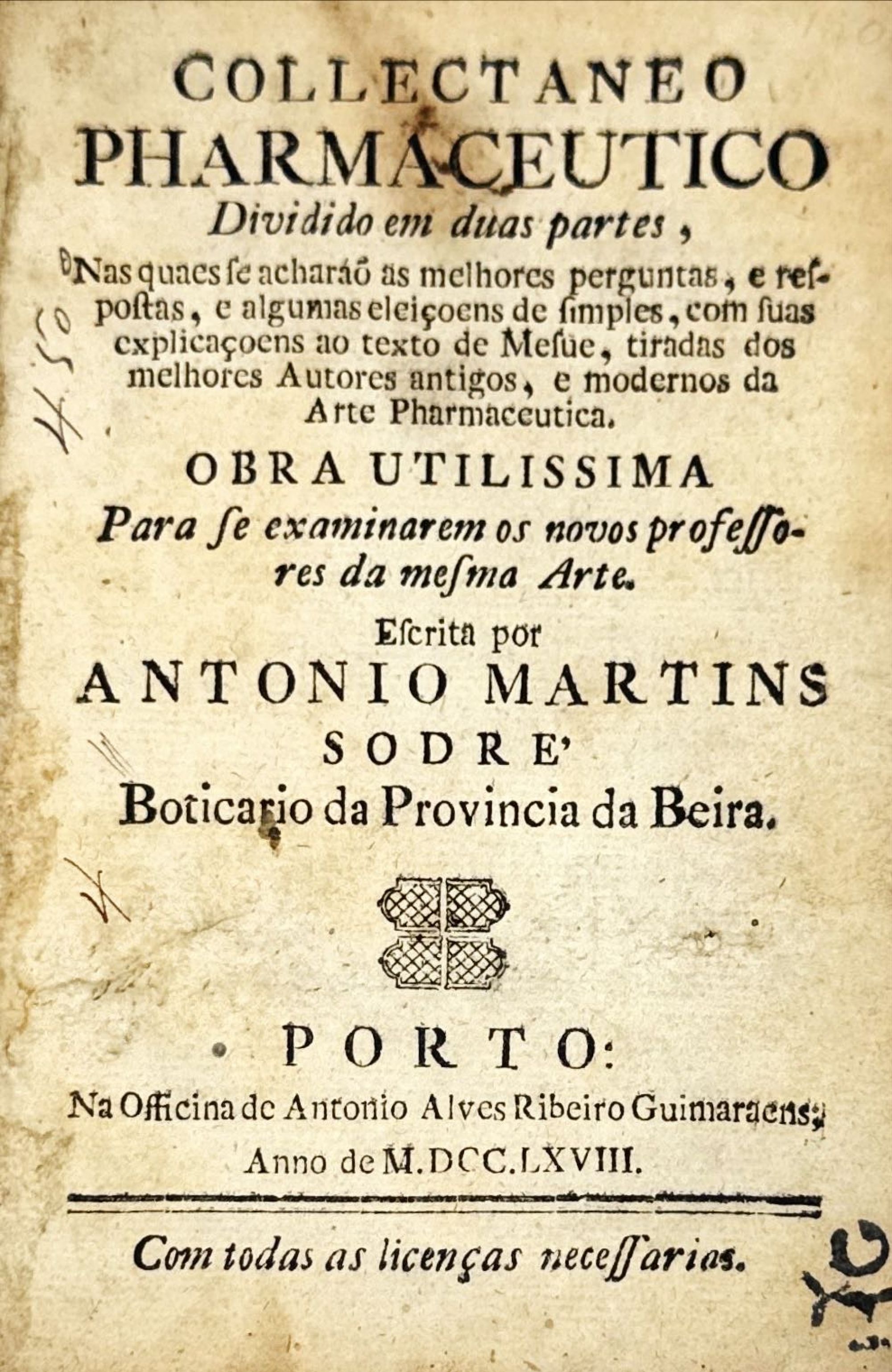 SODRÉ, Antonio Martins (António dos Mártires). - COLLECTANEO PHARMA-CEUTICO divido em duas partes, nas quaes se acharáõ as melhores perguntas, e respostas, e algumas eleiçoens de simples, com suas explicaçoens ao texto de Mesue, tiradas dos melhores autores antigos, e modernos da arte pharmaceutica. Obra utilissima para se examinarem os novos professores da mesma arte. Porto. Antonio Alves Ribeiro Guimaraens. 1768. In-8º de [32], 188 págs. Enc.