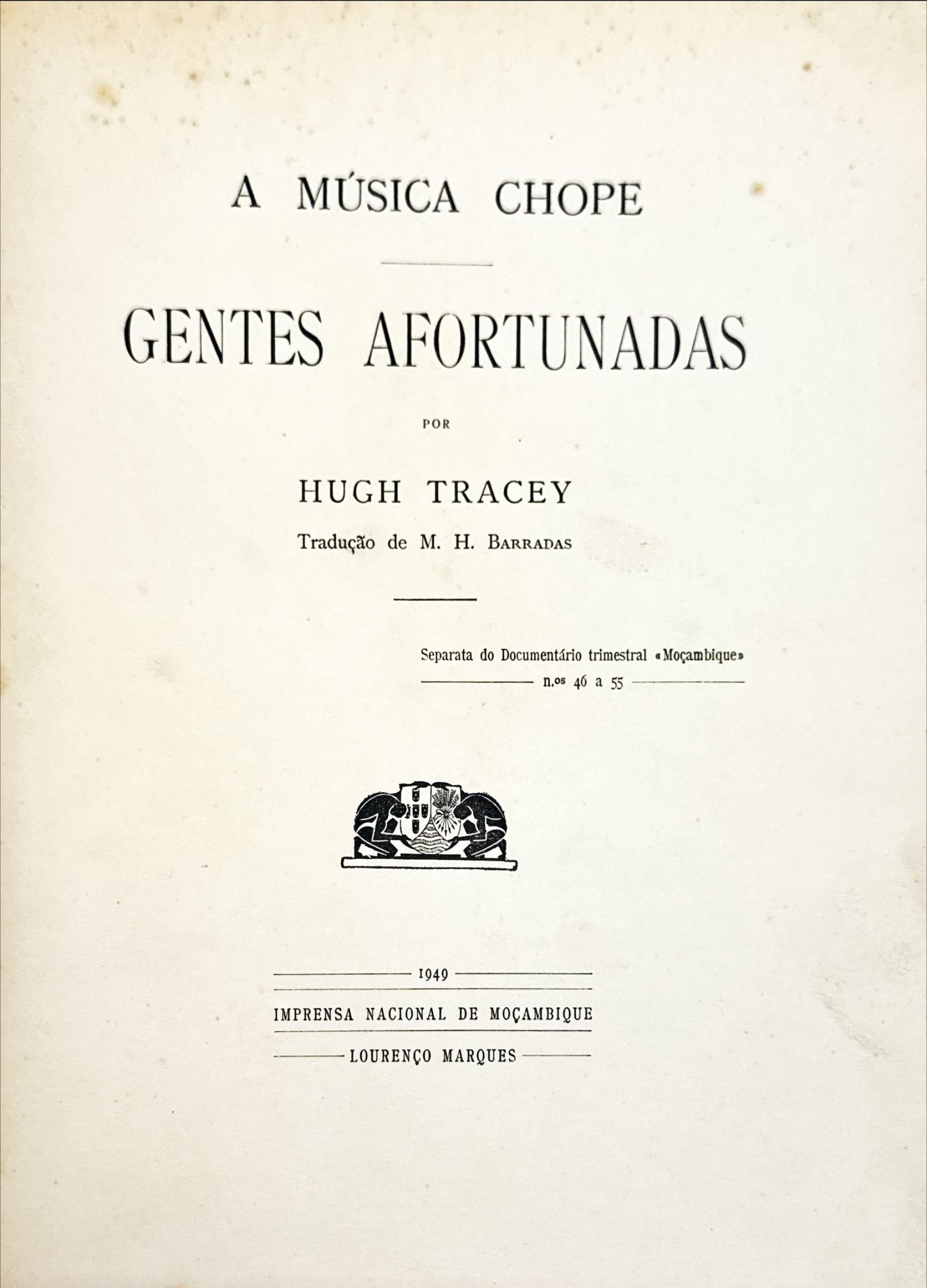 TRACEY, Hugh. - A MÚSICA CHOPE. GENTES AFORTUNADAS. Tradução de M. H. Barradas. Lourenço Marques. Imprensa Nacional de Moçambique. 1949. In-4º de X, 273 págs. Enc.