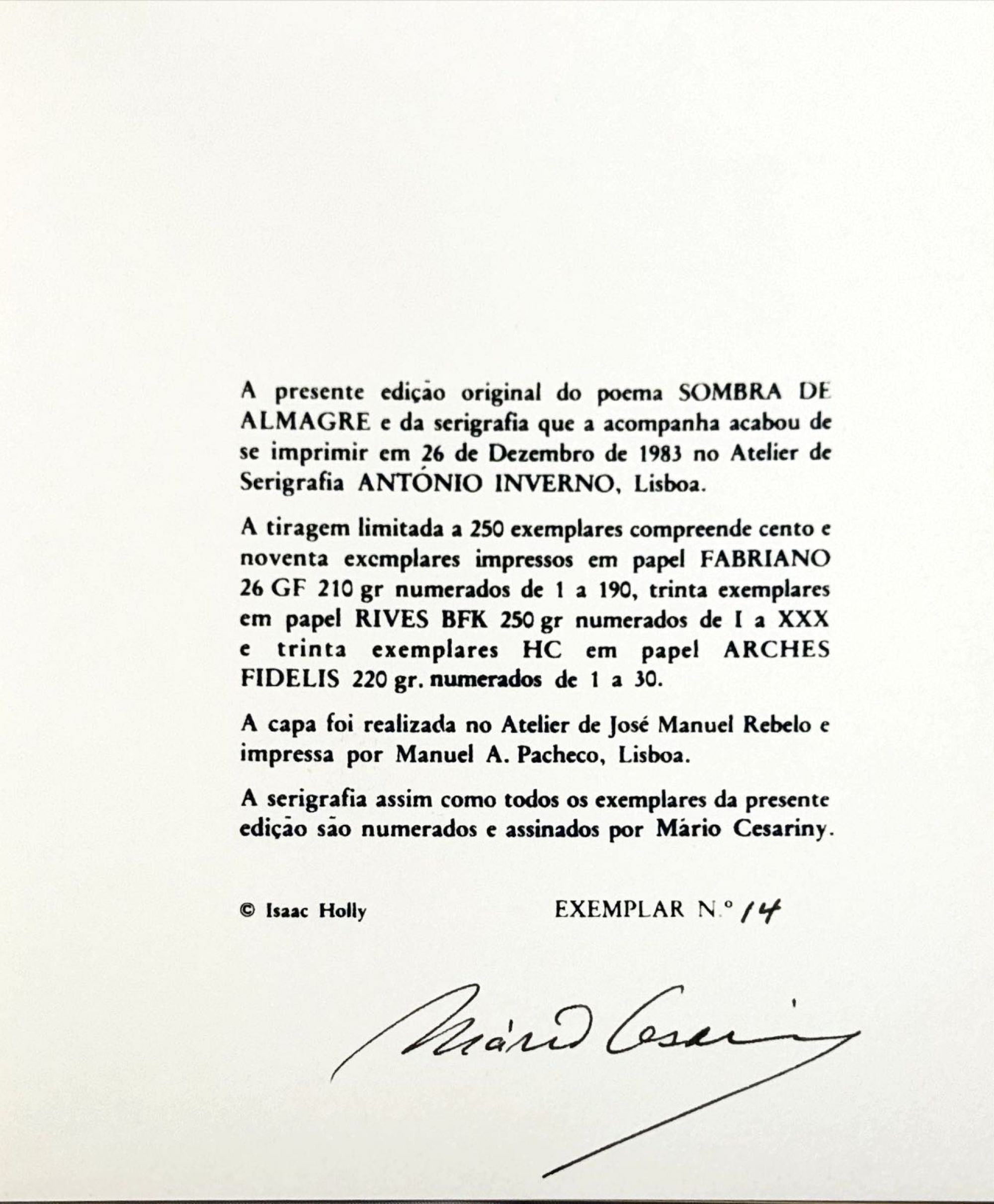 VASCONCELOS, Mário Cesariny de. - SOMBRA DE ALMAGRE. Poema e serigrafia de... Lisboa. Atelier de António Inverno. 1983. In-8º. Br.