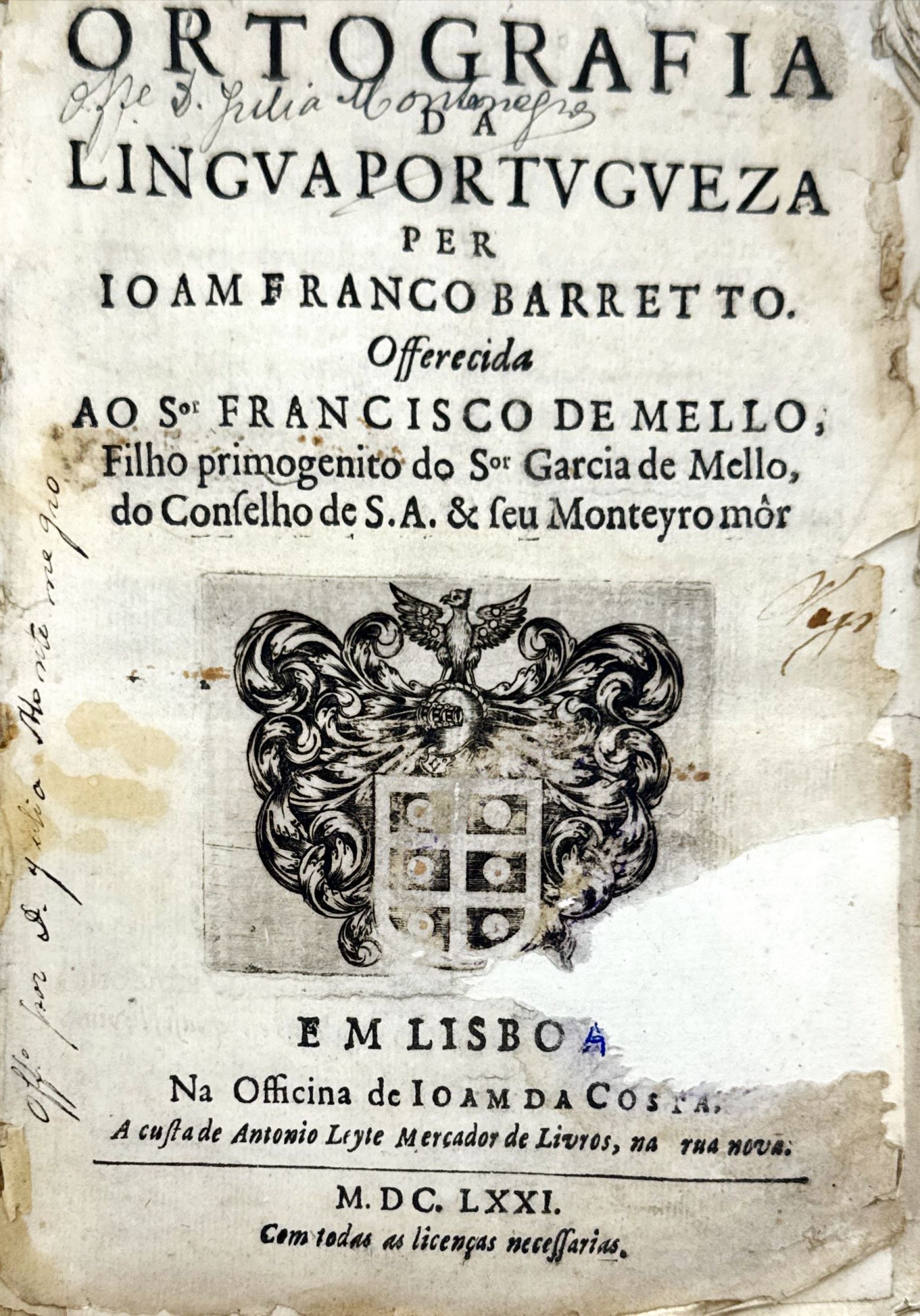BARRETO, João Franco. - ORTOGRAFIA DA LINGVA PORTVGVEZA. Lisboa. Na Officina de Ioam da Costa. 1671. In-8º de [16], 279 págs. Enc.