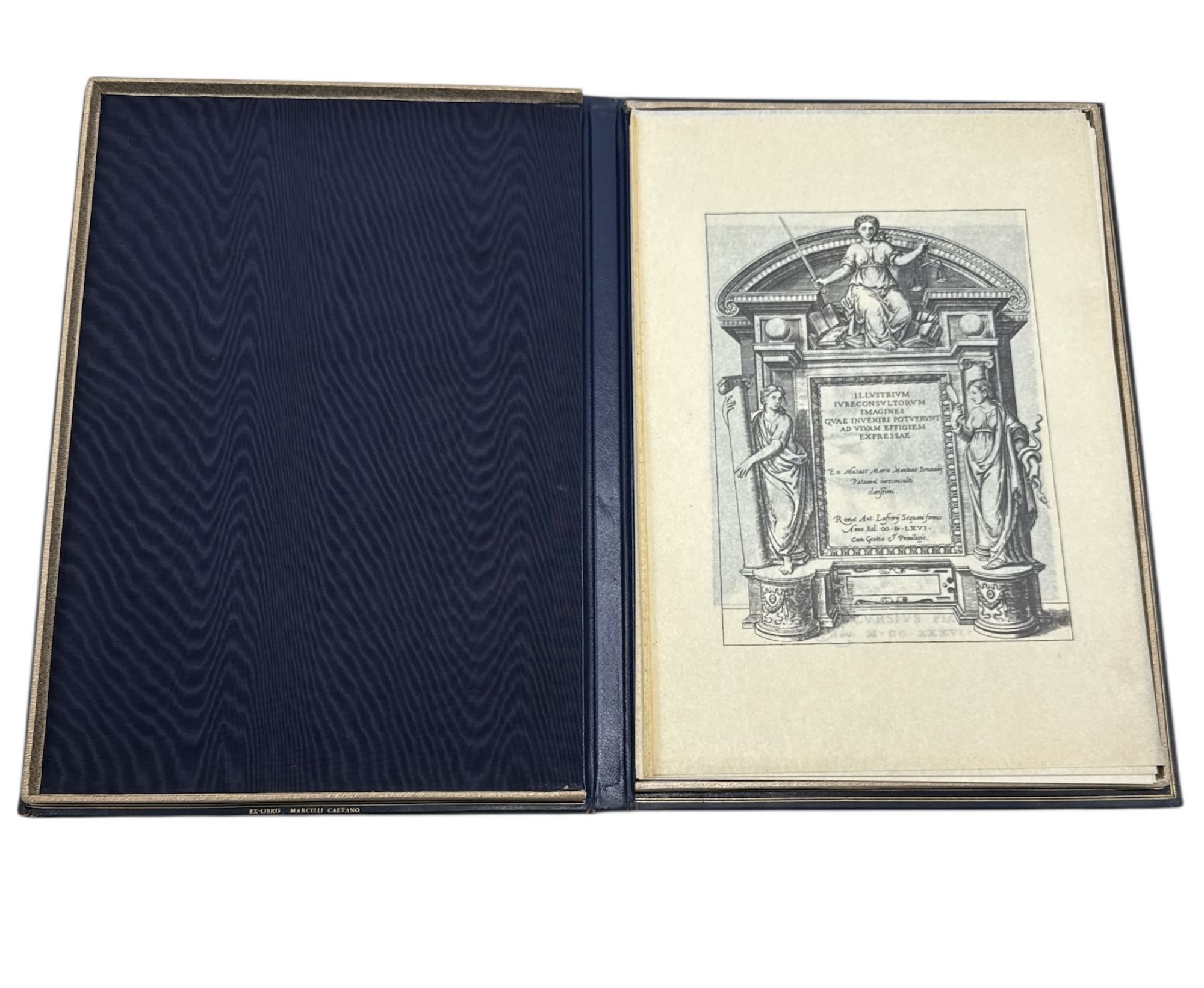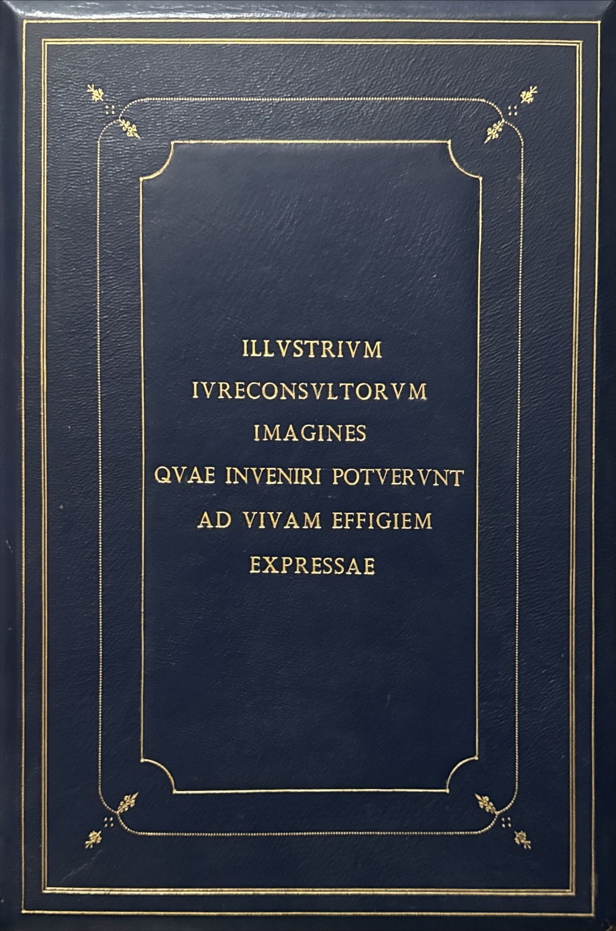 Edição luxuosa fac-similada conforme a edição de Roma de 1566. Com 24 retratos de juristas ilustres. As gravuras basearam-se num conjunto de retratos da coleção de Mantova Benavides, jurista de Pádua. No meio dos retratos dos 24 juristas, encontra-se, inexplicavelmente, a imagem de Dante Alighieri. Exemplar da Biblioteca de Marcelo Caetano com o seu ex-libris gravado na pasta da encadernação a ouro. Acondicionado em pasta em pele com ferros a ouro na lombada, pastas e seixas da autoria de Victor Santos. Guardas em seda.