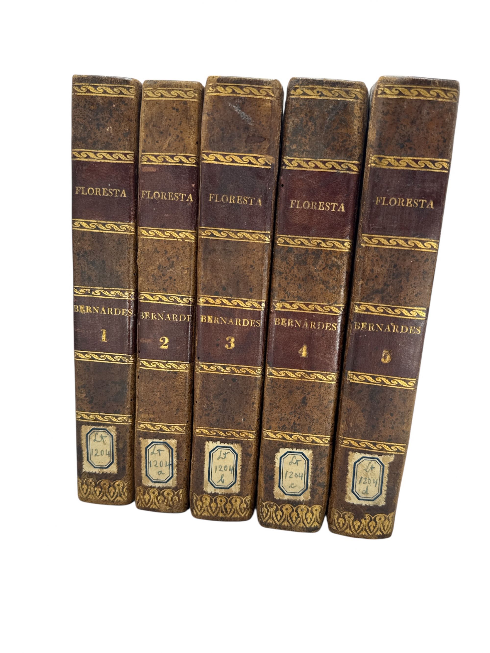 BERNARDES, Pe. Manuel. - NOVA FLORESTA, OU SYLVA DE VARIOS APOPHEGMAS E DITOS sentenciosos espiritues, e moraes, com reflexões. Tomo I (ao V). Lisboa. Na Officina de Valentim da Costa Deslandes. e outras. 1706 (a 1728). 5 Vols. In-8º Encs.