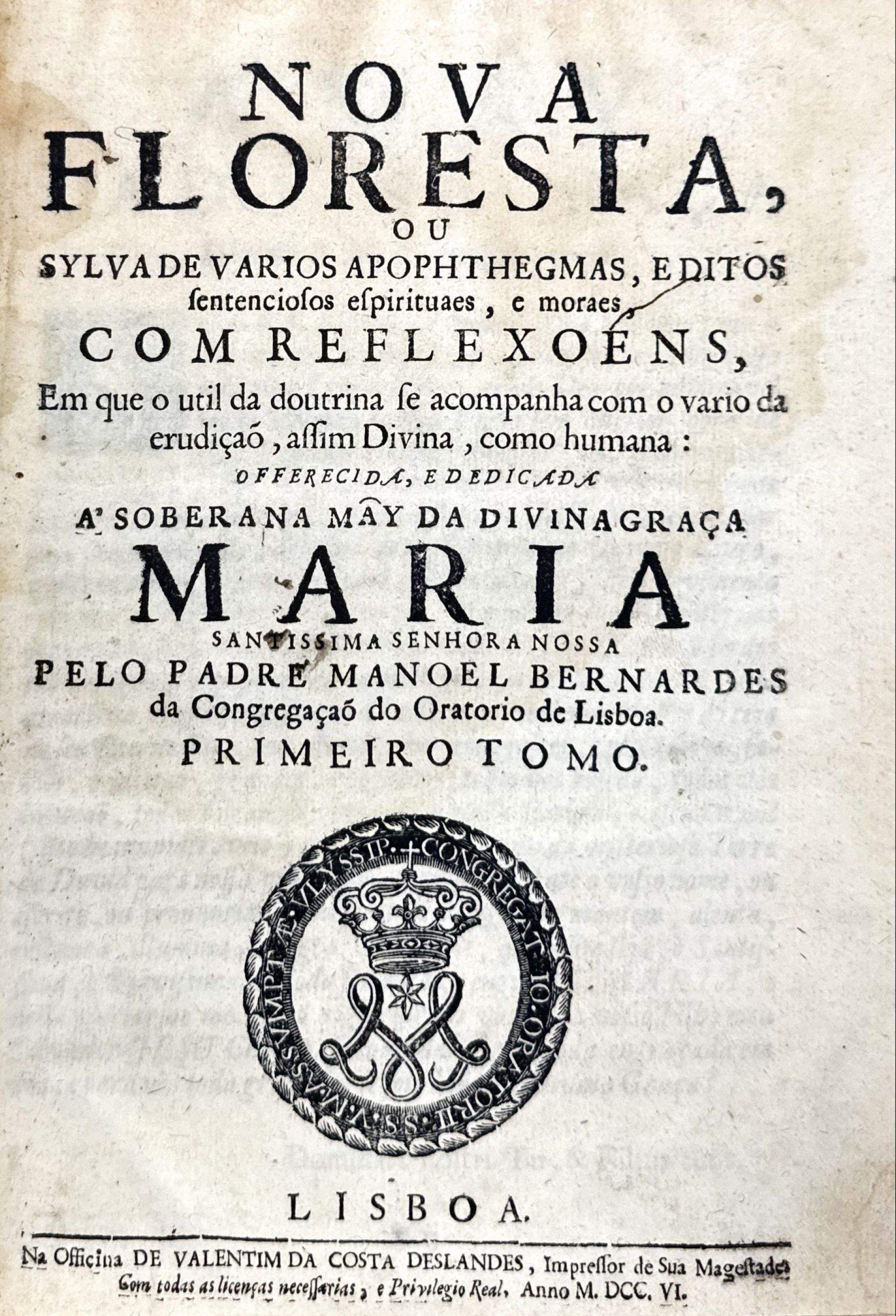 BERNARDES, Pe. Manuel. - NOVA FLORESTA, OU SYLVA DE VARIOS APOPHEGMAS E DITOS sentenciosos espiritues, e moraes, com reflexões. Tomo I (ao V).