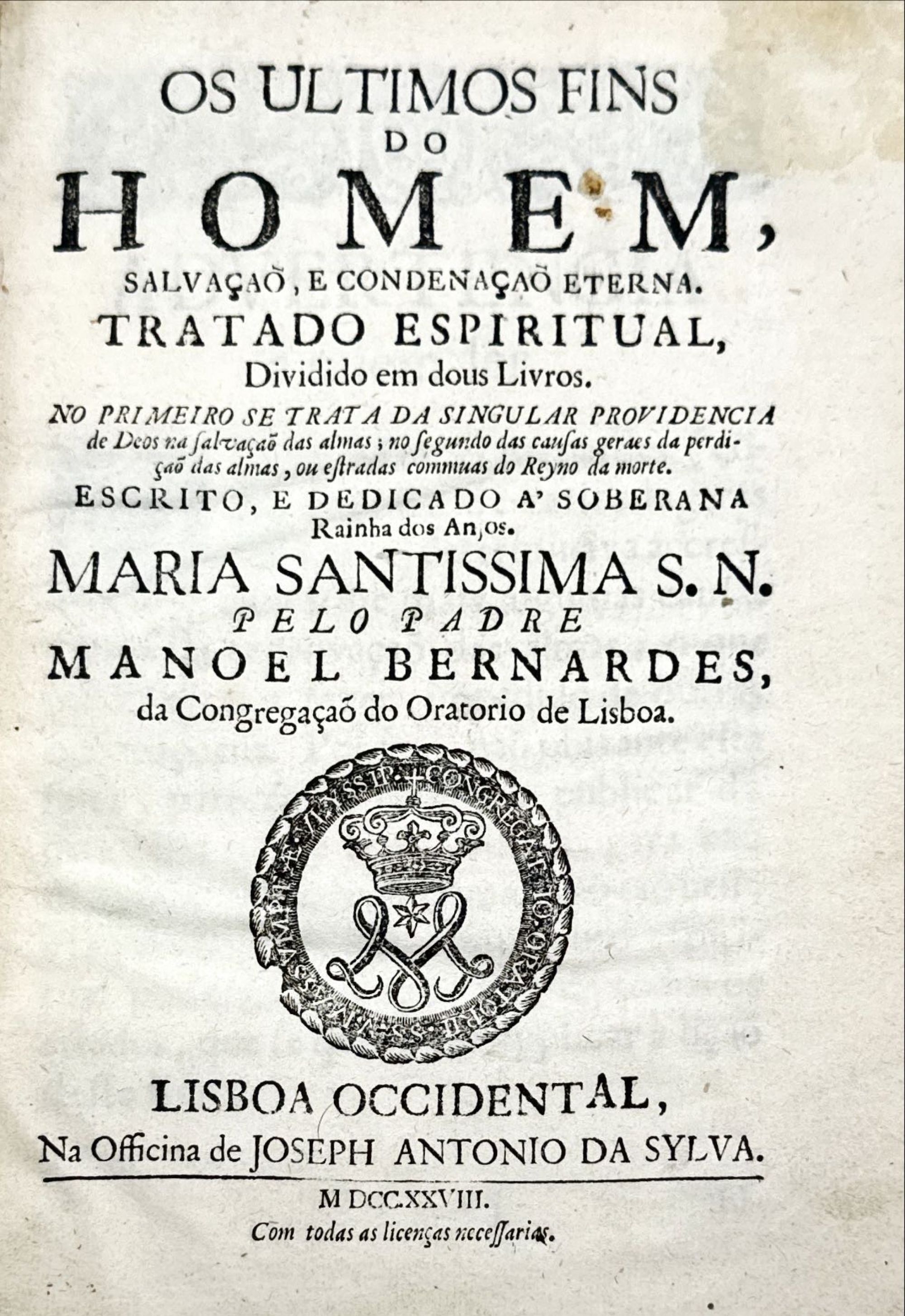 BERNARDES, Pe. Manuel. - OS ULTIMOS FINS DO HOMEM, SALVAÇÃO, E CONDENAÇÃO ETERNA. TRATADO ESPIRITUAL Dividido em dous livros.