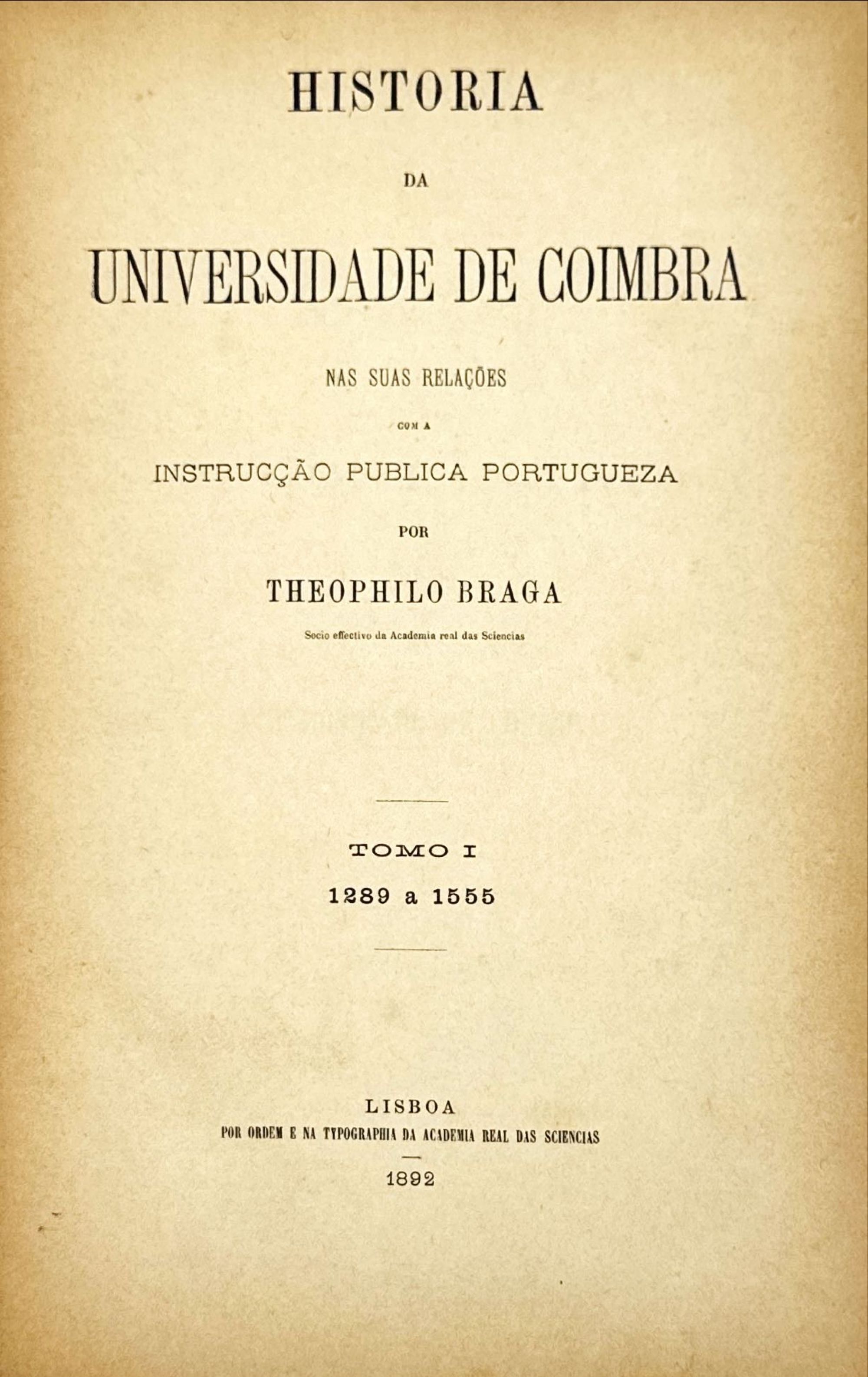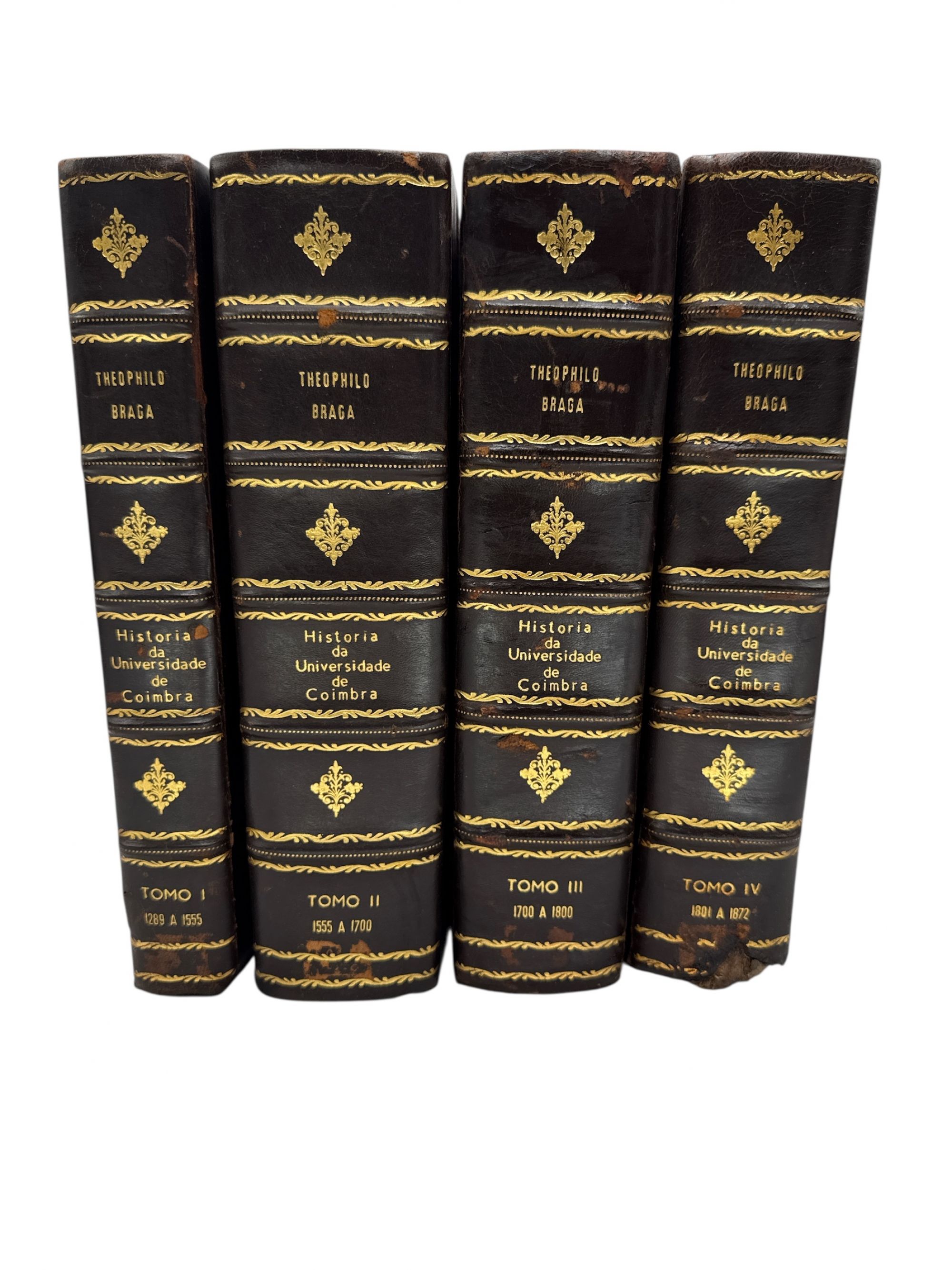 BRAGA, Teófilo. - HISTÓRIA DA UNIVERSIDADE DE COIMBRA NAS SUAS RELAÇÕES COM A INSTRUCÇÃO PUBLICA PORTUGUEZA. Tomo I - 1289 a 1555 (ao Tomo IV - 1801 a 1872).