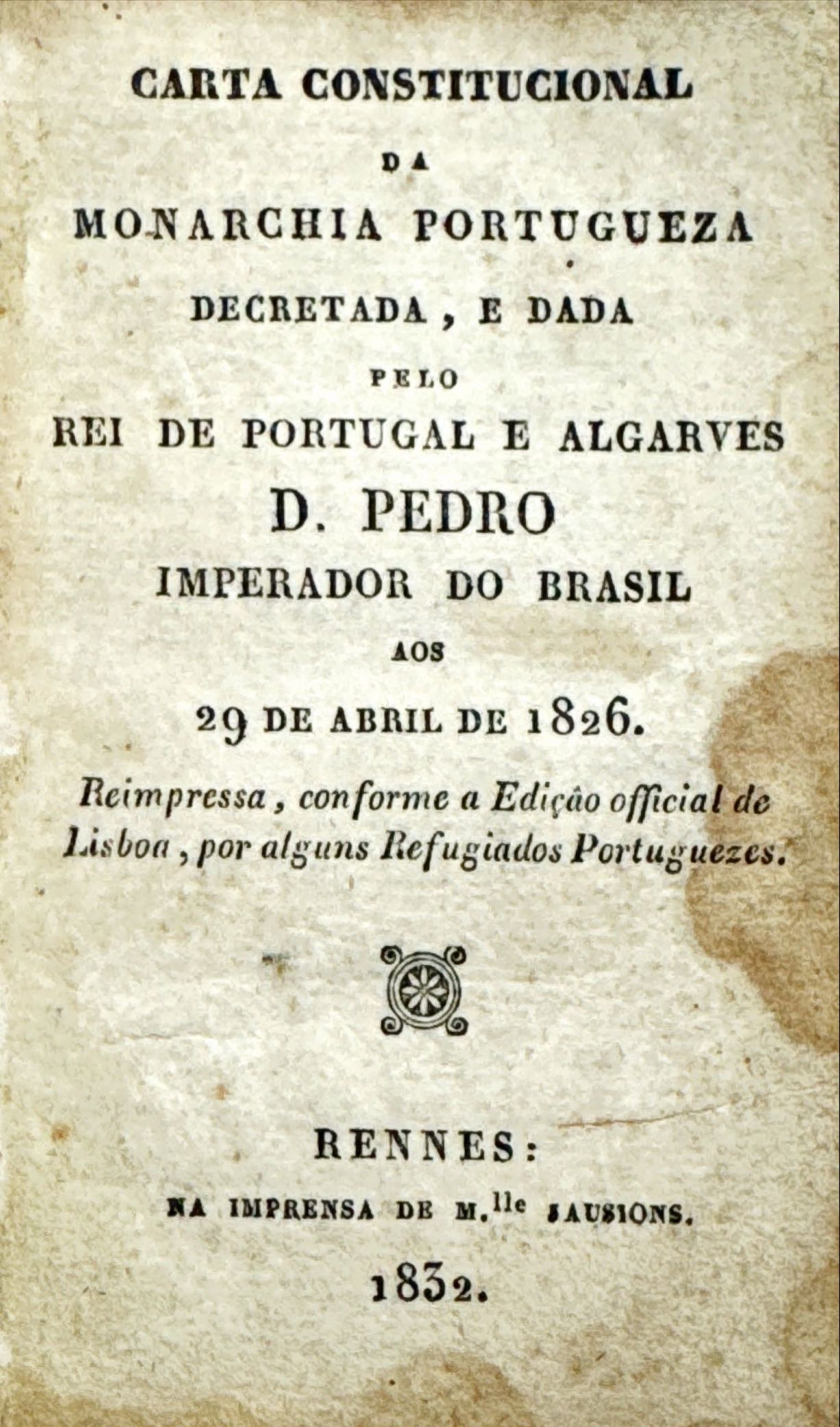 CARTA CONSTITUCIONAL DA MONARCHIA PORTUGUEZA. Decretada e dada pelo Rei de Portugal e Algarves D. Pedro Imperador do Brasil aos 29 de Abril de 1826. Reimpressa, conforme a edição oficial de Lisboa, por alguns refugiados Portuguezes. Rennes. Na Imprensa de M. Sausions. 1832. In-8º peq. de 62, [2] págs. Enc.