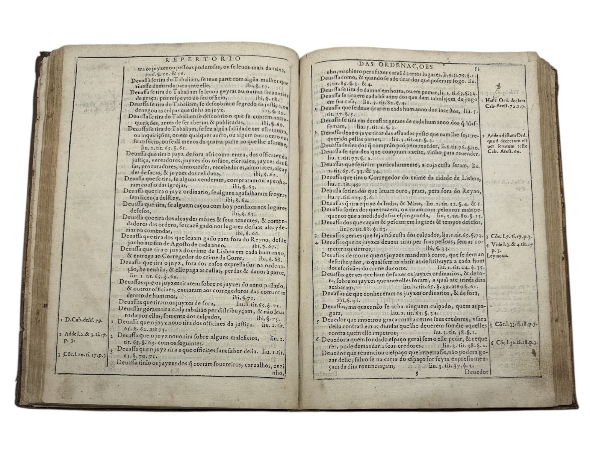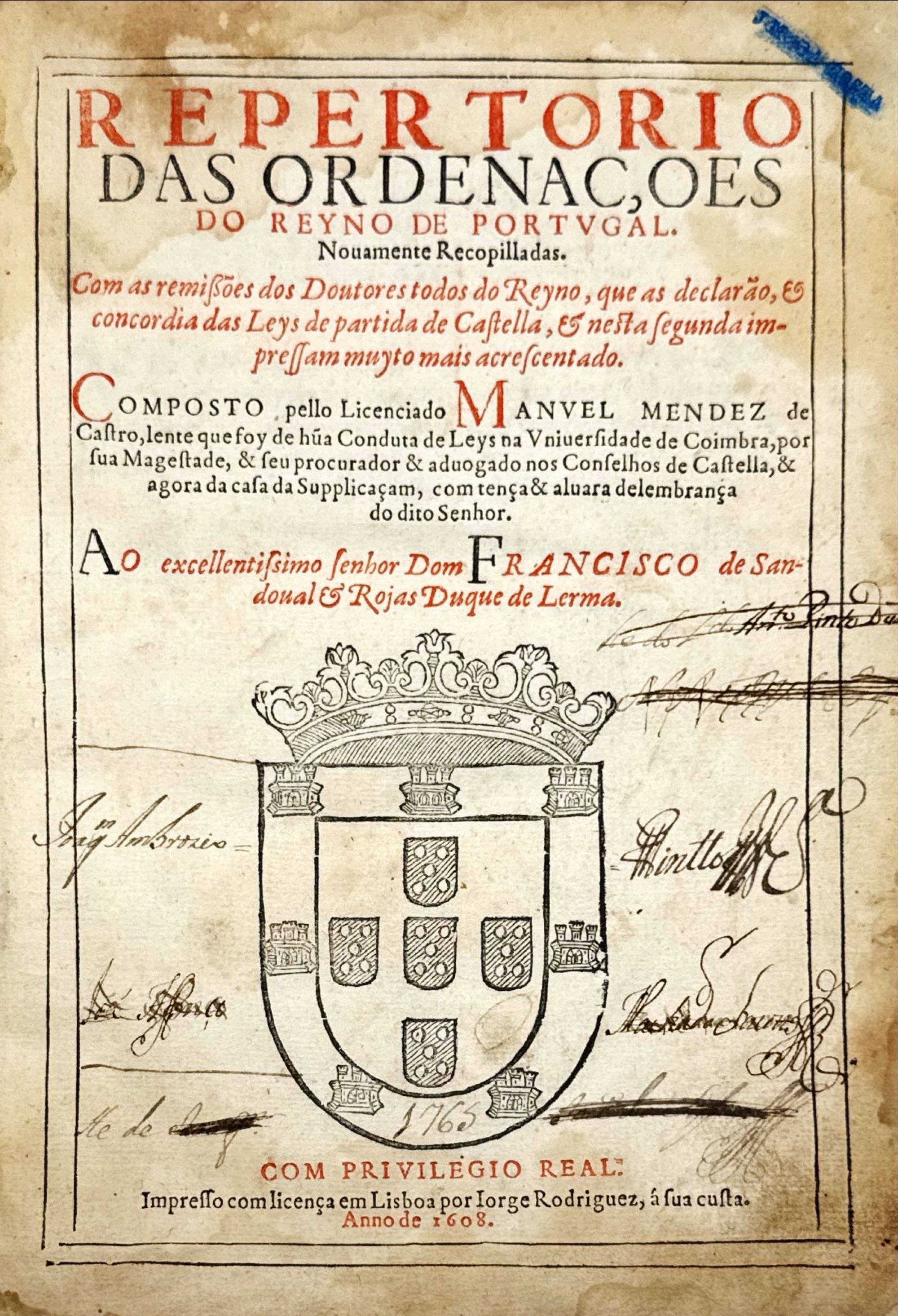 CASTRO, Manuel Mendes de. - REPERTORIO DAS ORDENAÇOES DO REYNO DE PORTUGAL. Nouamente Recopilladas. Com as remissões dos Doutores todos do Reyno, que as declarão, & concordia das Leys de partida de Castella, & nesta segunda impressam muyto mais accrescentado. (Brasão de armas do Reino de Portugal). Lisboa. Jorge Rodrigues. 1608. In-4º de [4], 162 Fls. In-4º Enc.