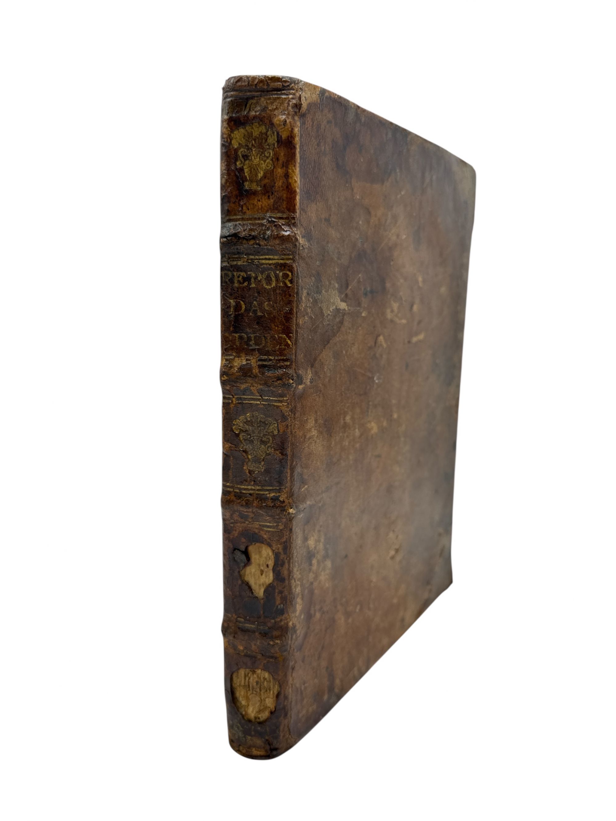 2ª edição. Muito rara. Frontispício impresso a negro e vermelho, com várias assinaturas manuscritas da época. Encadernação da época em carneira com defeitos.