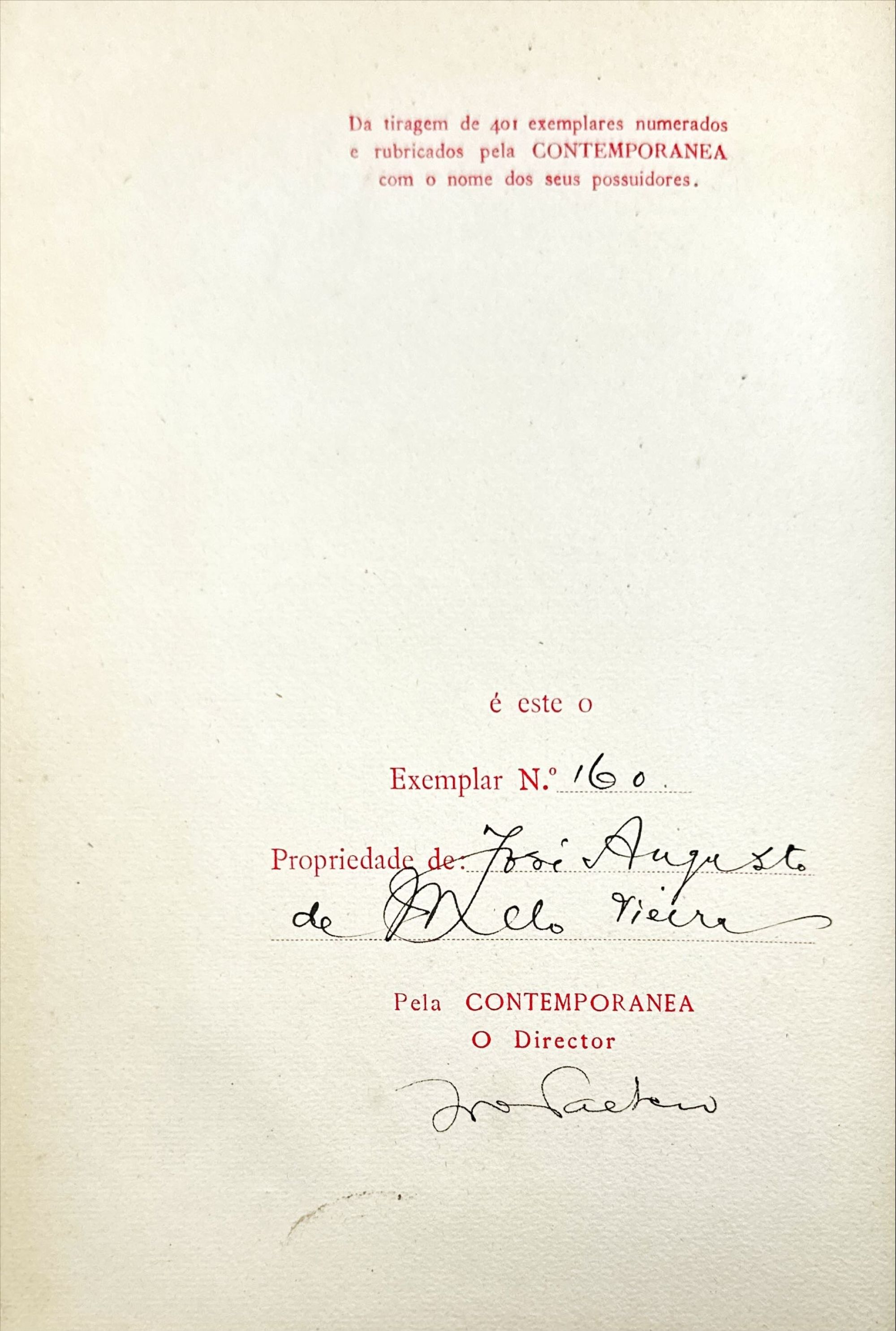 Coleção completa. Encerra colaboração literária e artística de: Fernando Pessoa, Almada Negreiros, Mário de Sá-Carneiro, Camilo Pessanha, António Botto, Raul Leal, José Régio, Teixeira de Pascoaes, Aquilino Ribeiro, A. Santa-Rita, Eugénio de Castro, Marinetti, Amadeu de Sousa Cardoso, Jorge Barradas, Mily Possoz, Stuart, Columbano Bordalo Pinheiro, António Carneiro, etc. Possui junto 2 postais de Boletim de inscrição para a revista. O primeiro número da tiragem de 401 números numerados e rubricados por José Pacheco e com o nome do proprietário, este com o nº16. Posteriormente em 2005 foi publicado o Nº14 realizado a partir de originais cedidos por José Augusto França e Carlos Ventura, atual proprietário, que os editou. Encadernações inteiras de pele. Conservam as capas de todos os números.