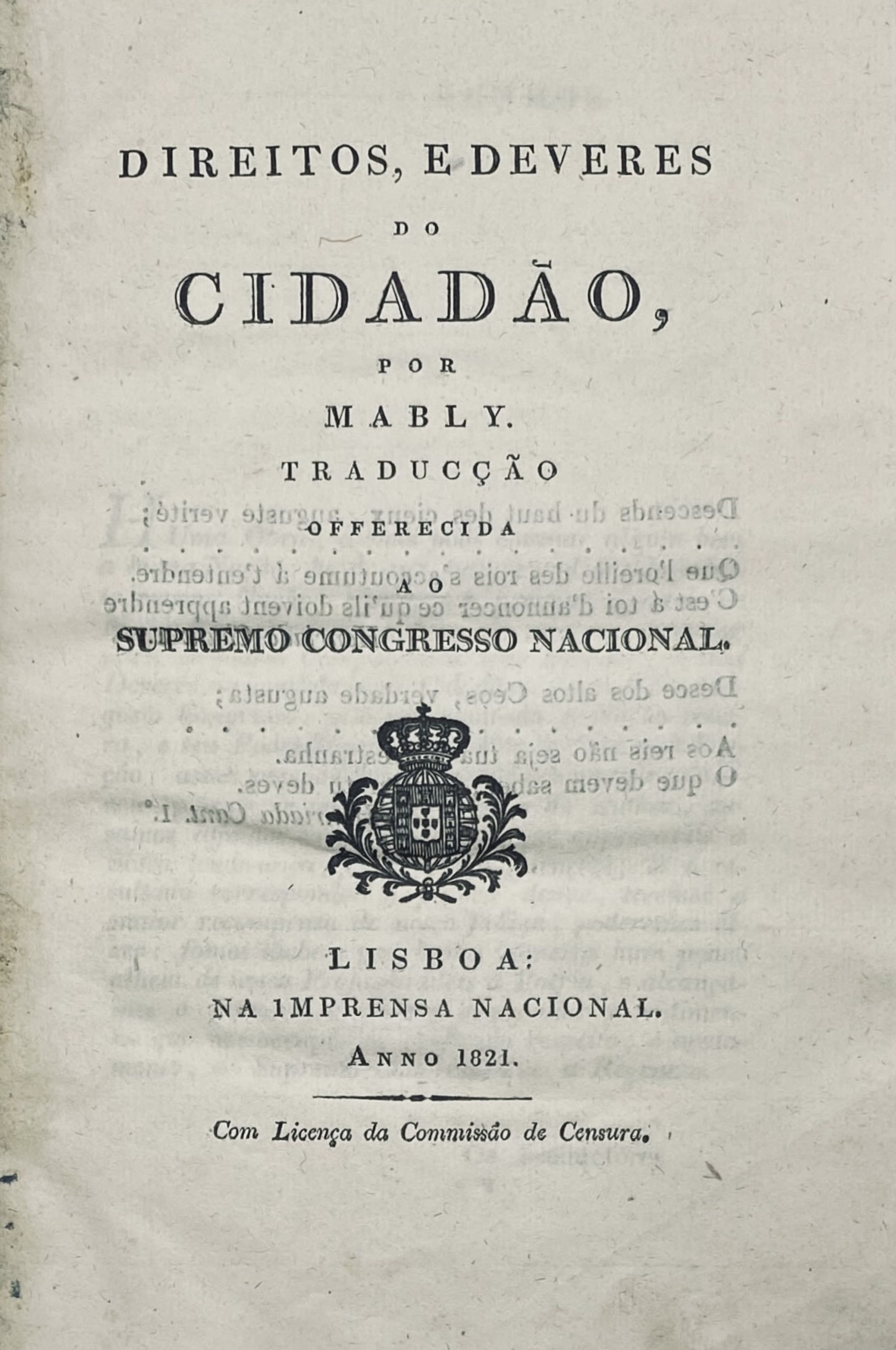 DIREITOS, E DEVERES DO CIDADÃO, por Mably. Traducção oferecida ao Supremo Congresso Nacional.