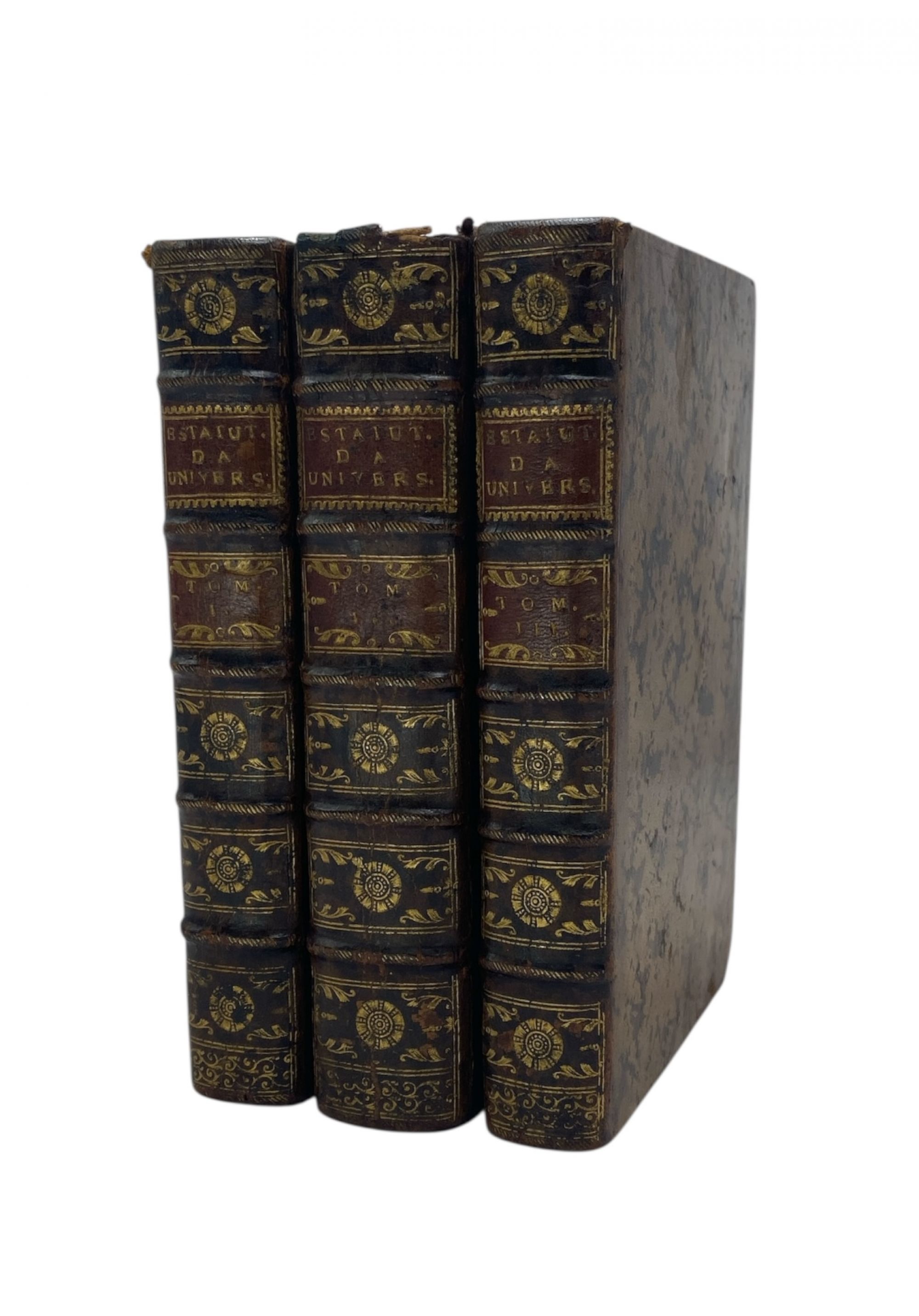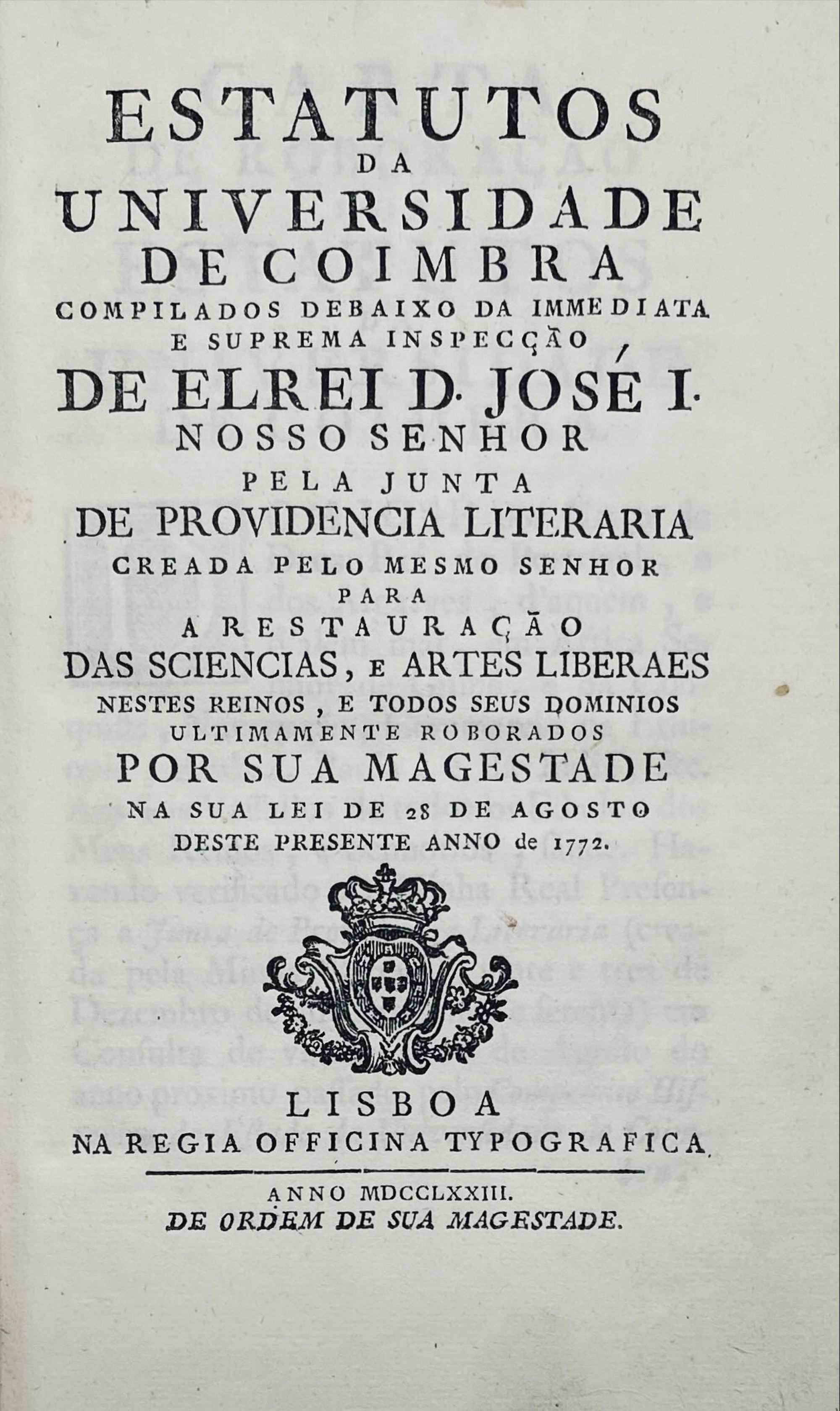 ESTATUTOS DA UNIVERSIDADE DE COIMBRA. Compilados debaixo da immediata e suprema inspecção de El Rei D. José I... Tomo I (ao III). Lisboa. Na Regia Officina Typografica, Lisboa 1773. In-8. 3 Vols. Encs.
