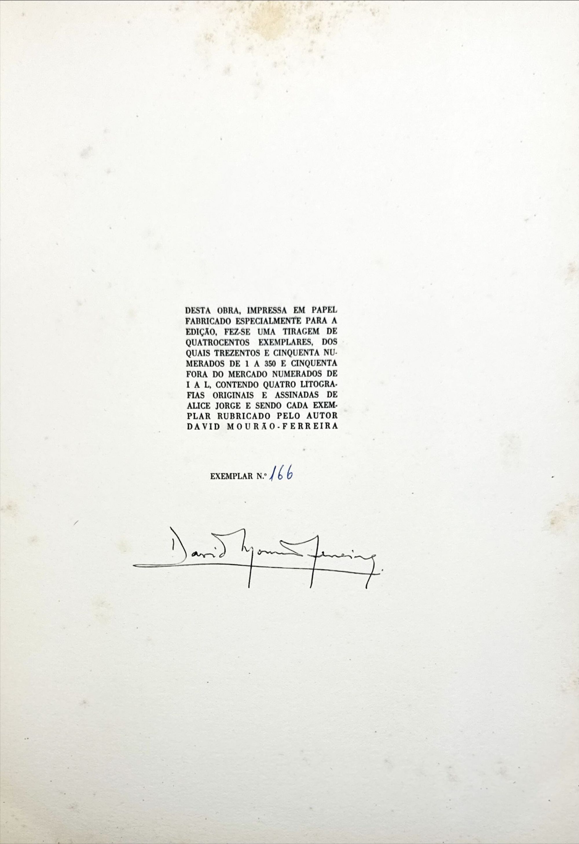 Primeira edição. Tiragem de 400 exemplares, numerados e assinados pelo autor. Ilustrada com 4 litografias assinadas pela artista. Com algumas manchas de acidez.